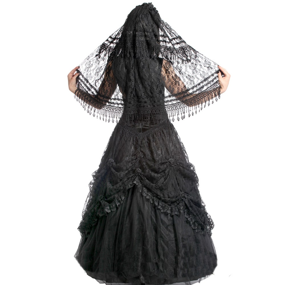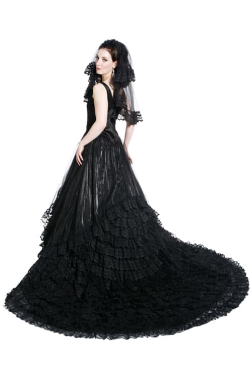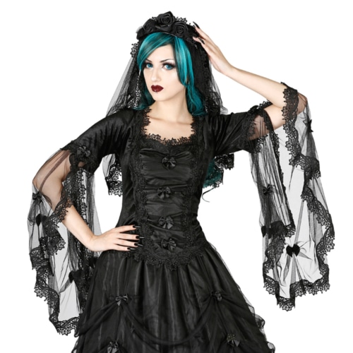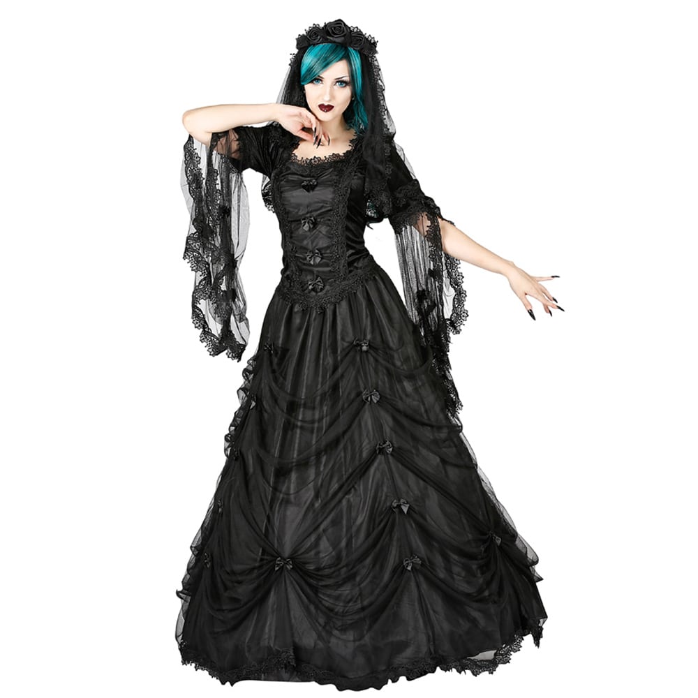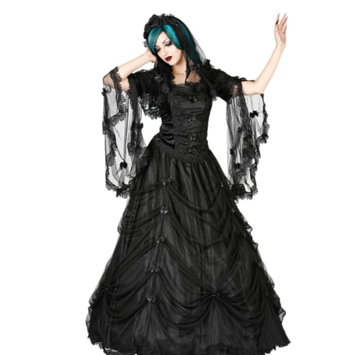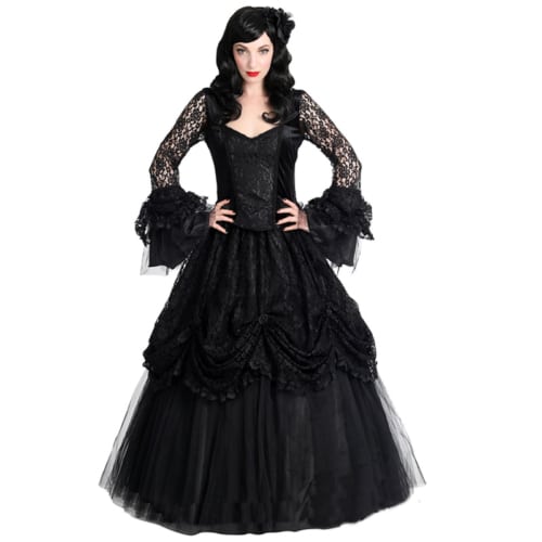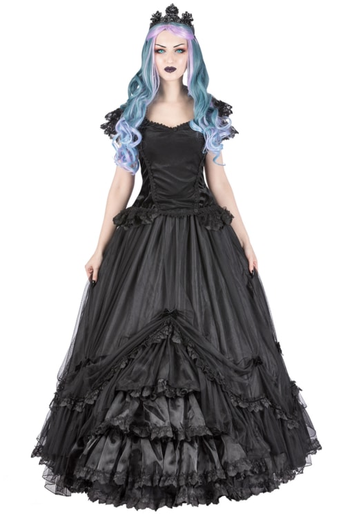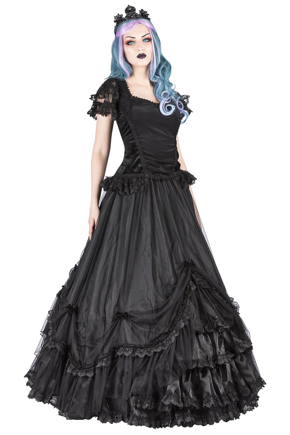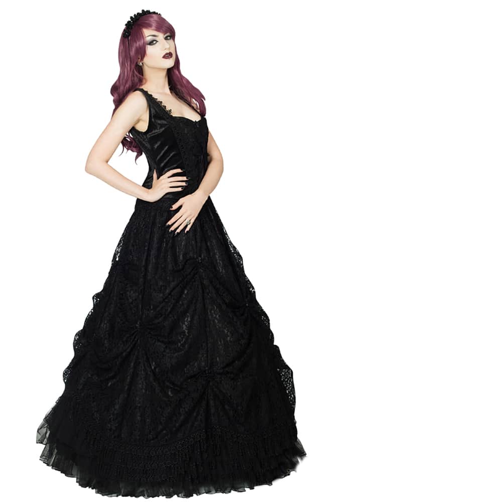 Klassischer, weit schwingender Gothic Rock aus Satin mit Tüll und gerafftem Spitzenoverlay. Verziert mit Rosen.
