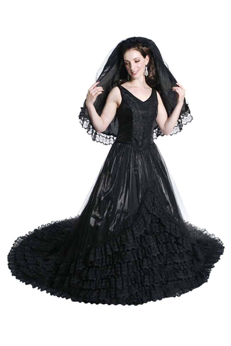 Das schwarze Samtmieder dieses Gothic-Hochzeitskleides hat vorne in der Mitte einen Einsatz aus schwarzem Taft, der mit schwarzem Netz überzogen ist und an den Seiten und Nähten reich mit schwarzer Spitze verziert ist. Der Rock hat eine riesige Schleppe aus schwarz schimmerndem Taft und ist mit 90 Yards schwarzer Spitzenrüschen bedeckt. Teilweise durch einen Mesh-Überrock bedeckt. Reißverschluss hinten in der Mitte. -