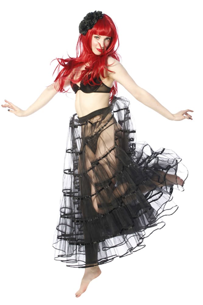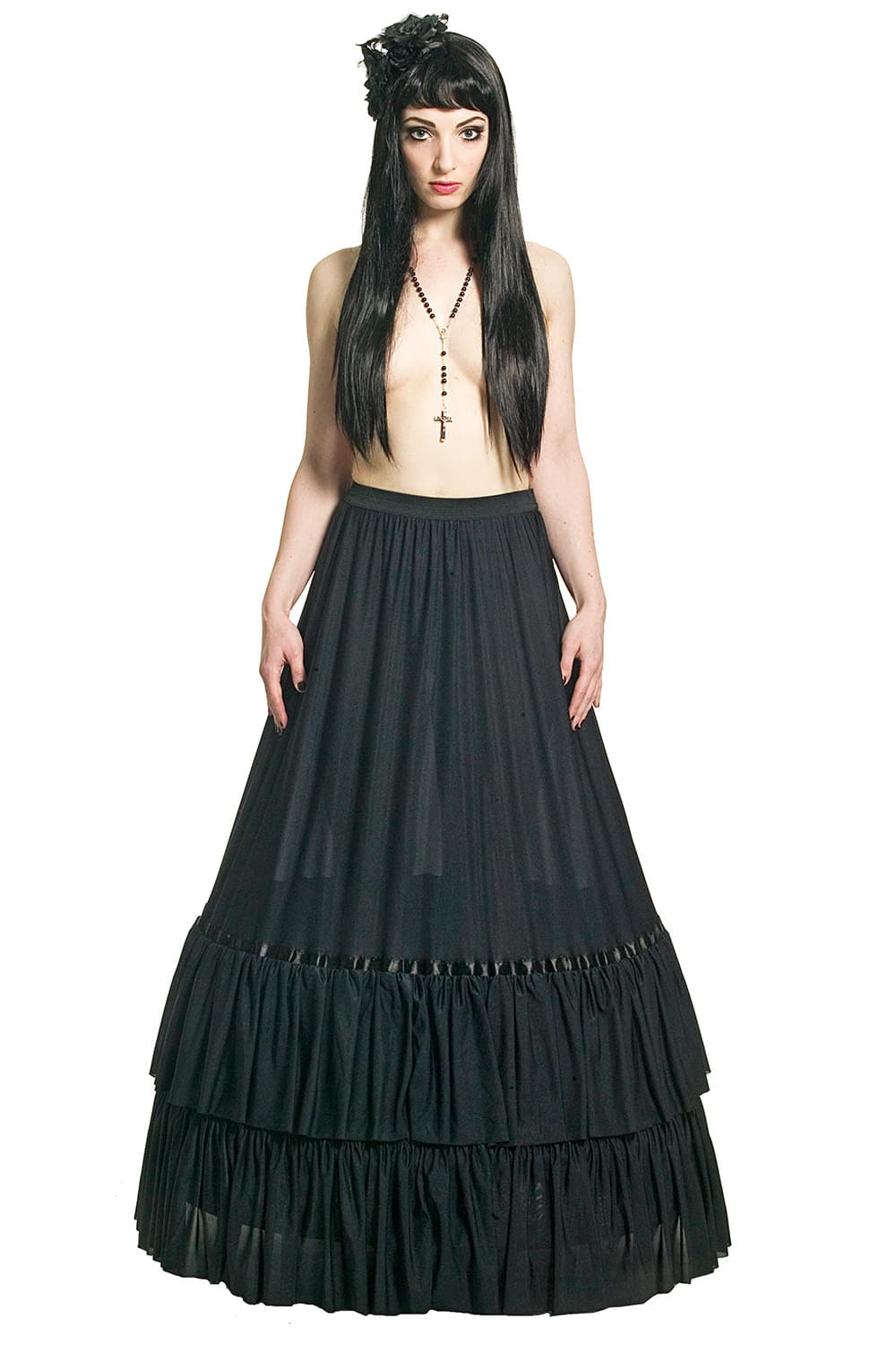 Ein düster romantischer Gothic-Traum aus Tüll, Spitze und Organza. Weit schwingender, bodenlanger Barock-Rock mit komfortablem Gummizugbund. Wunderbar mit Korsetts, Corsagen und unserem Top Belle Noir zu kombinieren. -