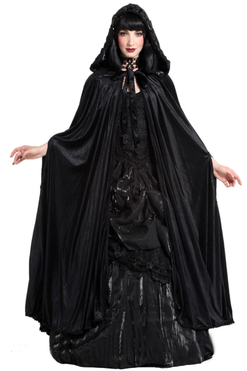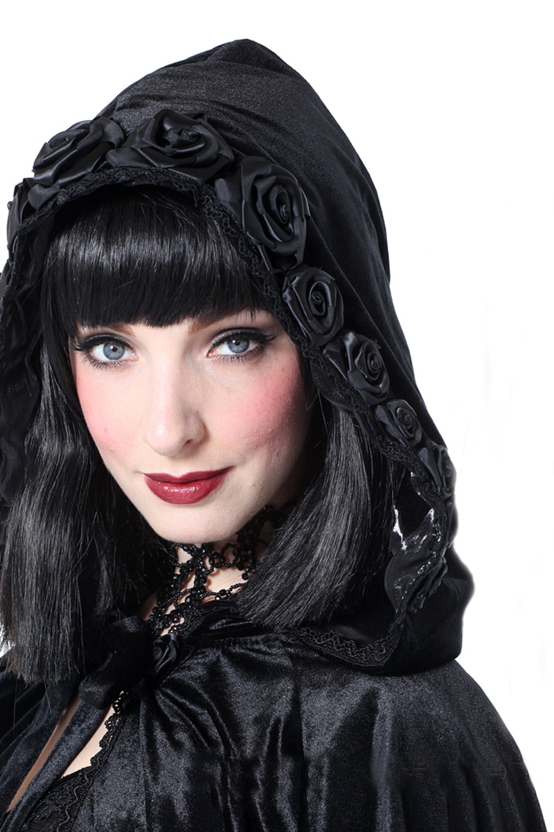 Weiter Samtumhang mit rosenbesetzter Kapuze. Weit schwingend geschnitten, mit dezenter, schwarzer Spitze verziert. Kapuze mit Organza gefüttert. Vampiristisch, gotisch und geheimnisvoll. -