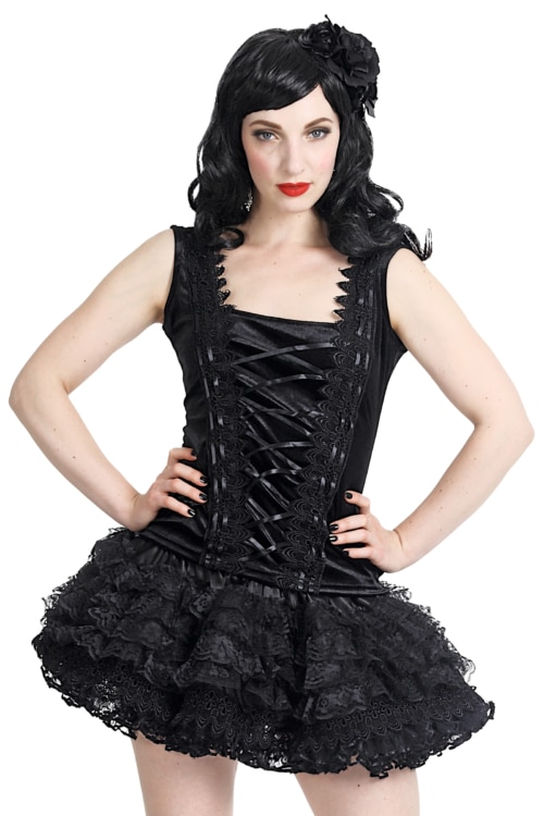 Mehrlagiger Romantic Goth Satinrock mit weichem, gerafften Netz-Overlay, verziert mit Satinschleifen. Traumhaft veredelt mit venezianischer Spitze. Weit schwingend geschnitten, mit bequemem Gummizugbund. Perfekt kombinierbar mit dem Gothic Rose Top 13381. -