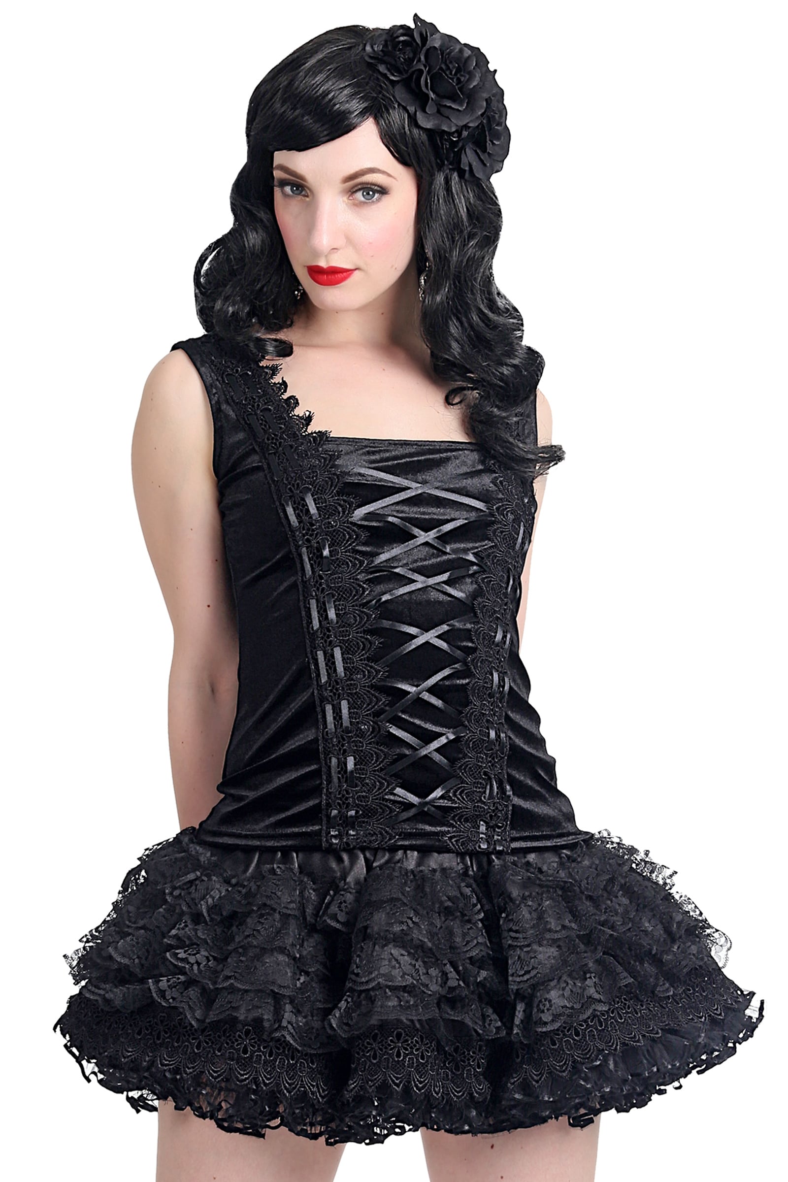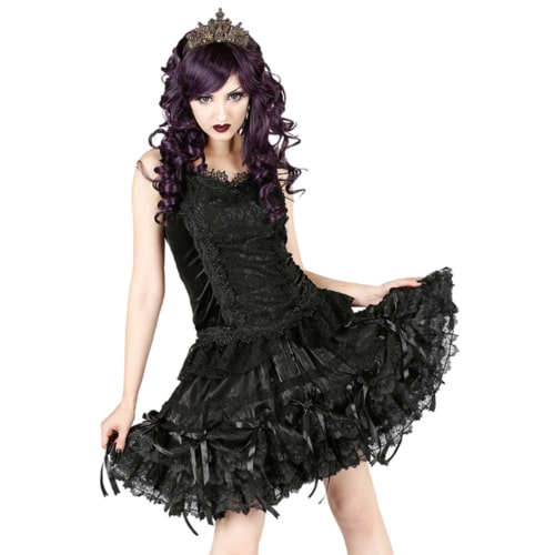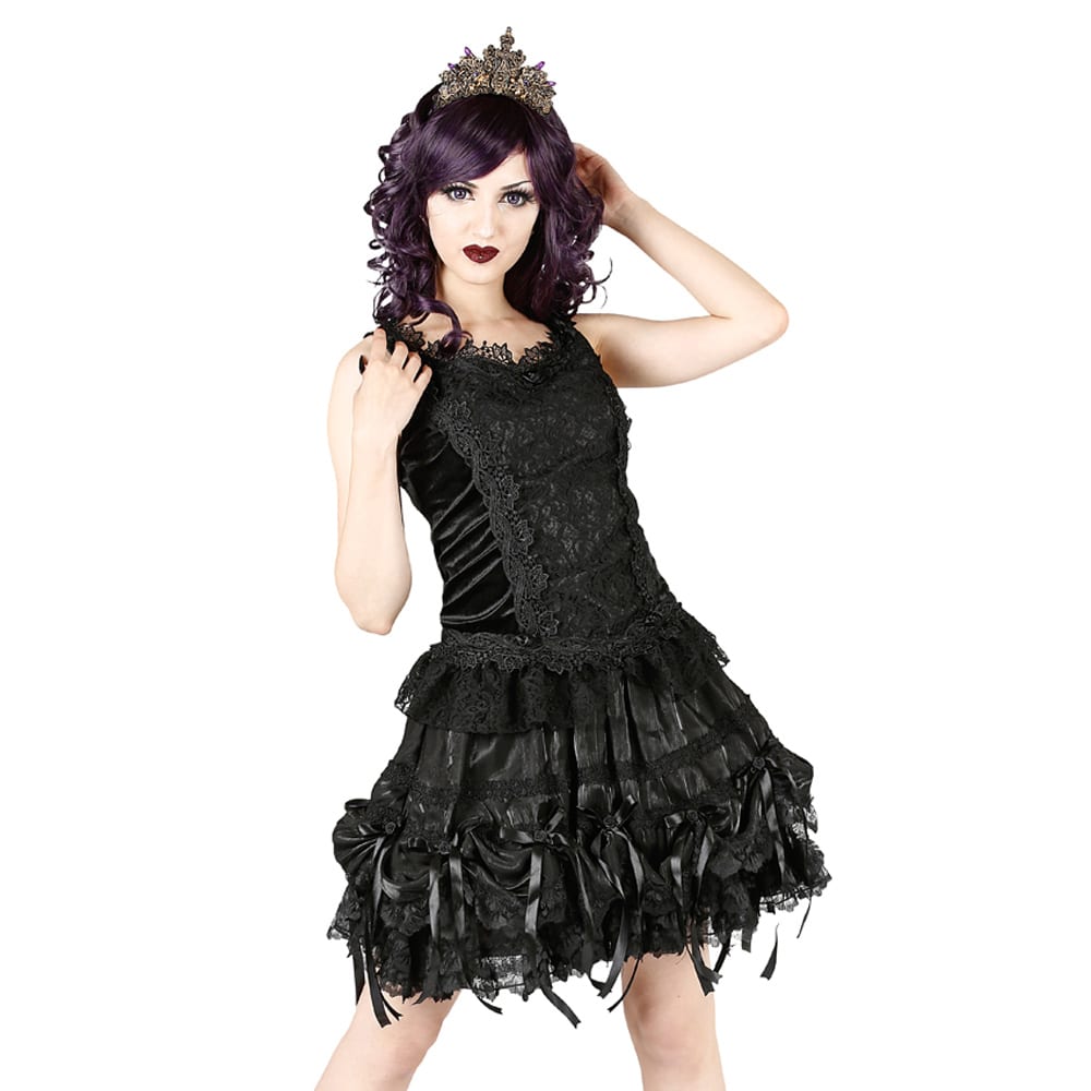 Kurzes Gothic Minikleid mit einem Rockteil aus Satin und Spitze mit gerafften Tüllbesatz, das Samtoberteil mit Spitzenoverlay ist verziert mit einer breiten Spitzenborte. Mit Puffärmeln aus Spitze, verziert mit kleinen Samtschleifen.