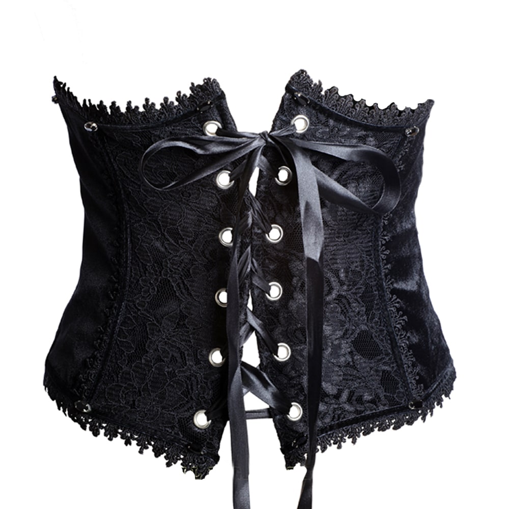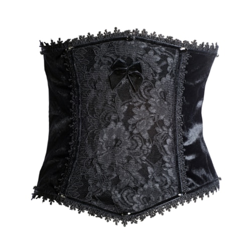 Leichtes Unterbrustkorsett aus schwarzem Samt mit Kunststoff-Stäbchen, Spitzenoverlay und Frontschnürung. Verziert mit schwarzer Spitze, Schmucksteinen und einer Samtschleife auf der Rückseite.