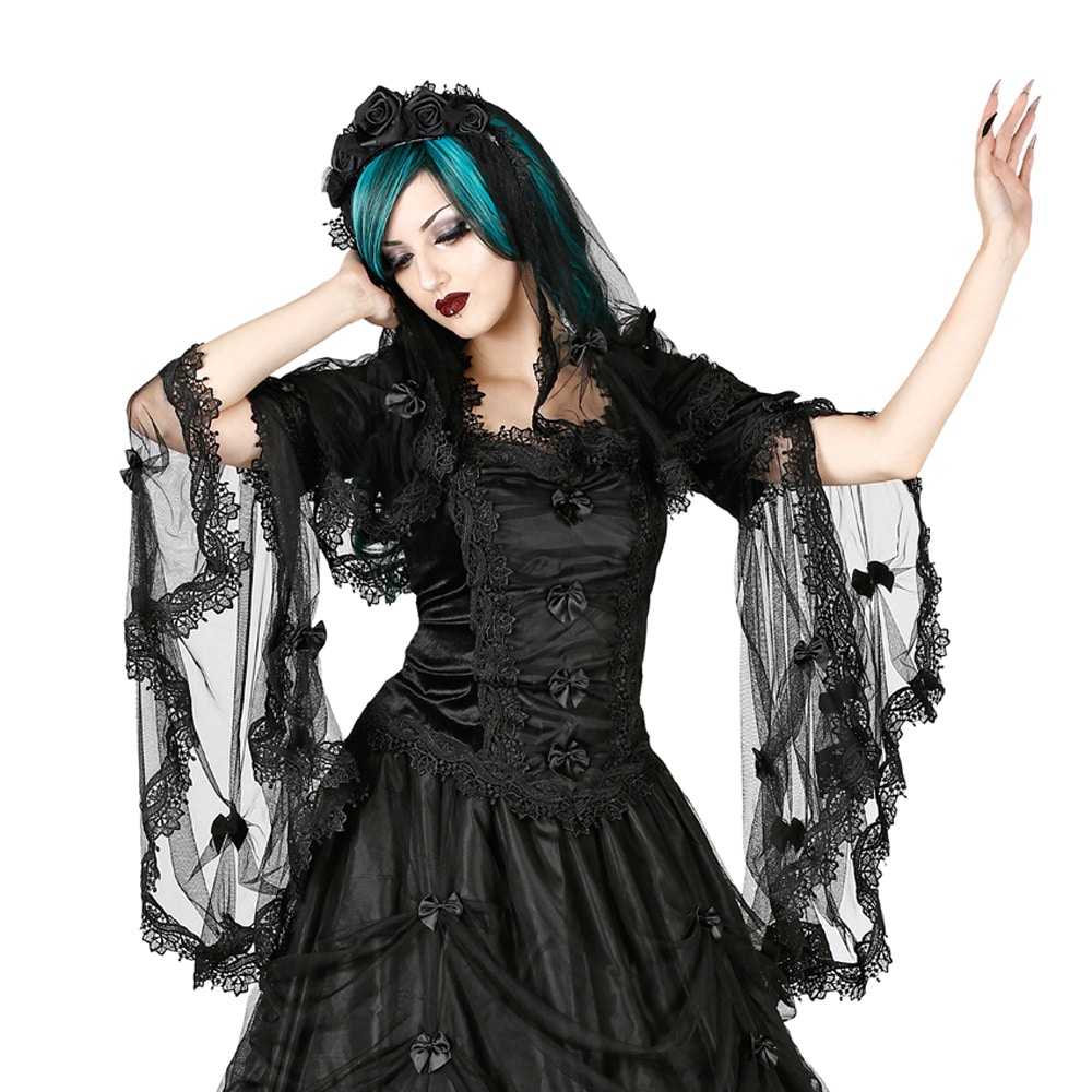 Elegantes, sehr edles Samtoberteil mit langen Netz-Trompetenärmeln. Leicht tailliert, aufwändig mit Bordüren und Satinschleifen verziert. Ein Traum zum WGT, Vampirball oder zur Gothic Hochzeit. -