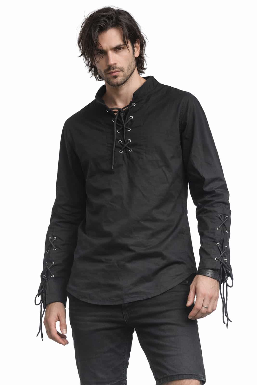 Schlicht, dunkel und mit klarer Haltung: Dieses Hemd verbindet klassische Mittelalter-Ästhetik mit modernem Gothic-Charakter. Die markante Schnürung am Kragen sowie an den Ärmeln sorgt für einen authentischen Look, während der leichte, fließende Stoff angenehm auf der Haut liegt. Perfekt für LARP, Festivals oder als stilvolles Basic für Deinen Darkwear-Alltag.