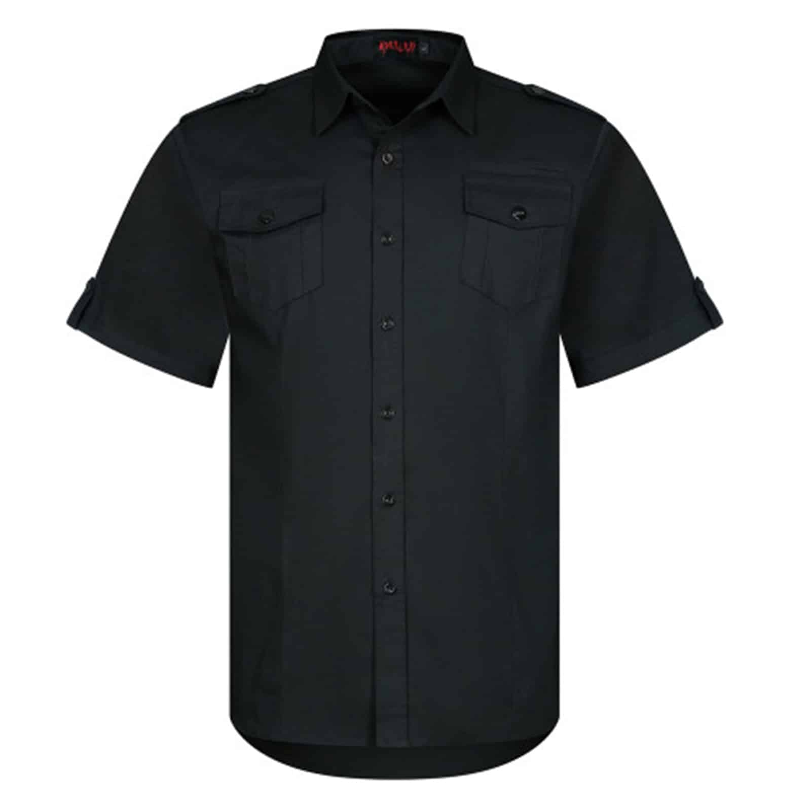 Dieses schwarze Military-Kurzarmhemd verbindet klare Linien mit funktionalem Design und hochwertiger Verarbeitung. Die Baumwollmischung mit leichtem Stretchanteil sorgt für hohen Tragekomfort, eine saubere Passform und angenehme Bewegungsfreiheit – ideal für Alltag, Job oder Szene-Looks.