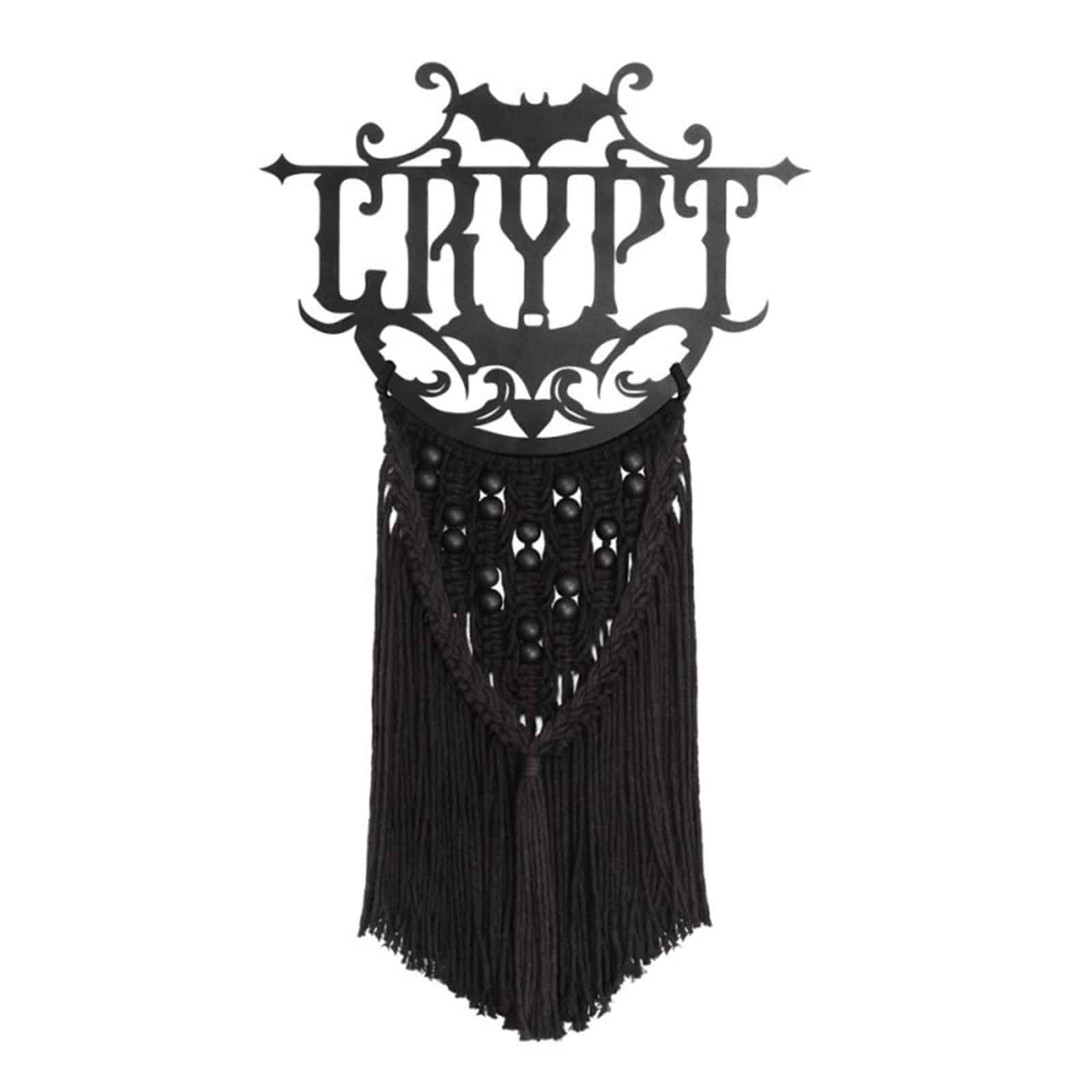 Dieser handgefertigte Macrame-Wandbehang bringt die stille Ehrfurcht alter Gemäuer und die geheimnisvolle Aura vergessener Orte in dein Zuhause. Im Mittelpunkt steht der kunstvoll gestaltete Schriftzug „Crypt“, flankiert von Fledermäusen und ornamentalen Schwüngen, die an uralte Symbole und geflüsterte Ahnengebete erinnern. Die Kombination aus dunkler Metalloptik, tiefschwarzen Kordeln und strukturierten Knüpfungen schafft eine kraftvolle, atmosphärische Wirkung und macht dieses Stück zu einem eindrucksvollen Blickfang. Ideal für Gothic-Interieurs, spirituelle Räume oder als Statement-Dekoration für alle, die sich von dunkler Mystik und okkulter Symbolik angezogen fühlen.