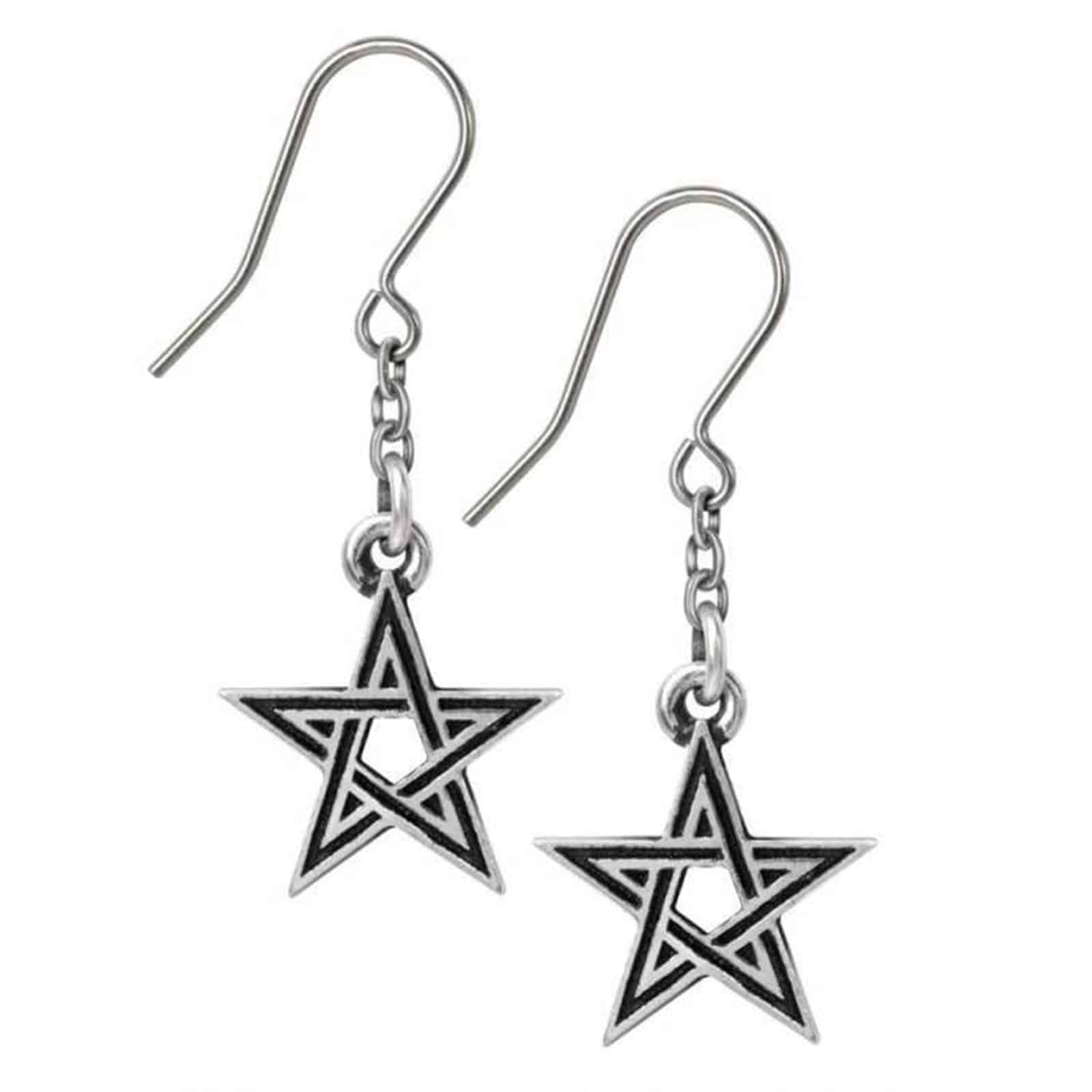 Kleine, schwarz emaillierte Zinn-Pentagramm Ohrringe an einer feinen Kette und Edelstahl-Ohrhaken.