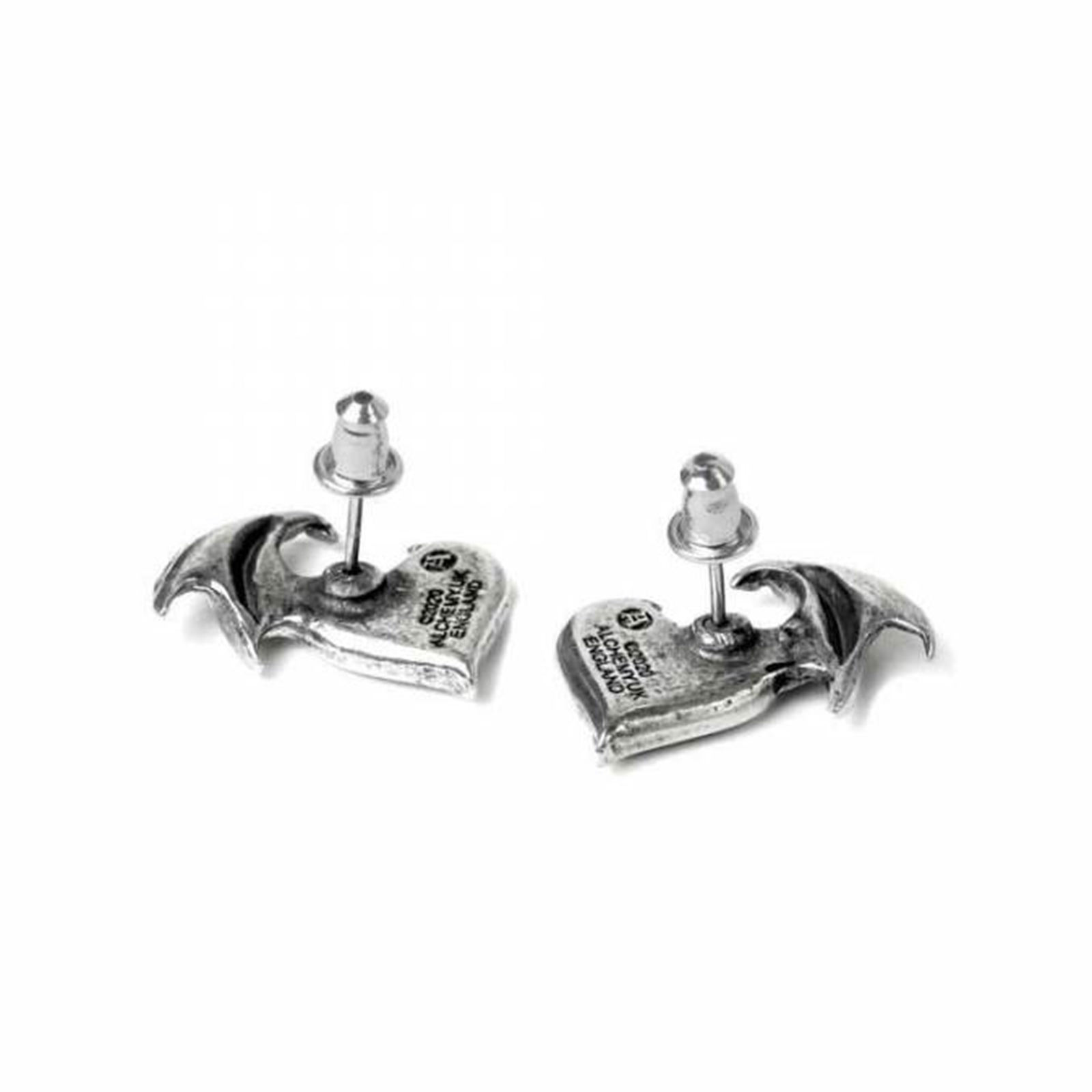 Ein Paar Ohrstecker aus Zinn in Form eines Dämonenherzens mit Fledermausflügeln und schwarzer Emaille. Die Ohrbügeln sind aus Chirurgenstahl.