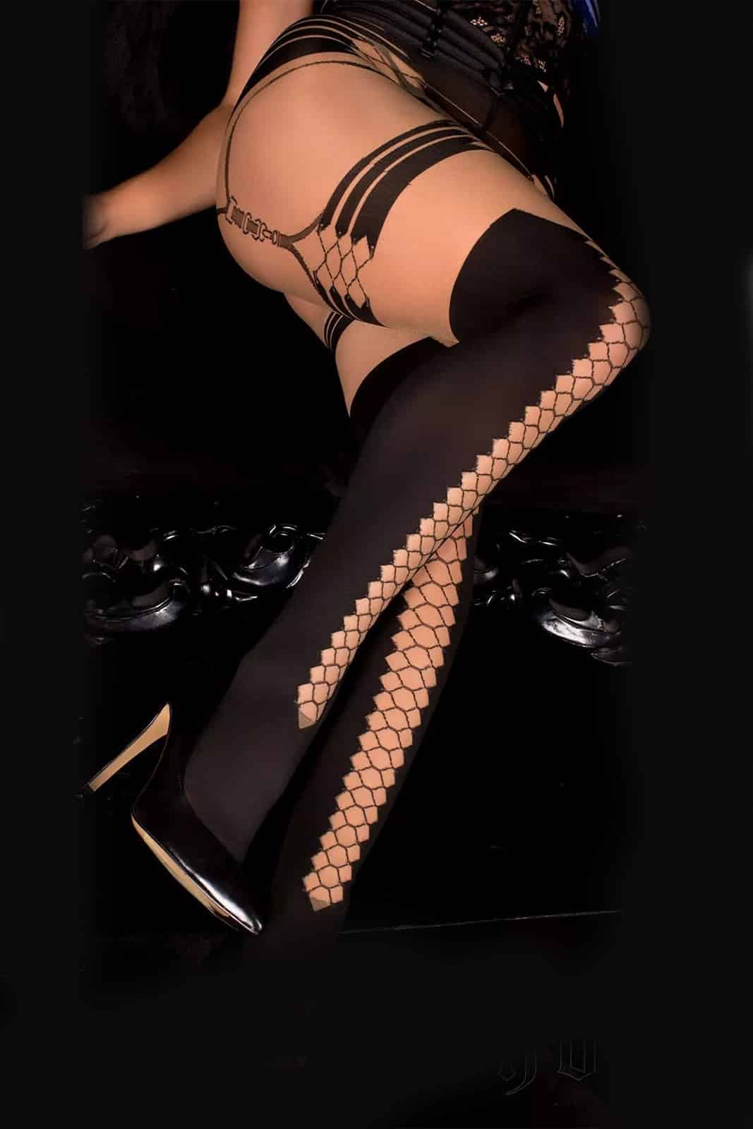 Hochwertige, schöne Strumpfhose mit einem schwarzen Overknee-Schnürstrumpf-Illusion-Print mit Strumpfhaltern.