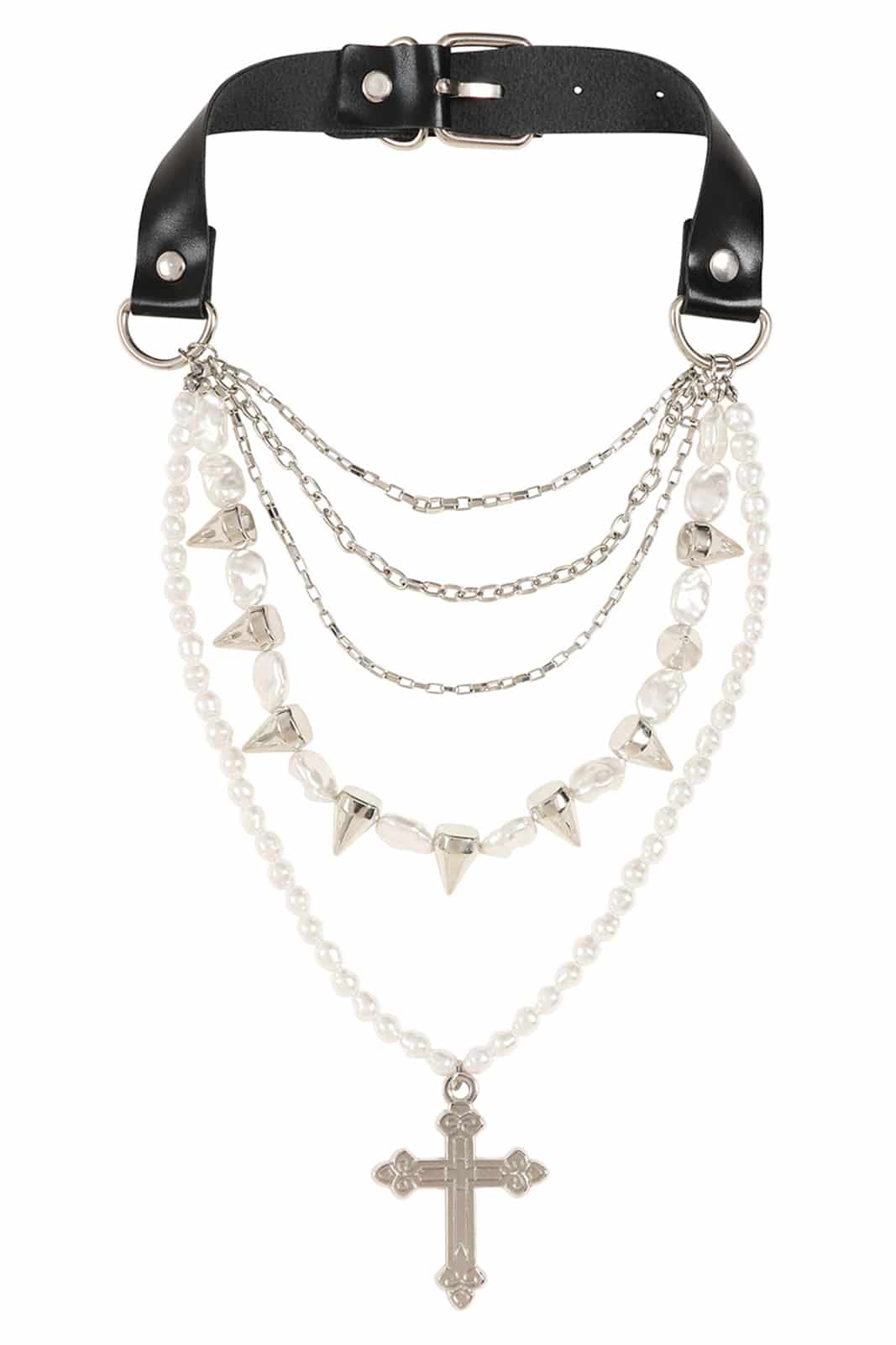 Eleganz trifft auf Härte: Der Divine Edge Choker vereint Perlen, Spikes und Ketten zu einem ausdrucksstarken Statement. Das Kreuz-Detail rundet den Look mit einer dunklen, stilvollen Symbolik ab – perfekt für alle, die Kontraste lieben.