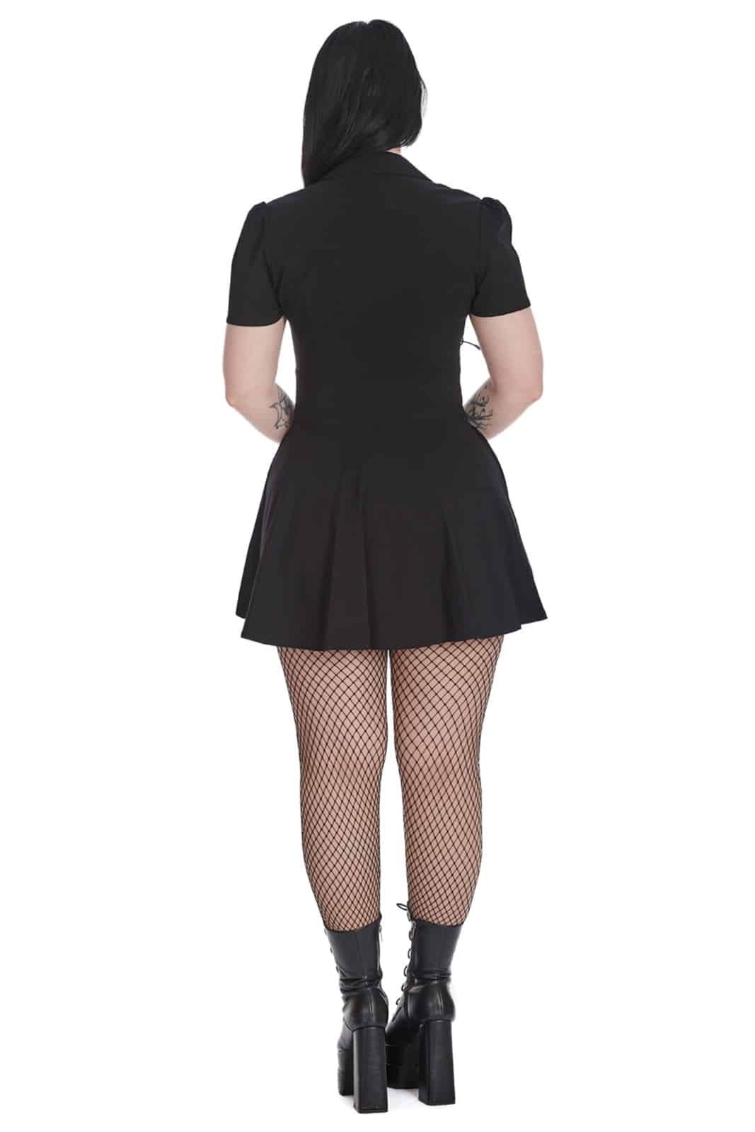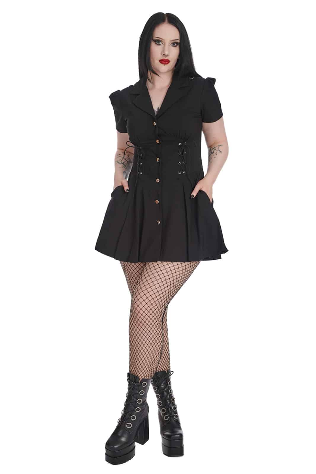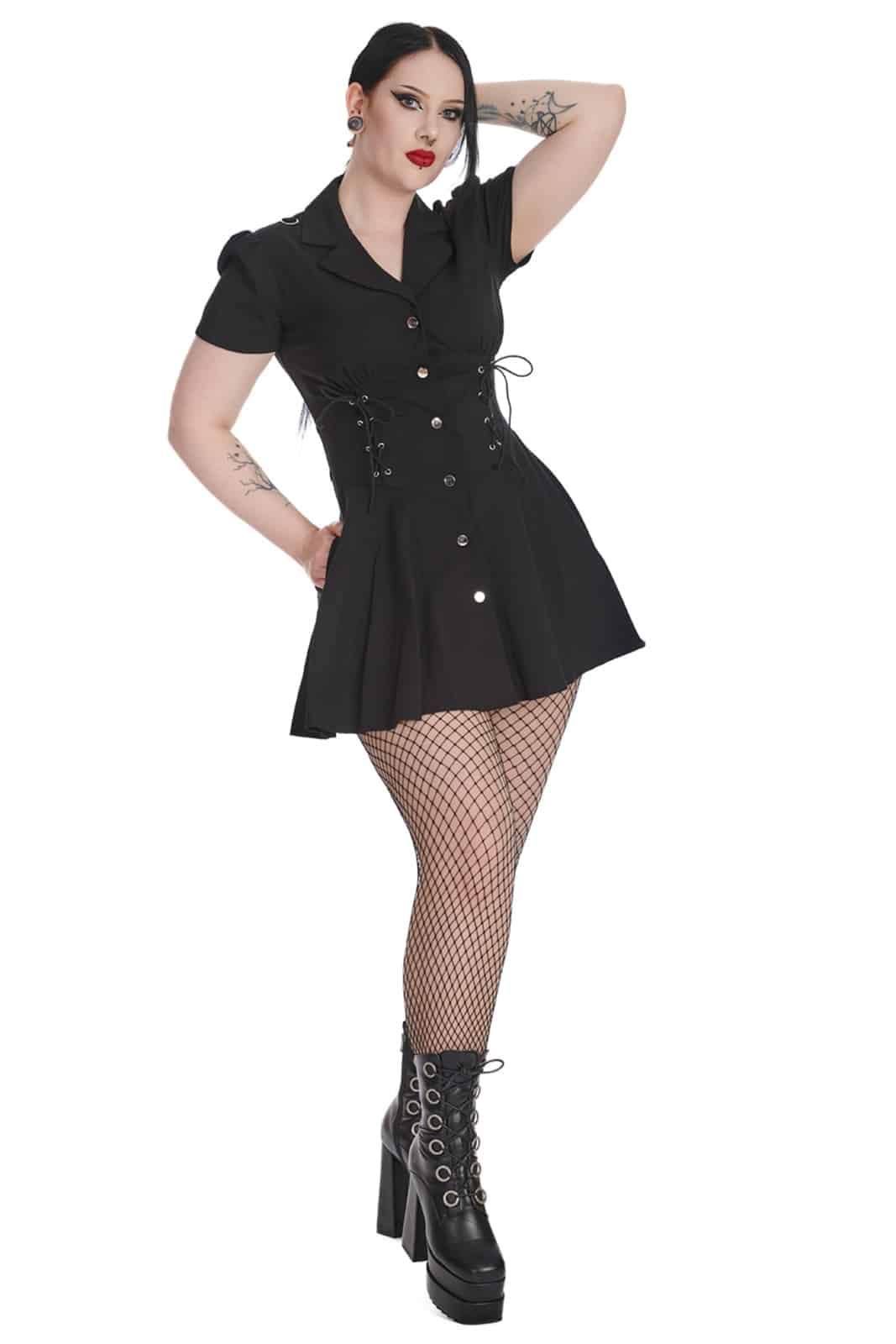Feminin, düster und mit subtiler Rebellion – das Black Dreamscape Kleid von Banned verbindet eine schmeichelnde Silhouette mit raffinierten Details. Die taillierte Form mit seitlicher Schnürung betont die Figur, während der leicht ausgestellte Rock für Bewegung sorgt. Ein vielseitiges Statement-Piece für Gothic- und Alternative-Looks.