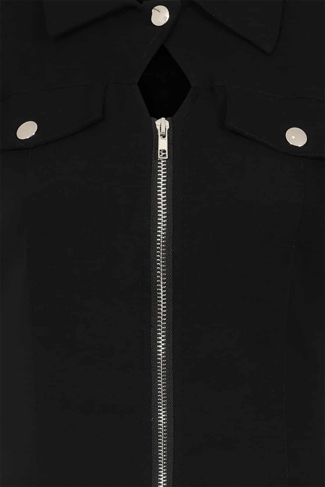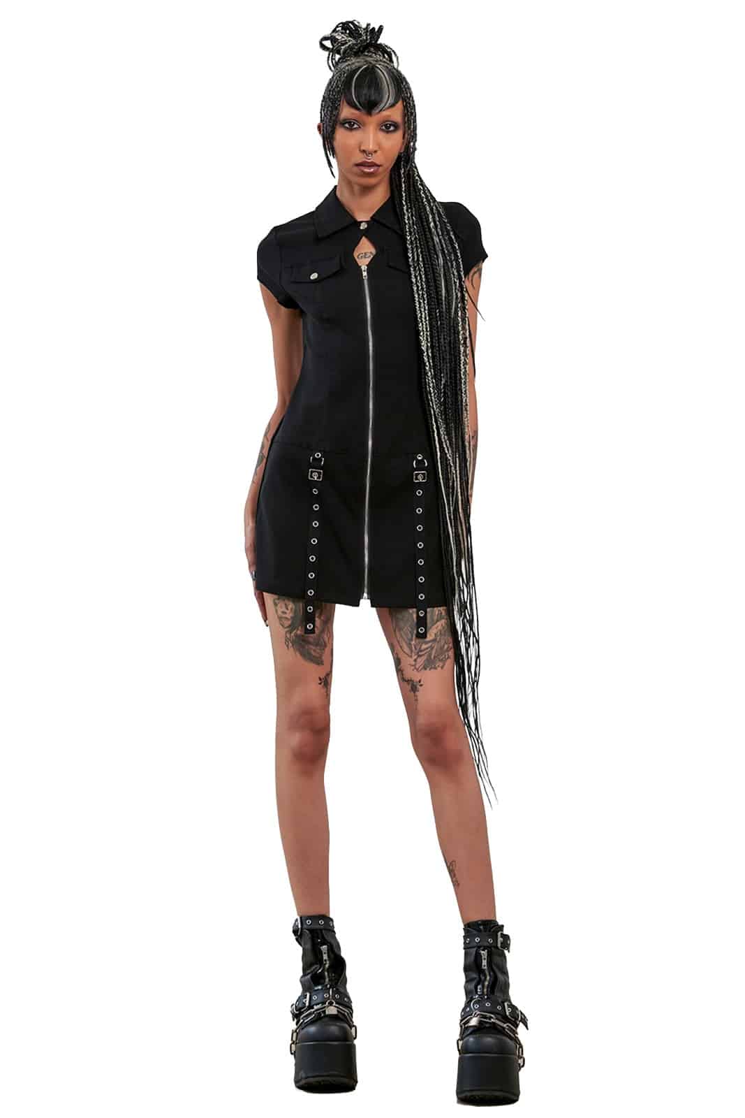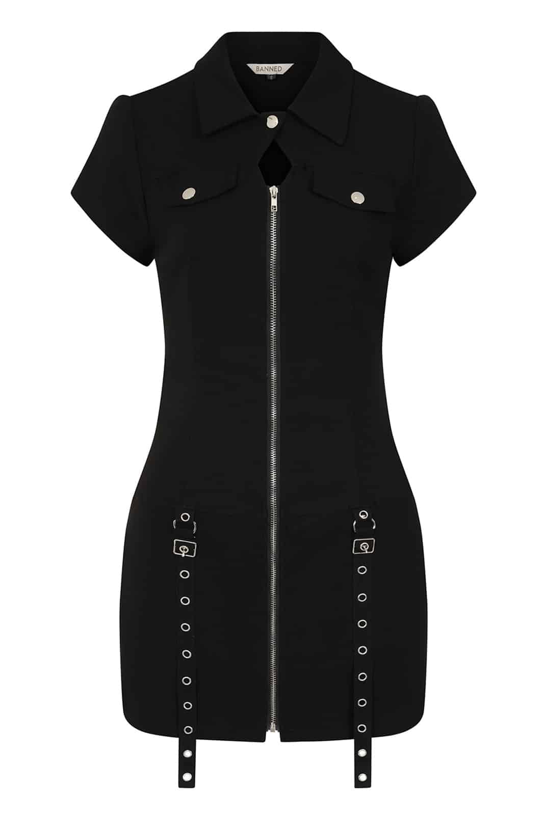 Klar geschnitten, kompromisslos und mit Industrial-Attitude – das Night Zip Kleid von Banned vereint eine figurbetonte Silhouette mit markanten Utility-Details. Der durchgehende Frontreißverschluss mit O-Ring setzt ein starkes Statement, während Ösen- und Schnallenelemente an der Hüfte dem Look eine rebellische Note verleihen.