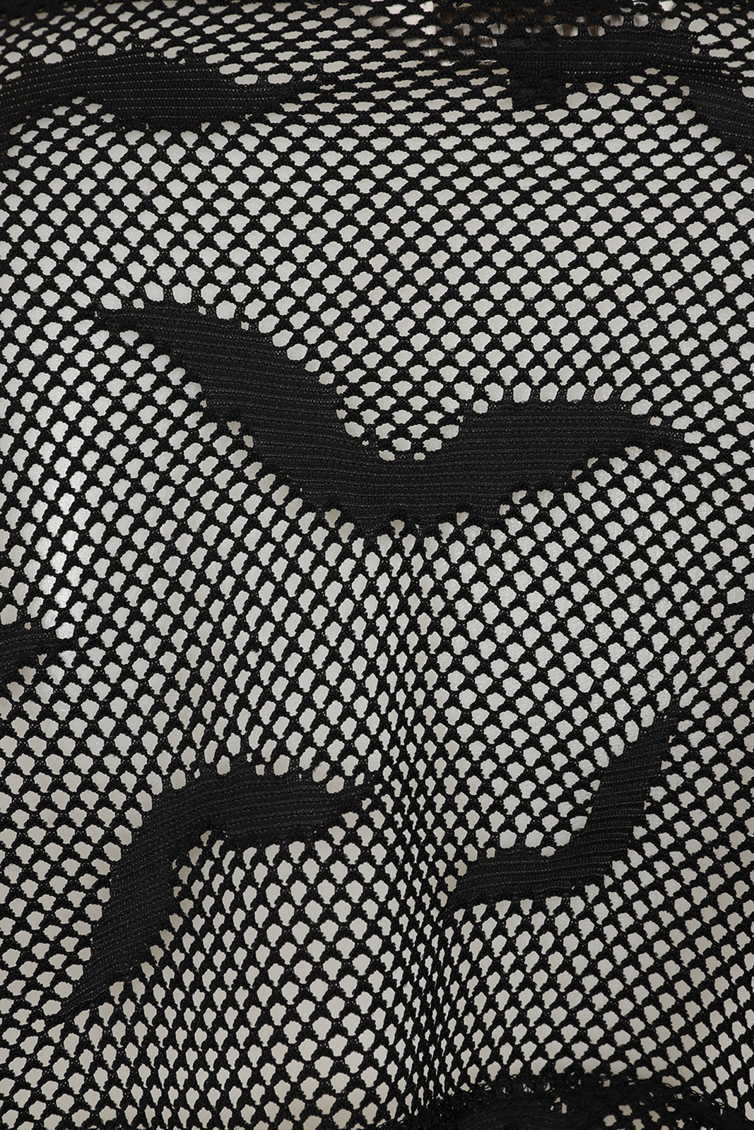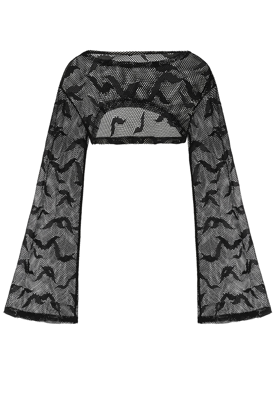 Schwarzer Gothic-Langarmshirt im Crop-Style aus feinmaschigem Mesh mit Fledermausmotiven. Das transparente Top hat einen Rundhalsausschnitt und lange, ausgestellte Ärmel. Es ist bauchfrei geschnitten und ähnelt einem Bolero. Das elastische Material passt sich perfekt der Körperkontur an.