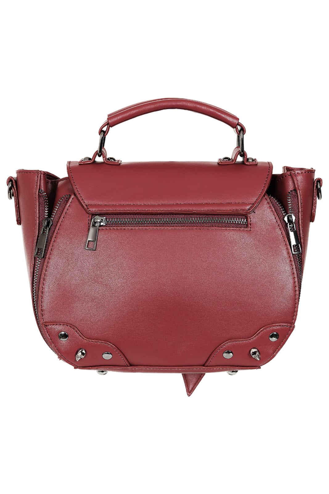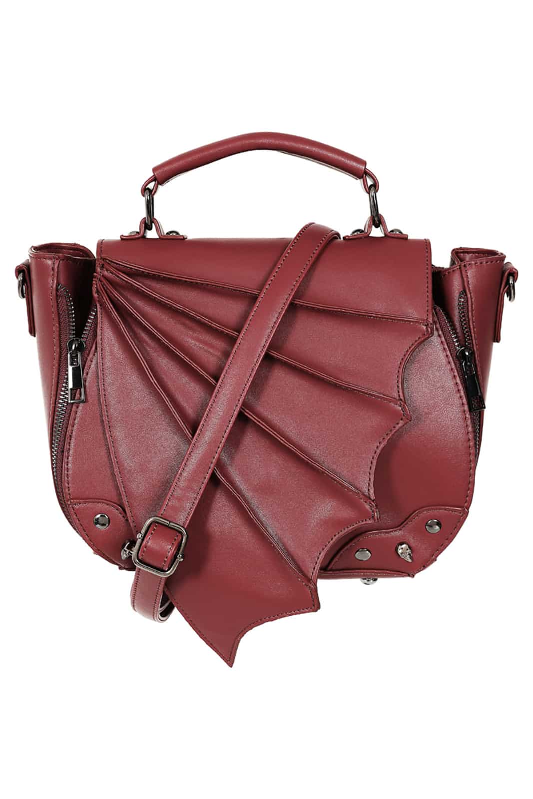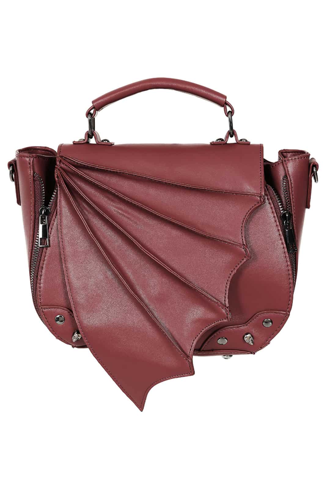 Gothic Tasche aus Kunstleder mit Tragegriff und Verschlußlasche in Form eines Fledermausflügels. Verziert mit Skull-Nieten. Ausgestattet mit drei Innen- und einer Außentasche und abnehmbarem Trageriemen. Das Taschenvolumen ist durch Reißverschlüsse erweiterbar.
