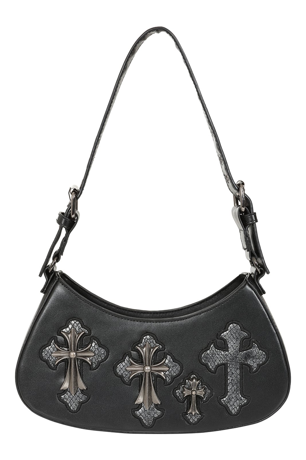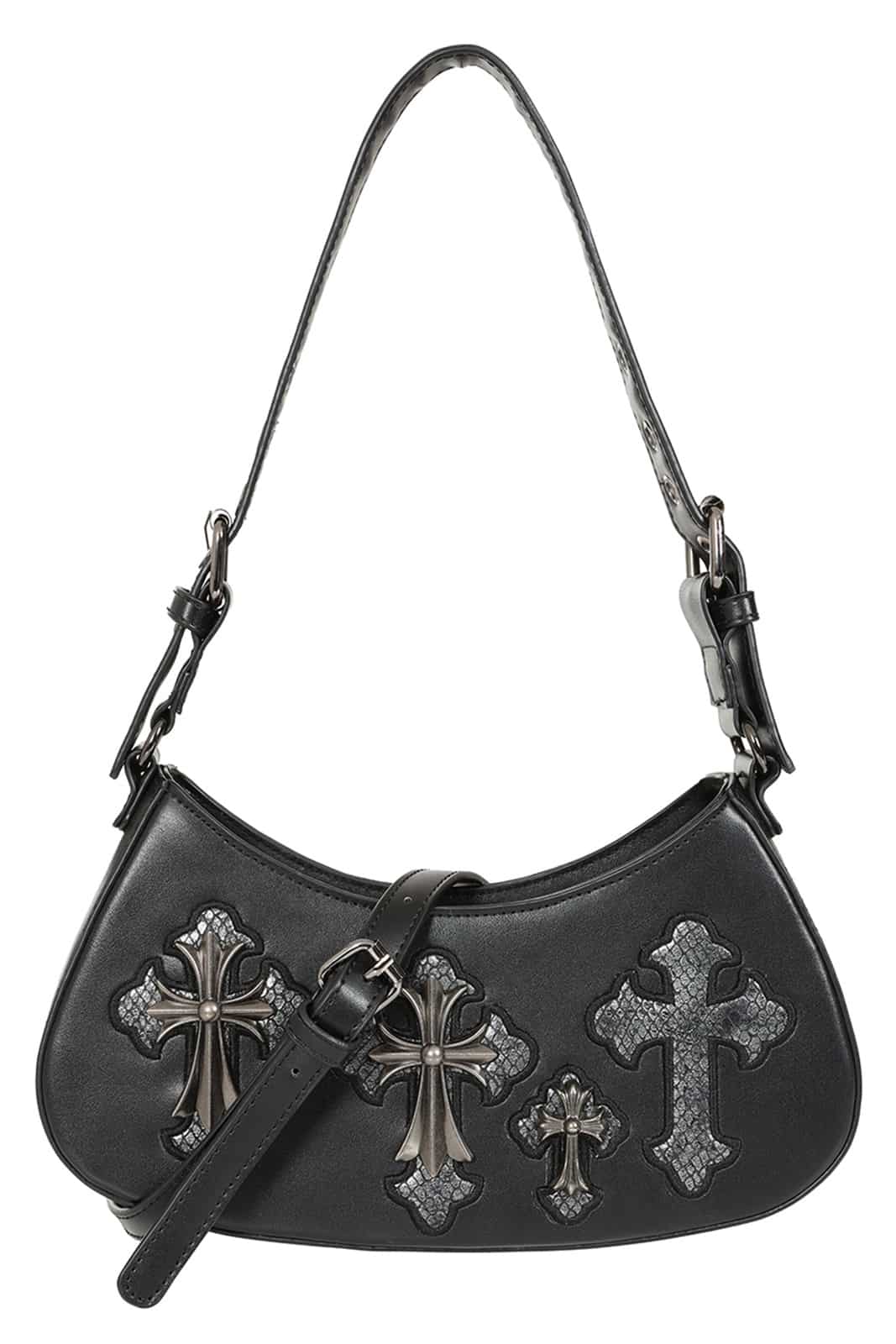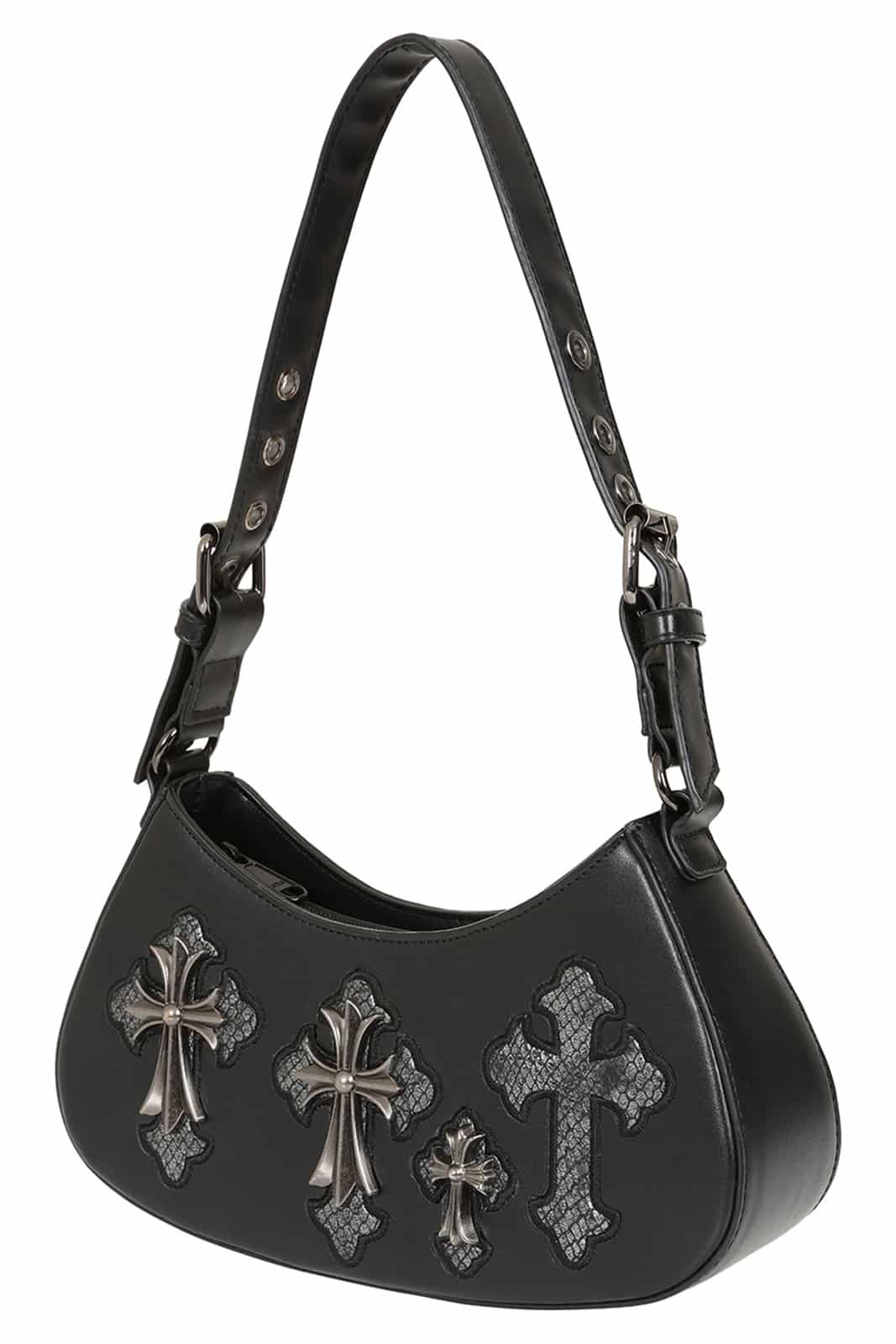 Dunkle Symbolik trifft auf ausdrucksstarkes Design: Die Crypt Cross Tasche vereint mystische Details mit klarer Form und verleiht deinem Look eine geheimnisvolle, kraftvolle Ausstrahlung. Ornamente, Kreuz-Elemente und ein markantes Fledermaus-Pentagramm machen sie zu einem echten Statement für jeden Gothic-Style.