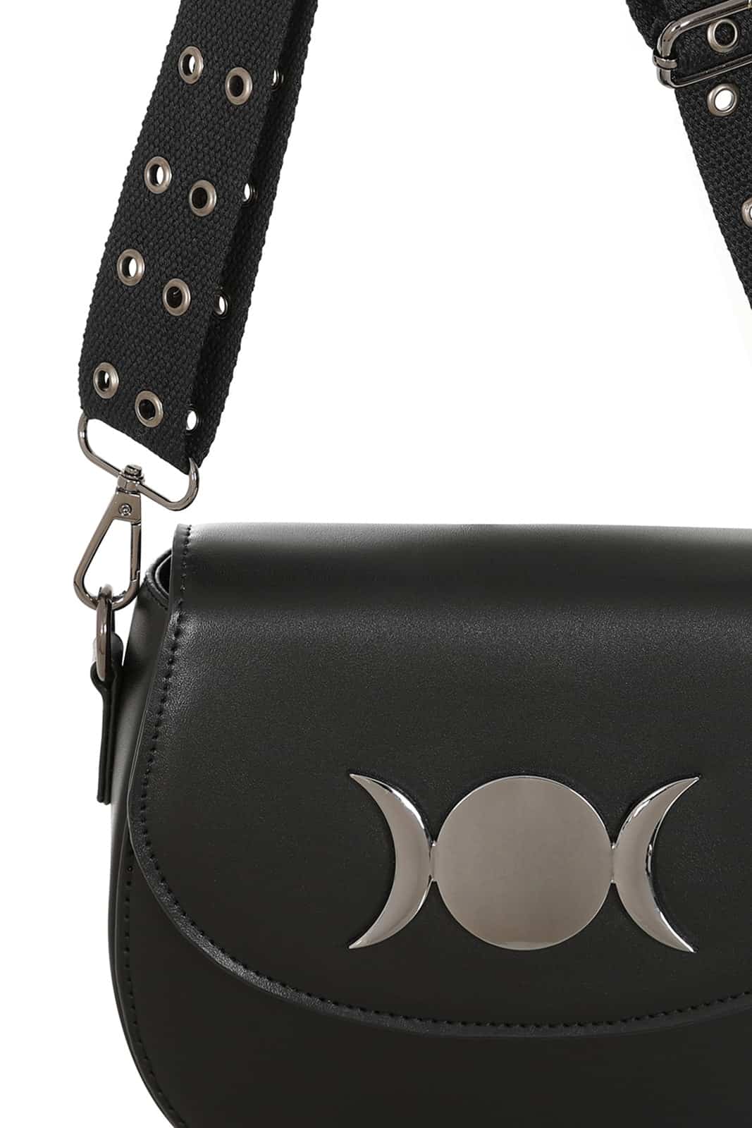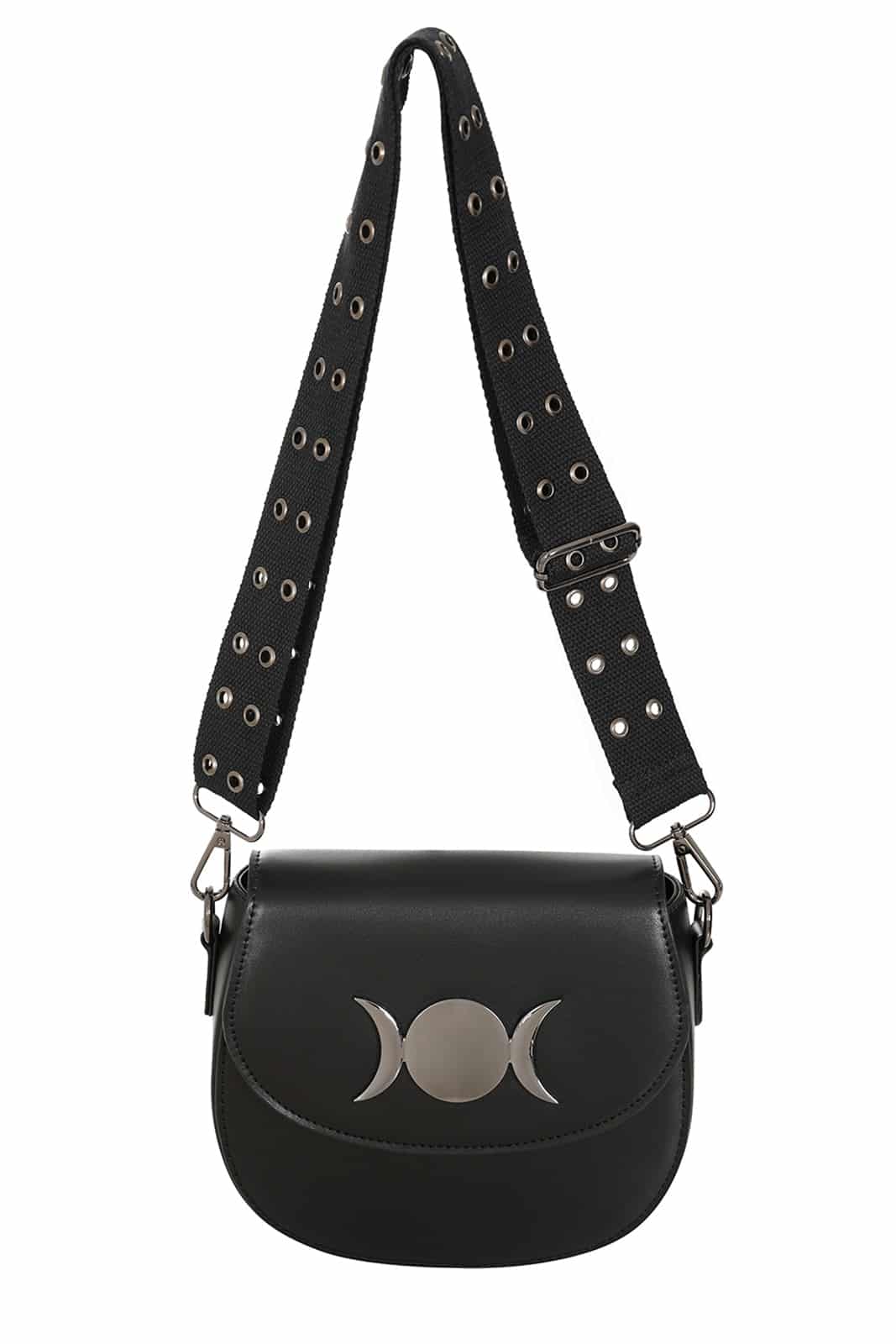 Diese Crossbody-Tasche von Banned verbindet klare Formen mit einem mystischen Gothic-Akzent. Das Highlight ist das elegante Mondphasen-Ornament auf der Vorderseite, das der Tasche einen himmlischen Charme verleiht. Der breite Trageriemen mit markanten Ösen sorgt nicht nur für einen edgy Look, sondern auch für angenehmen Tragekomfort. Eine kompakte Tasche, die Stil und Funktionalität perfekt vereint.