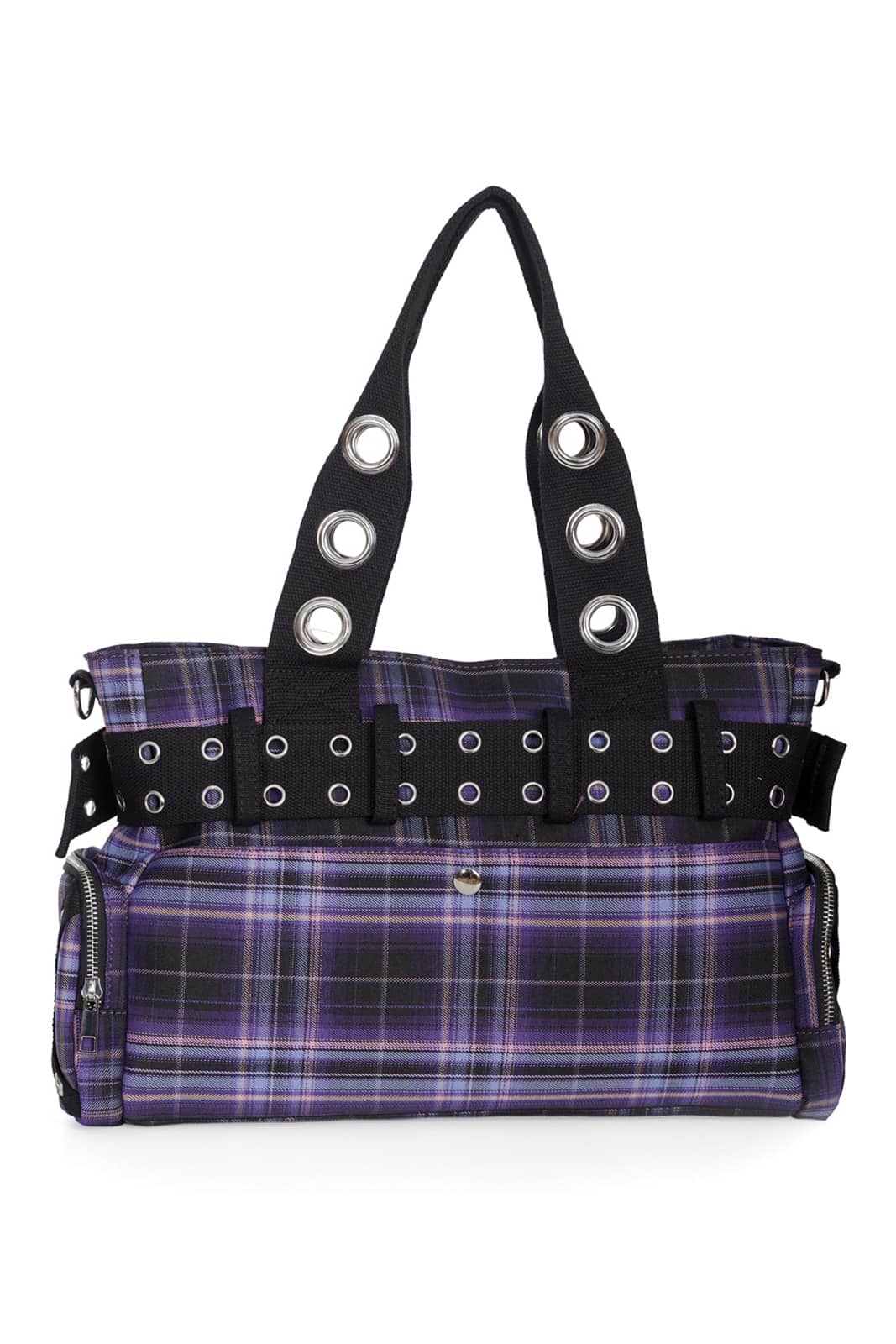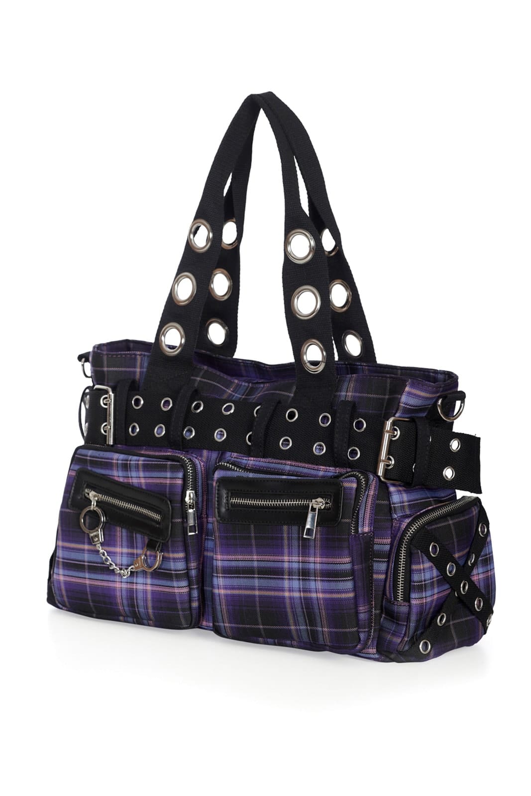 Diese Schultertasche verbindet Grunge, Punk und Gothic-Ästhetik zu einem absolut markanten Statement-Piece. Das violett-schwarze Karomuster trifft auf große Ösen, breite Gurte und mehrere Fronttaschen – perfekt für Alltag, Konzerte oder deinen alternativen Streetstyle. Der Handschellen-Charm verleiht der Tasche zusätzlich einen rebellischen, edgy Look.