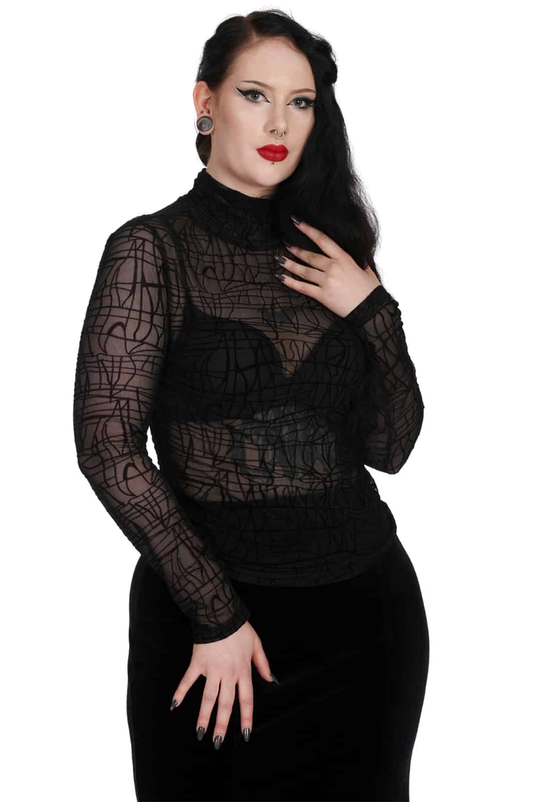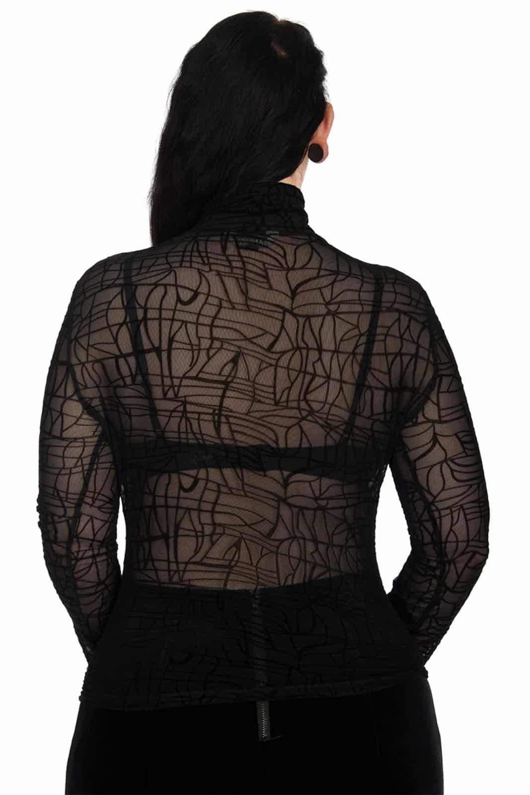 Weiches und dehnbares Gothic-Netzoberteil mit beflocktem Distressed-Detail. Mit hohem Halsausschnitt, langen Ärmel und tailliertem Schnitt.