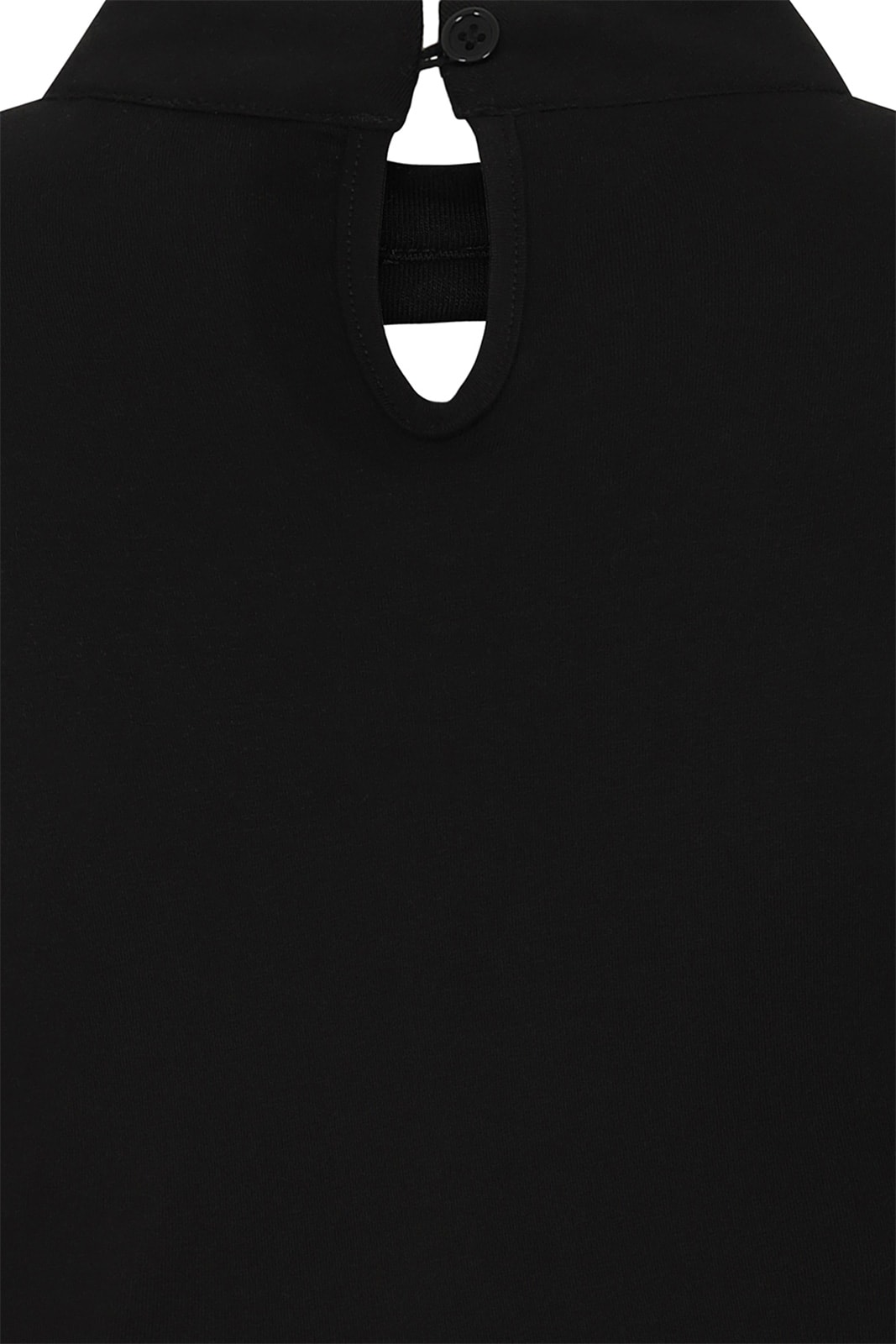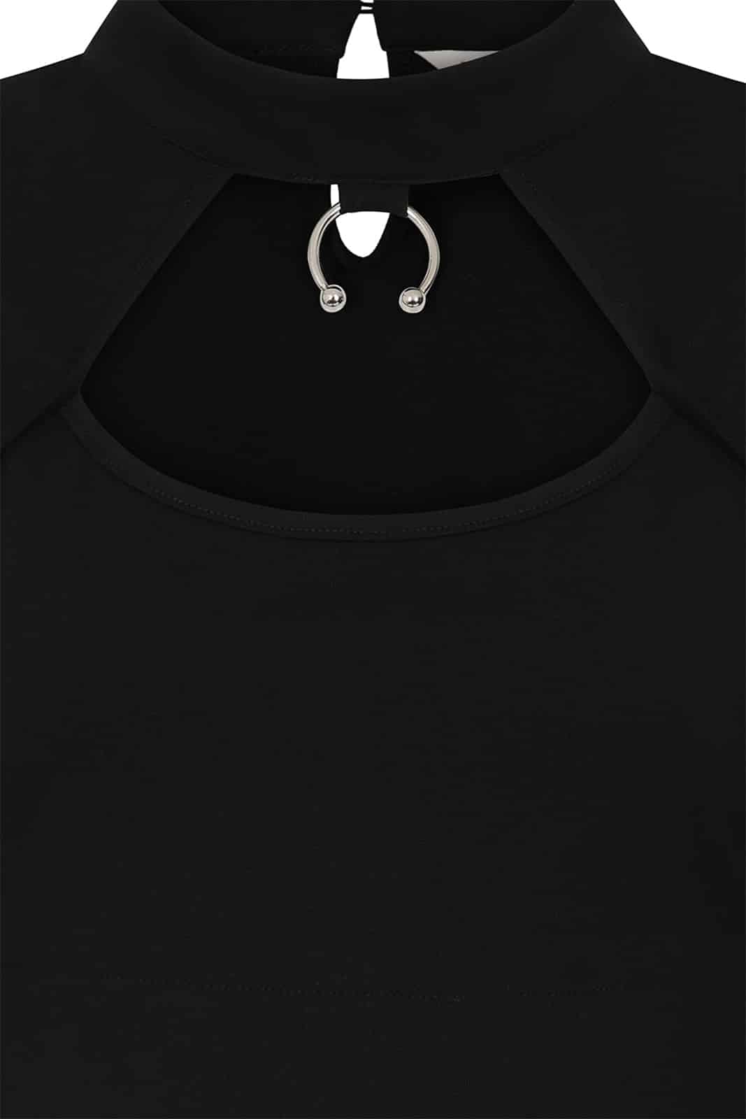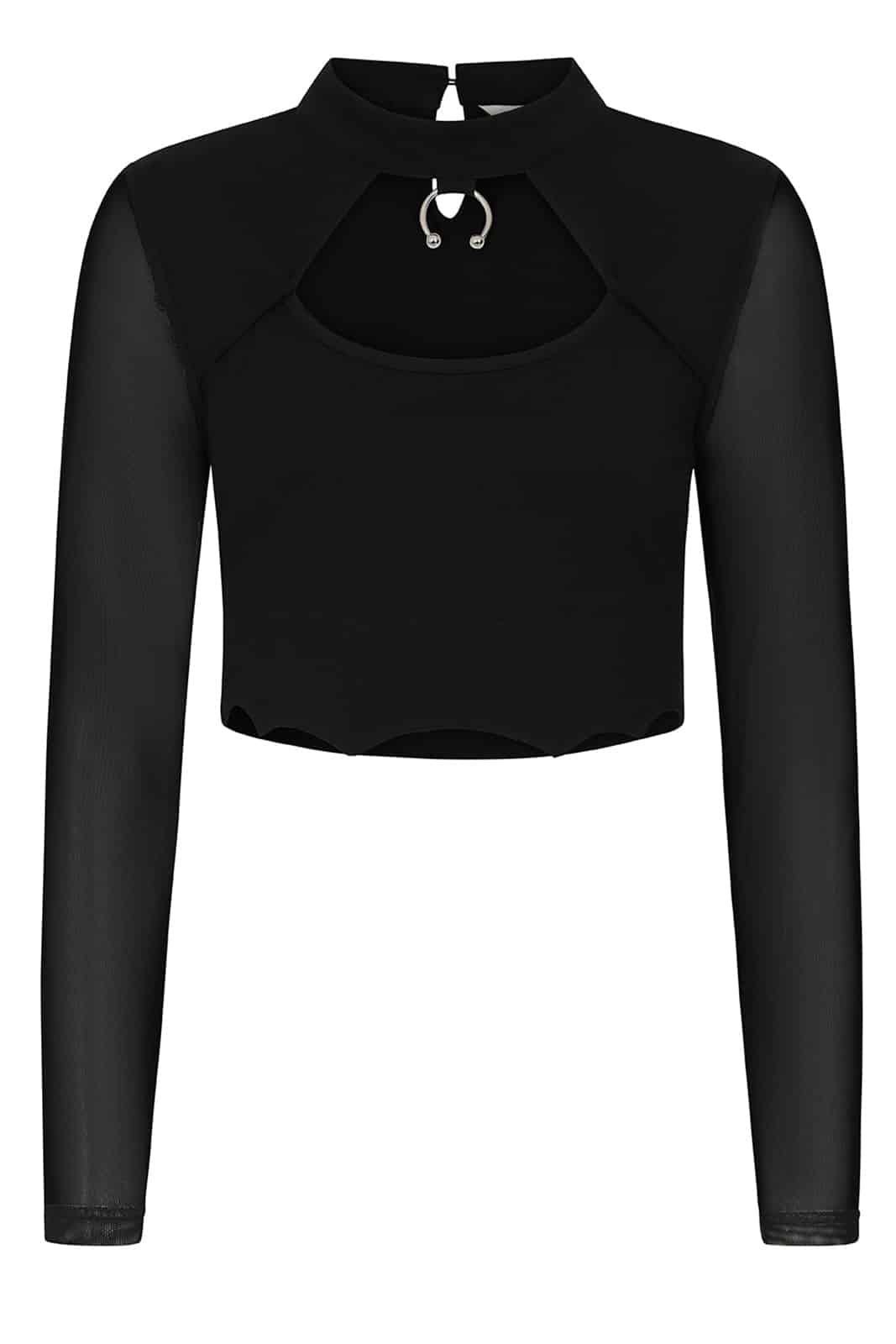 Kurz geschnittenes Gothic-Top mit Fledermaus-Saum und Schlüsselloch-Detail. Das Top ist mit langen Ärmeln aus transparentem Netzstoff gefertigt. Das Schlüssellochdetail oberhalb der Brust ziert ein silbernes großes Piercing.