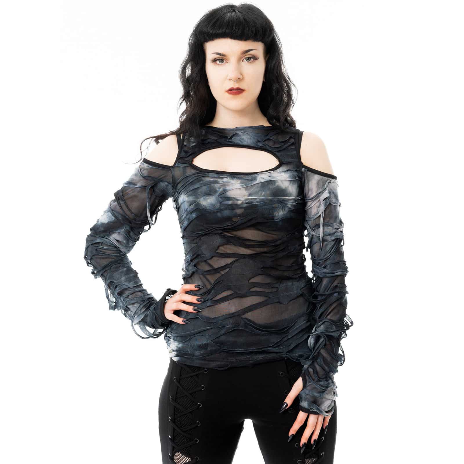 Dieses außergewöhnliche Longsleeve der Marke Chemical Black verbindet düstere Eleganz mit avantgardistischem Design. Die transparente Mesh-Optik wird von unregelmäßigen, stofflichen Strukturen überzogen, die wie dunkle Nebelschwaden über dem Körper liegen und dem Oberteil eine geheimnisvolle Tiefe verleihen. Cut-Outs im Schulterbereich und am Rücken setzen gezielte Akzente und unterstreichen den markanten Gothic-Charakter.