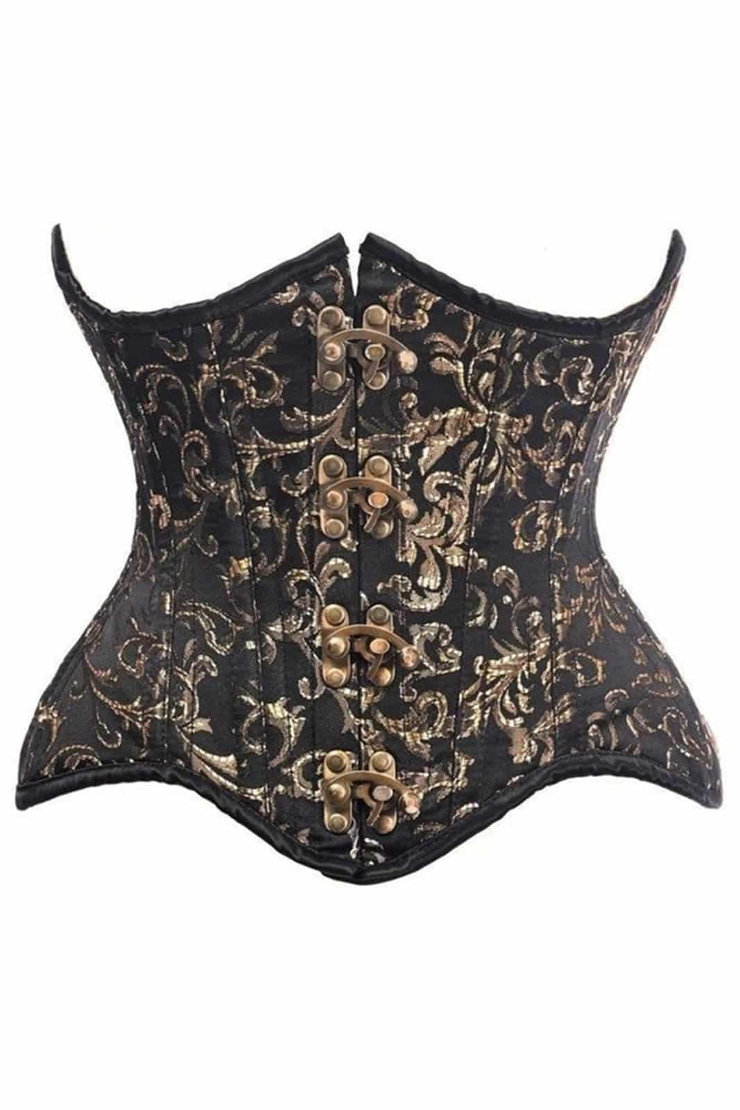 Edles Underbust-Korsett im barocken Stil mit aufwendig gemustertem Brokat-Look in Schwarz und Gold. Die formende Schnittführung betont die Taille wirkungsvoll, während die Kombination aus klassischer Rückenschnürung und dekorativem C-Lock-Verschluss auf der Vorderseite Funktionalität mit viktorianischer Ästhetik verbindet. Ideal für Gothic-, Steampunk- und elegante Abendlooks.