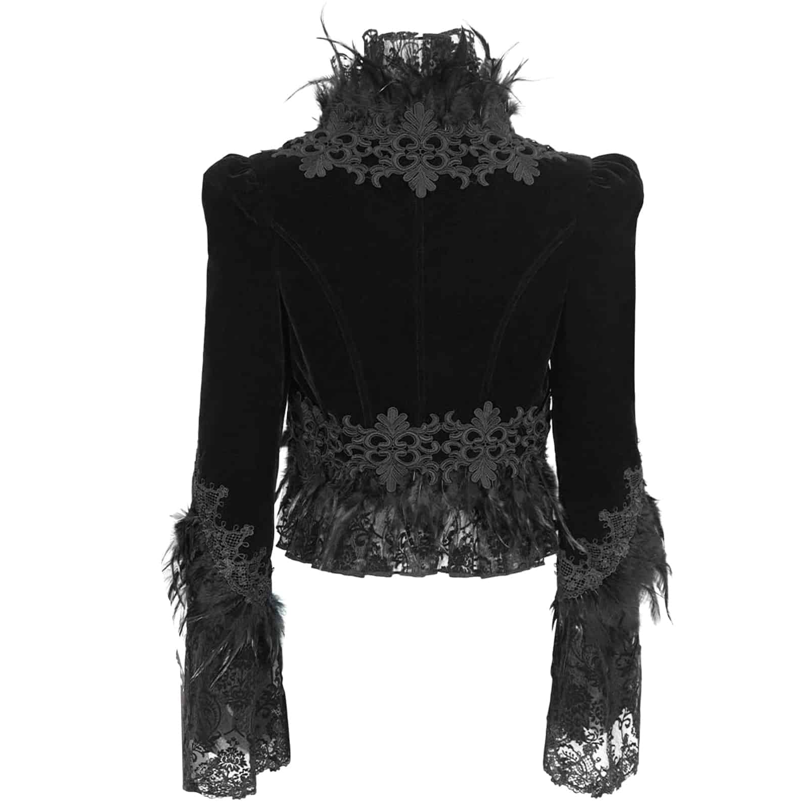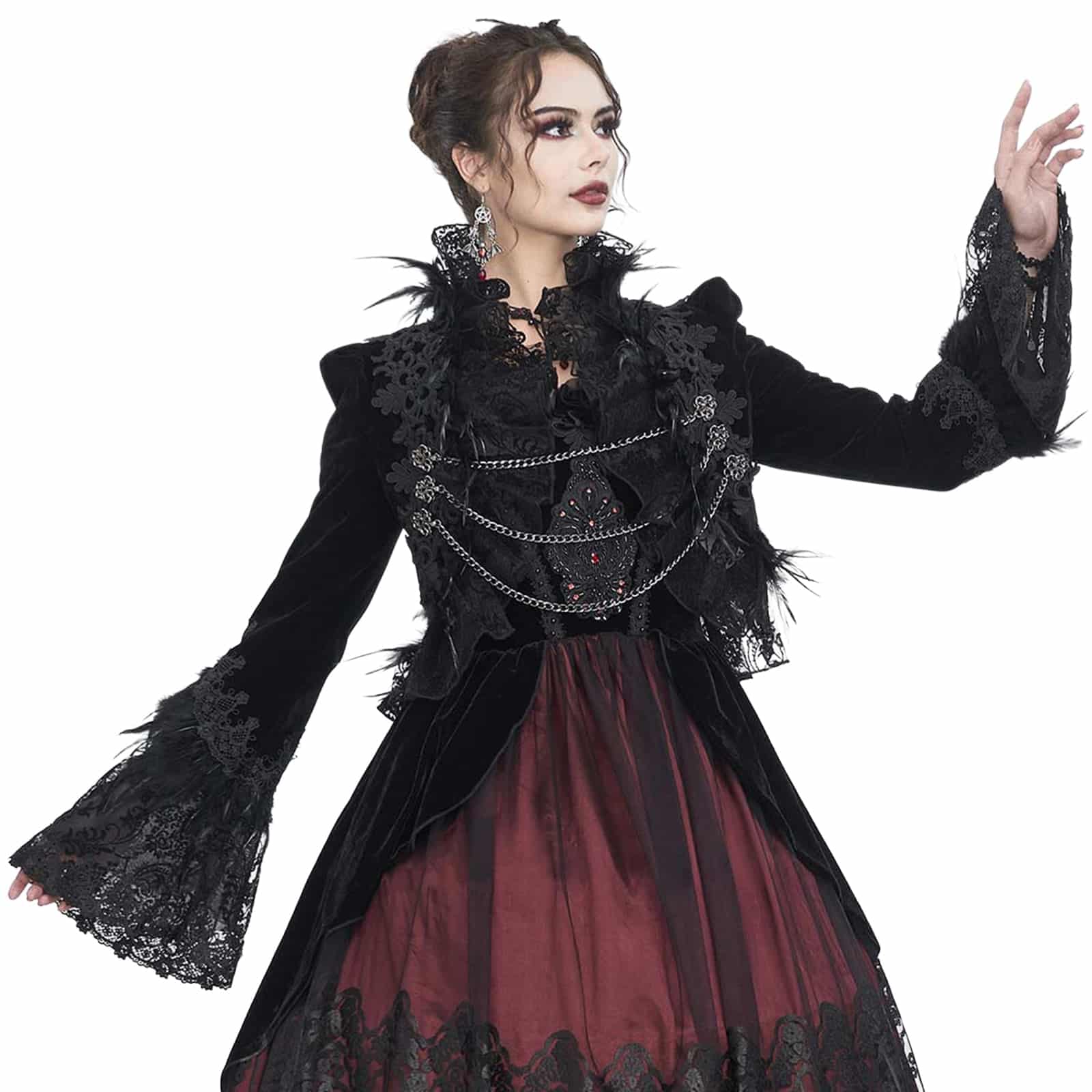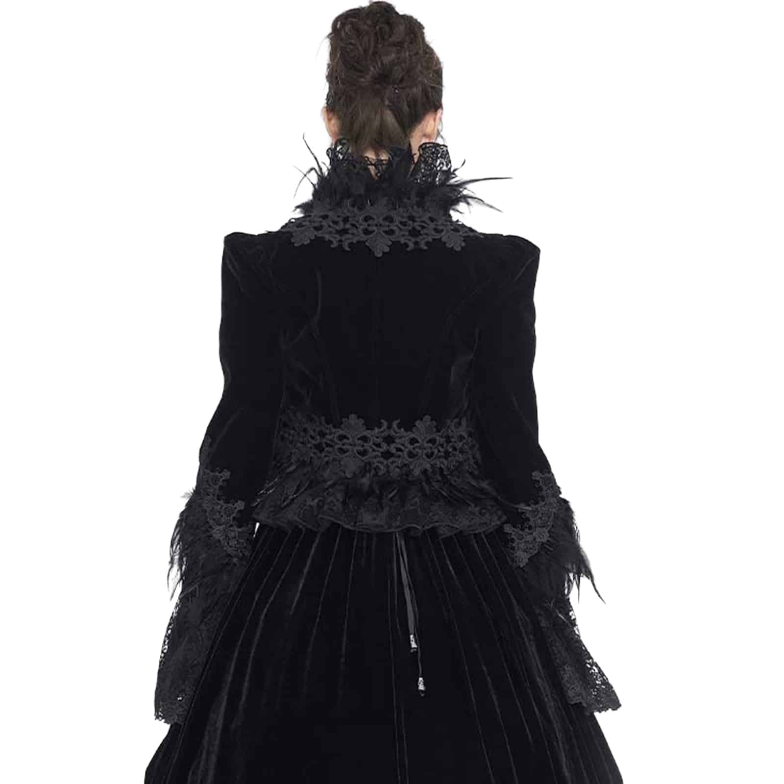 Ein wahres Prunkstück viktorianisch-gotischer Mode – dieser Bolero verbindet majestätische Eleganz mit dramatischer Ausstrahlung. Gefertigt aus tiefschwarzem Samt besticht er durch edle Stickereien Spitzenrüschen und kunstvoll platzierte Federn die dem Design einen geheimnisvollen Charakter verleihen. Silberfarbene Ketten schmücken die Vorderseite und unterstreichen die opulente Silhouette während der hohe Kragen mit Rüschen das Gesicht eindrucksvoll rahmt. Die leicht ausgestellten Ärmel enden in aufwendig gearbeiteten Spitzenmanschetten mit Federn und sorgen für einen theatralischen Auftritt. Aus 100% Polyester gefertigt ist dieser Bolero die perfekte Wahl für alle die ihre Garderobe mit einem außergewöhnlichen Statement-Piece voller dunkler Romantik und viktorianischem Zauber bereichern möchten.
