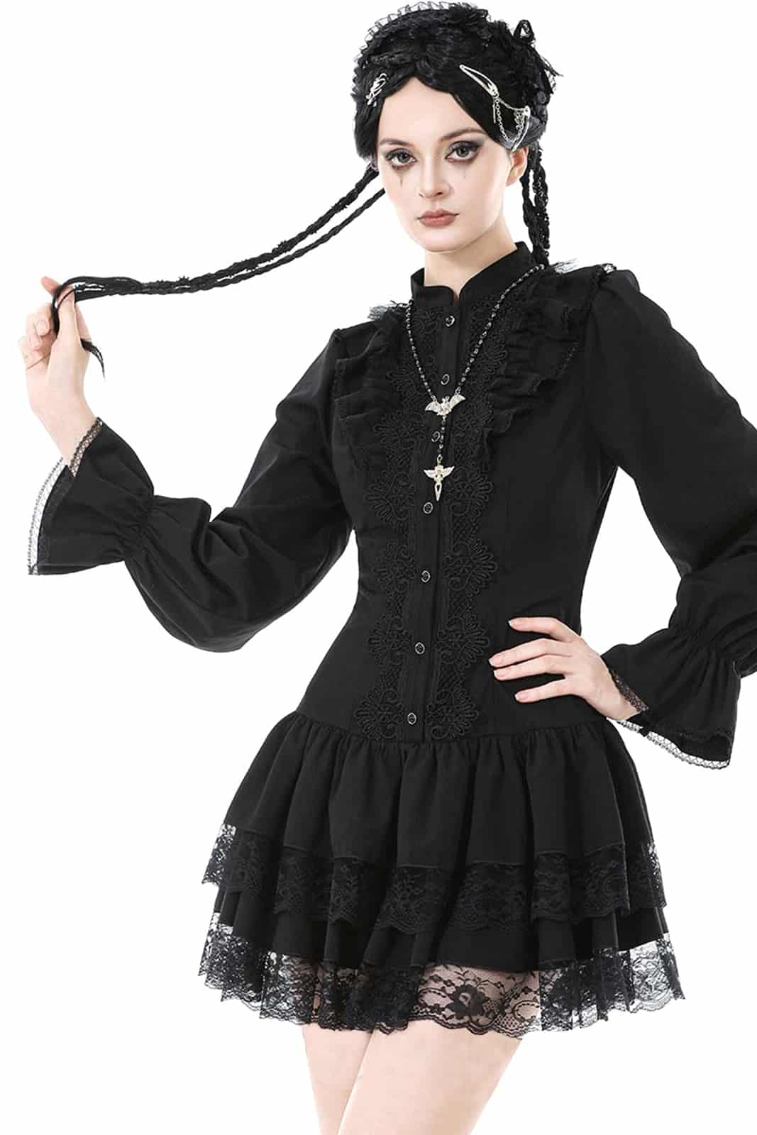 Romantisch, verspielt und mit viktorianischem Flair – das Darklings Academy Kleid verbindet klassische Shirt-Elemente mit femininen Rüschen und eleganten Spitzen-Details. Perfekt für einen düsteren, aber stilvollen Look mit Gothic-Charakter.