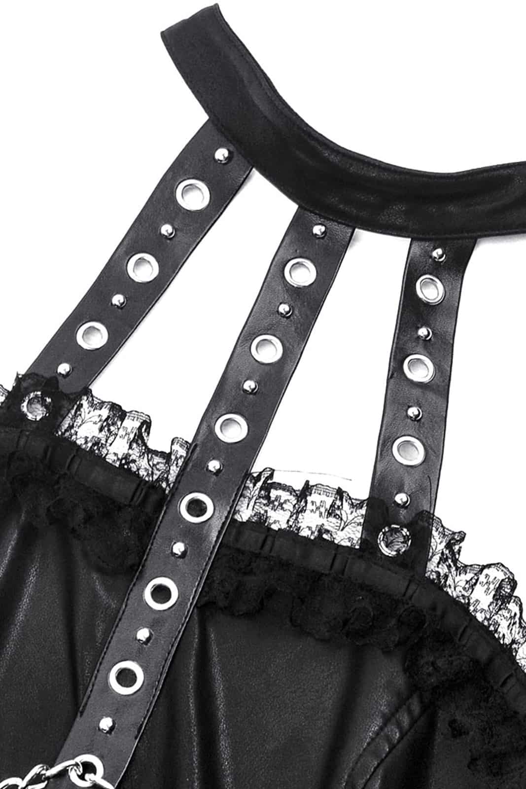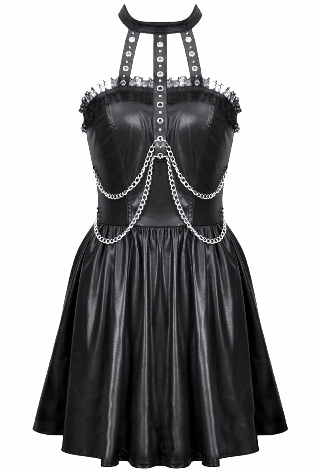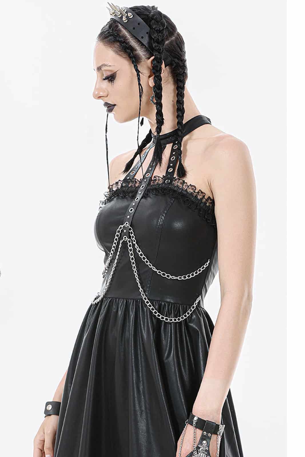 Das Pandora Arcanum Kleid vereint düstere Eleganz mit markanten Gothic-Details. Das kurze, ärmellose Design aus schwarzem Kunstleder wird durch einen auffälligen Halterneck, raffinierte Riemenoptik und dekorative Ketten perfekt in Szene gesetzt – ideal für Clubnächte, Konzerte oder alternative Events.