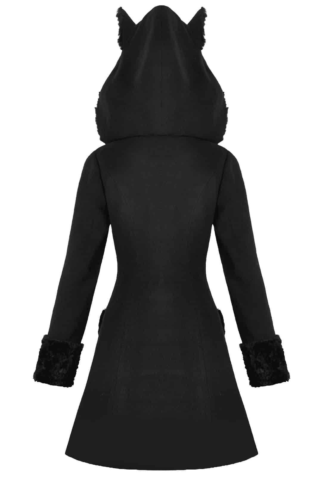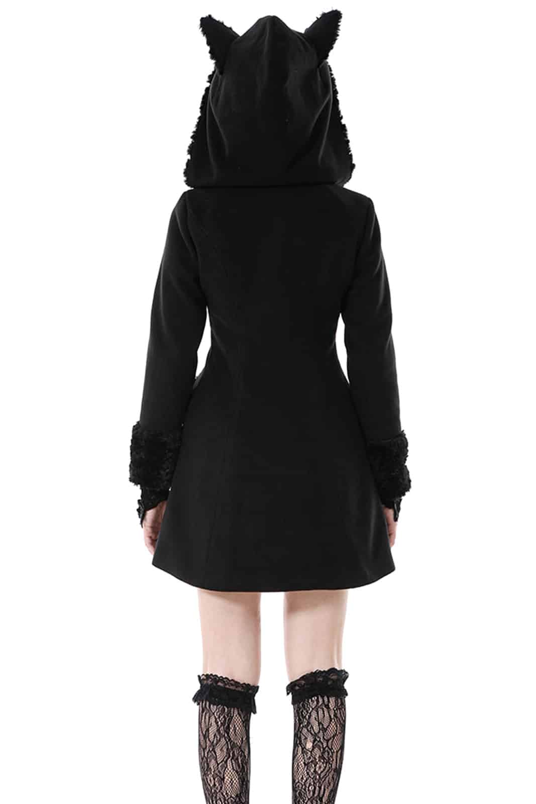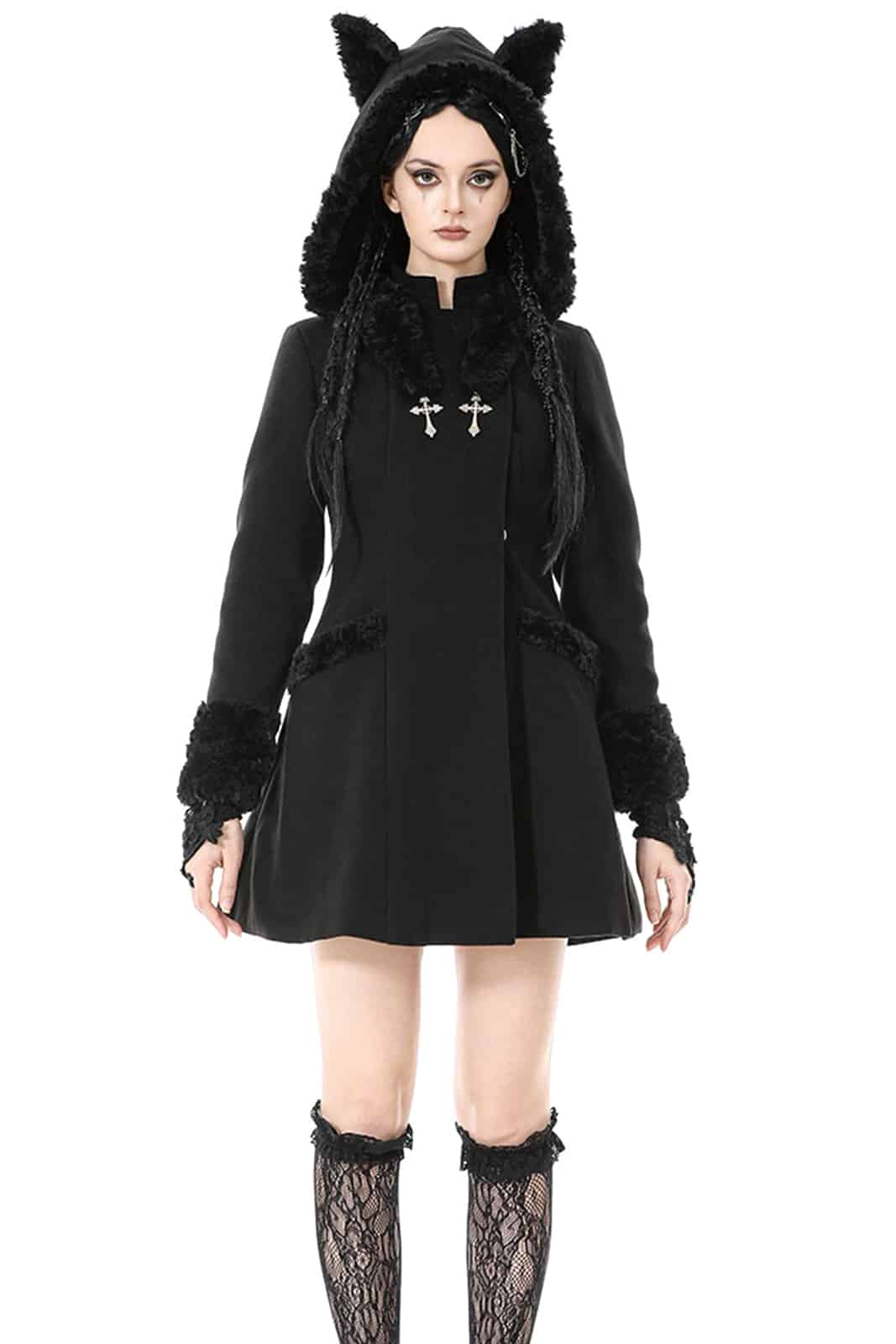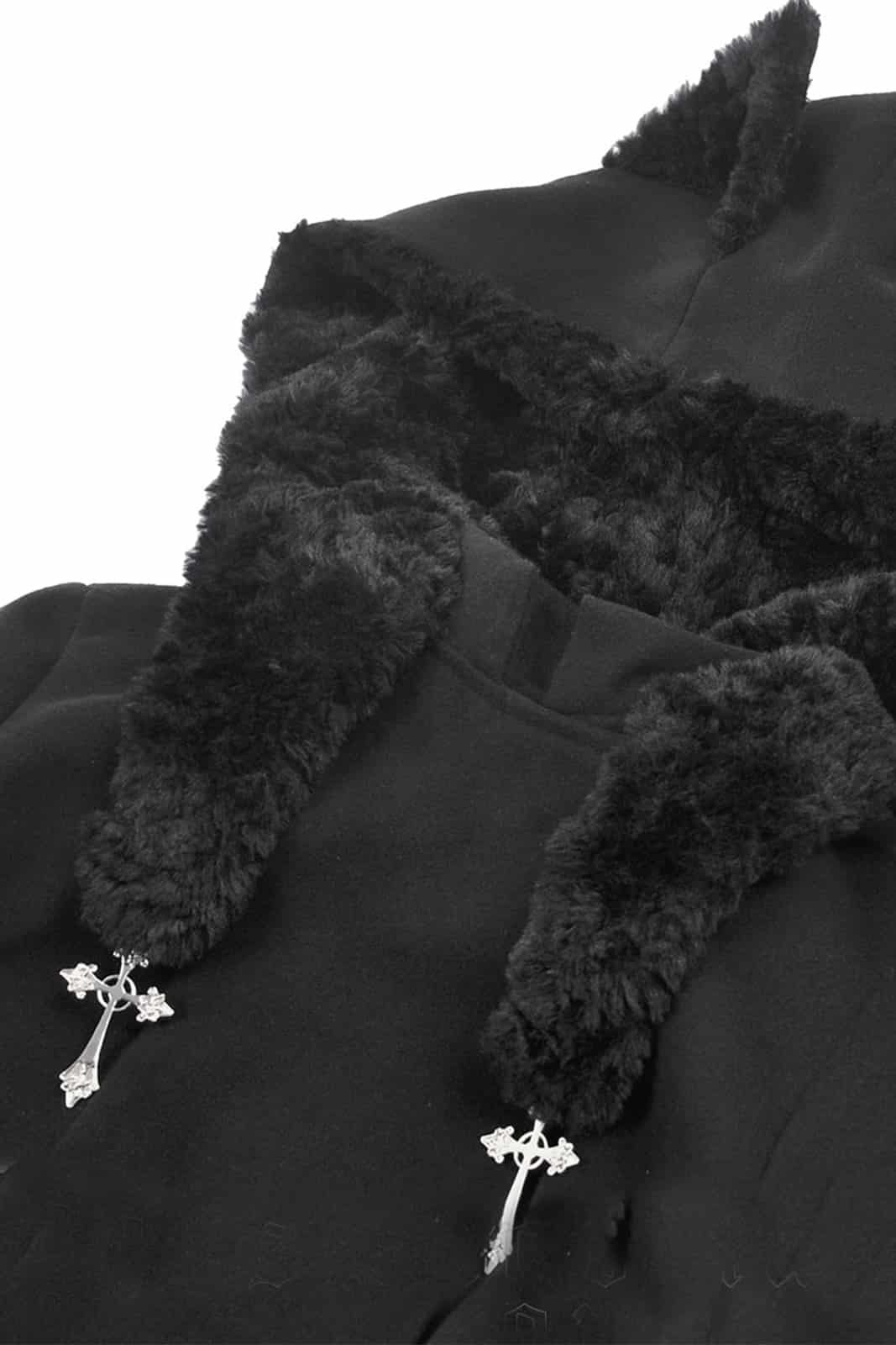 Dieser figurbetonte Gothic-Kurzmantel verbindet verspielte Dark-Cute-Details mit klassischer schwarzer Eleganz. Die Kapuze mit angesetzten Katzenohren verleiht dem Design einen geheimnisvollen, leicht rebellischen Charakter, während weiche Kunstfellbesätze an Kapuze, Ärmeln und Taschen für eine luxuriöse, winterliche Note sorgen. Kleine Kreuzanhänger auf der Front setzen dezente okkulte Akzente und runden den Look perfekt ab – ideal für Gothic-, Witchy- oder Dark-Streetwear-Outfits.