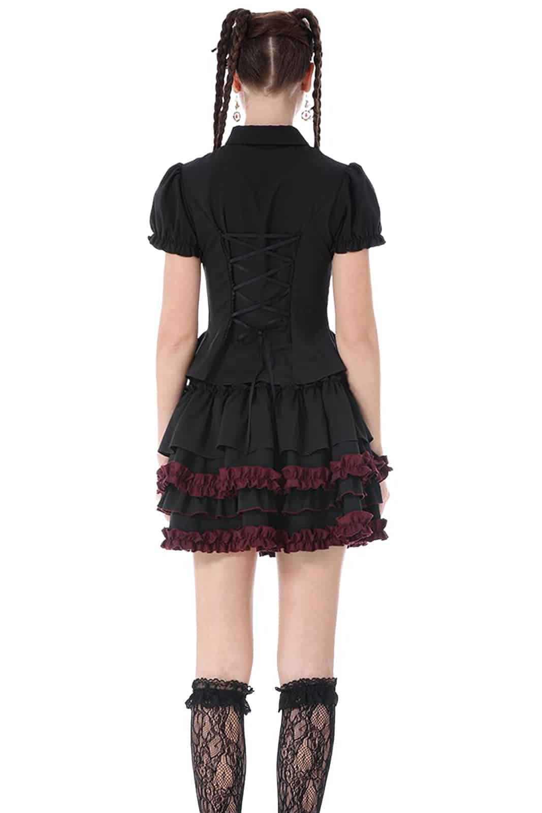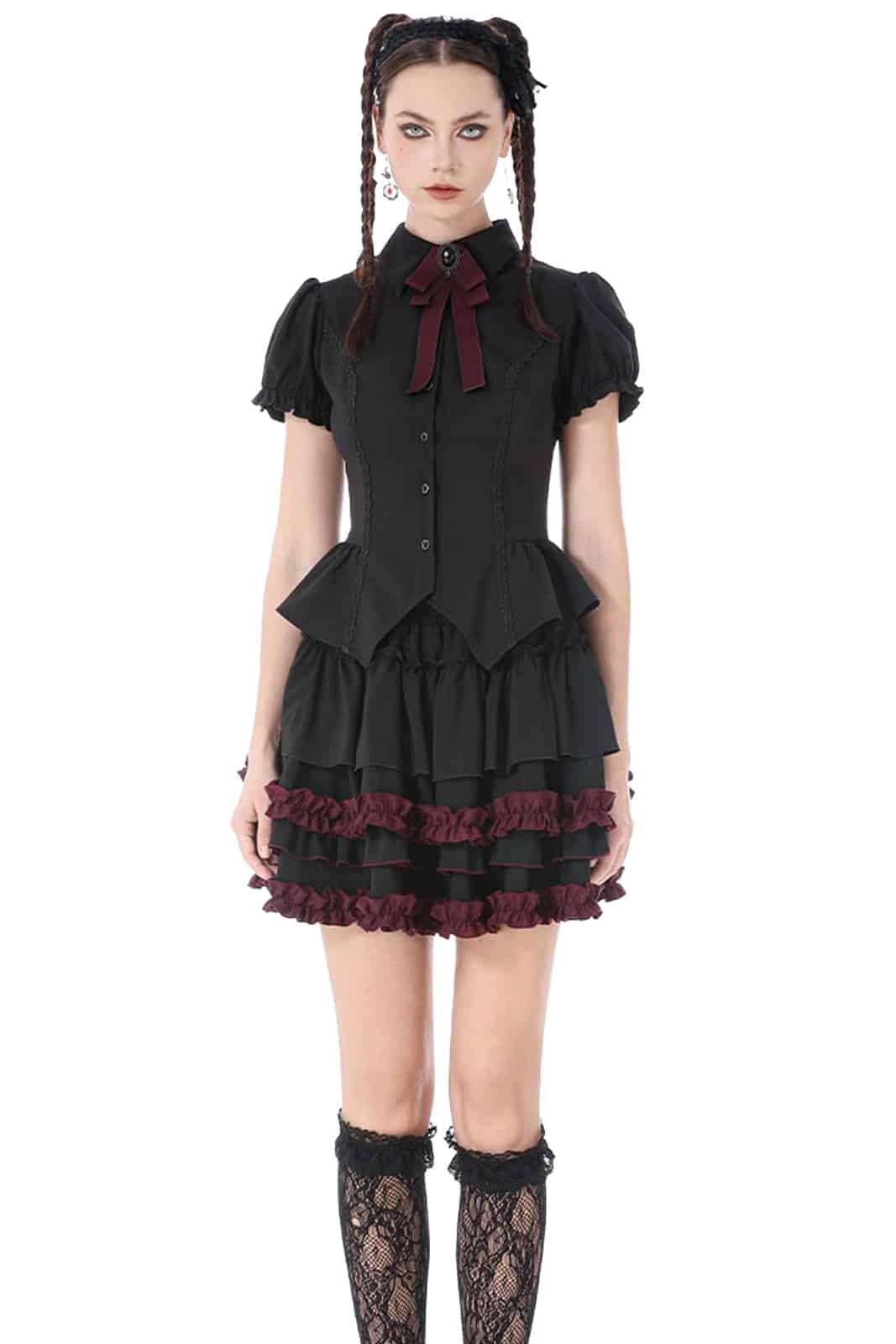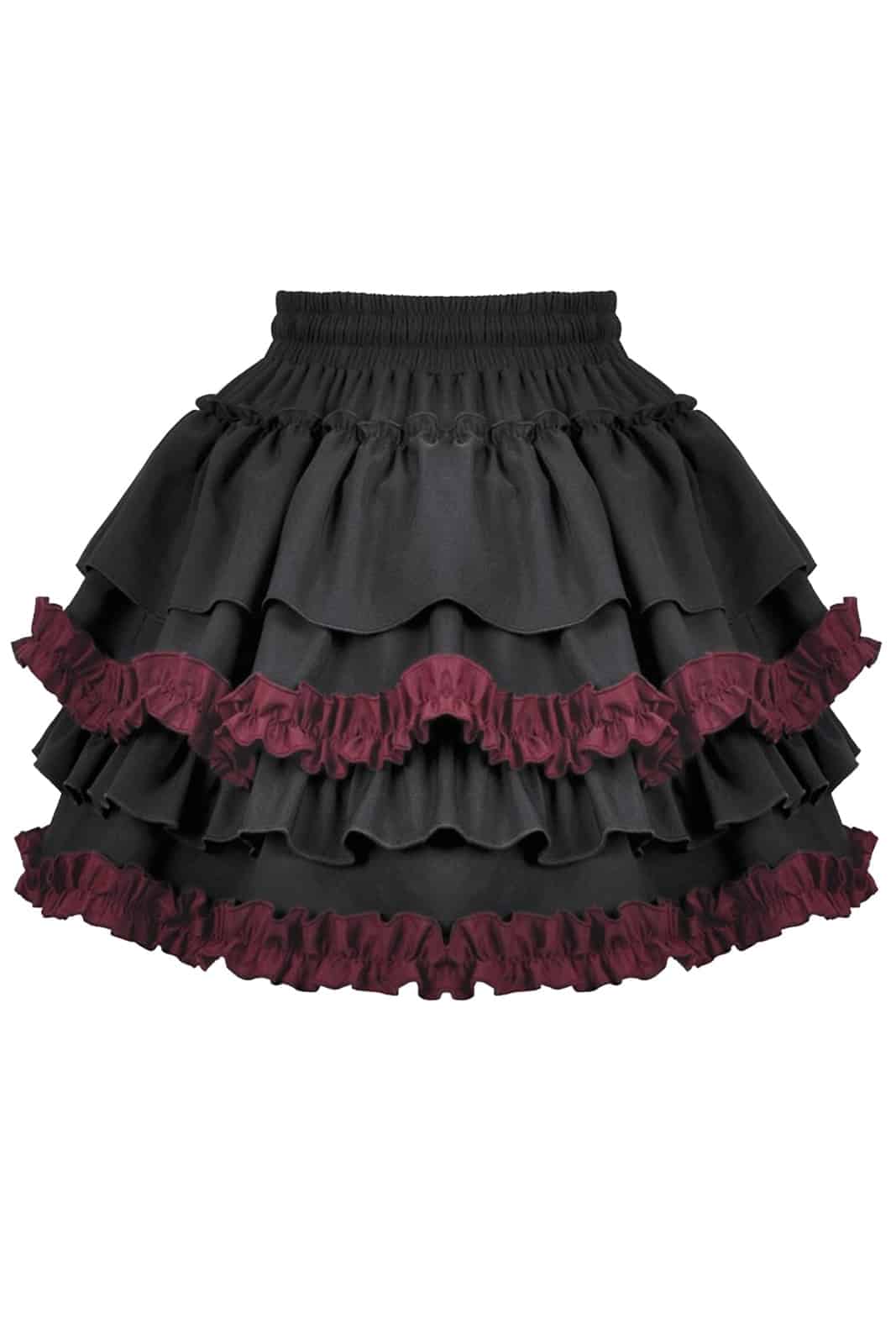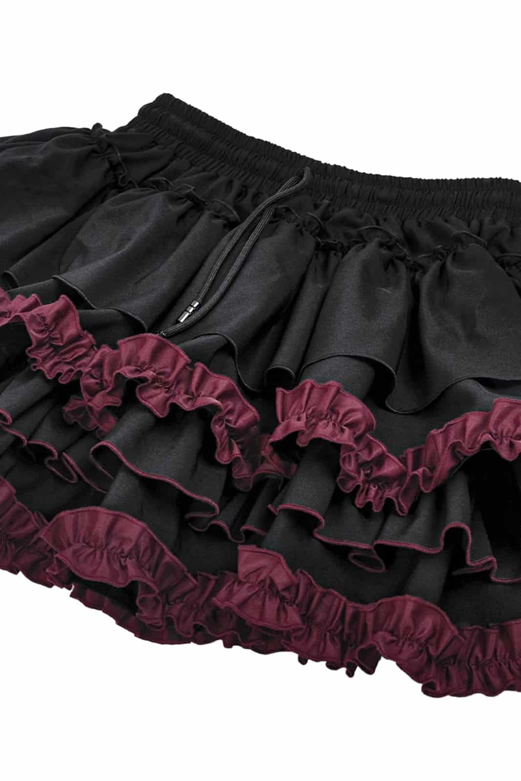 Romantisch, verspielt und mit dunkler Eleganz: Dieser kurze Rüschenrock vereint klassische Gothic-Ästhetik mit femininen Details. Die mehrlagigen Volants und die kontrastierenden bordeauxfarbenen Akzente sorgen für einen ausdrucksstarken Look mit besonderer Tiefe.