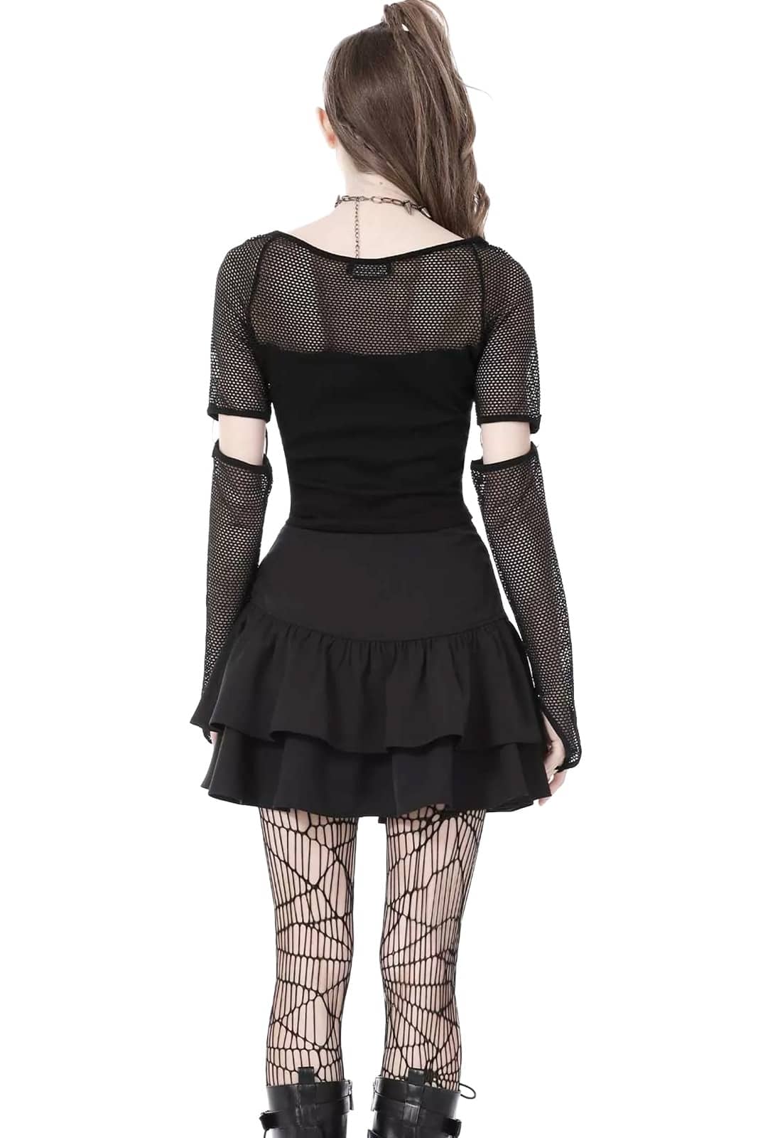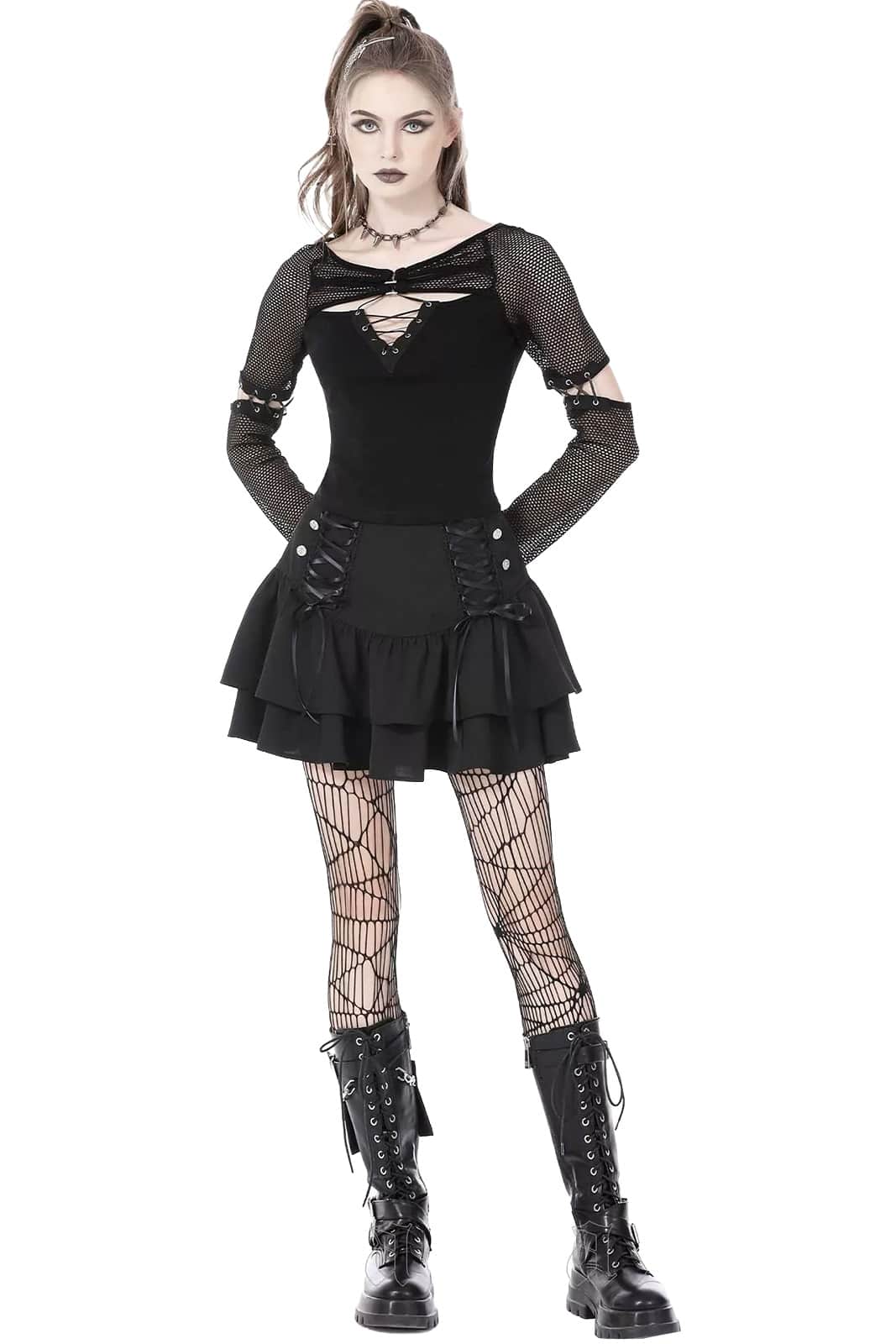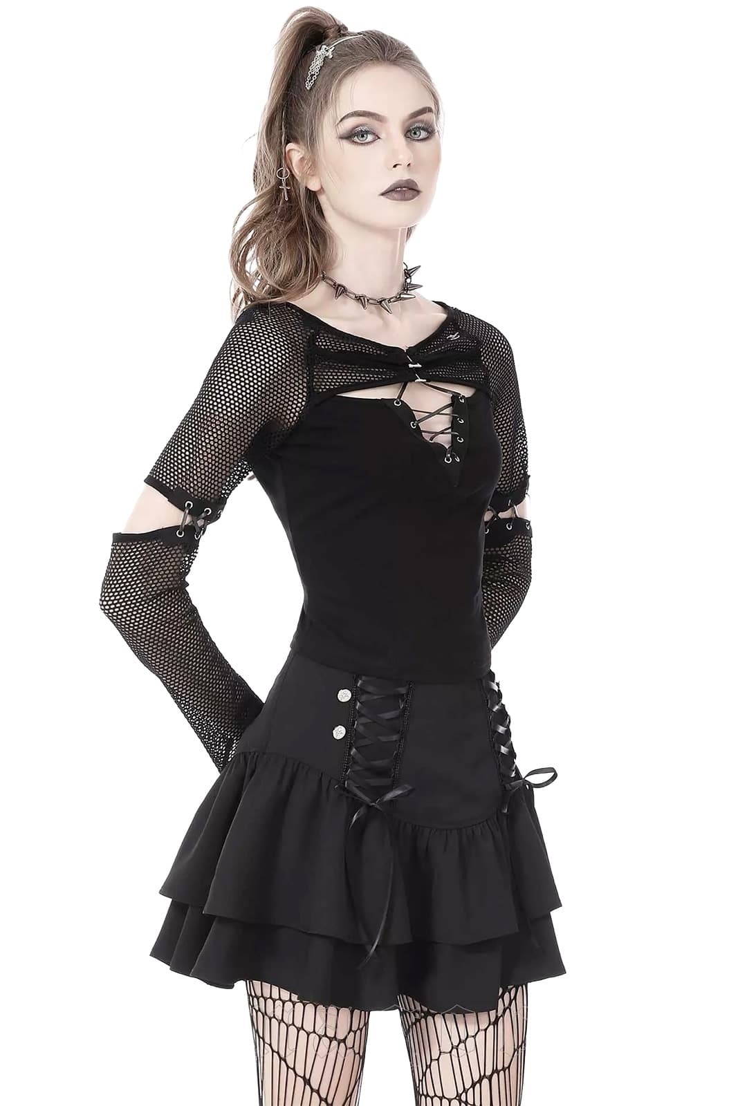 Verspielt, frech und doch tiefschwarz – dieser Minirock bringt romantische Gothic-Ästhetik mit einer rebellischen Note perfekt zusammen.