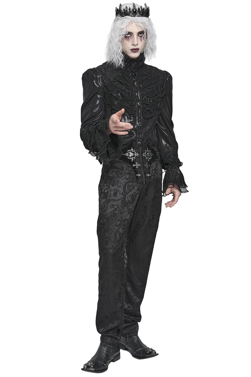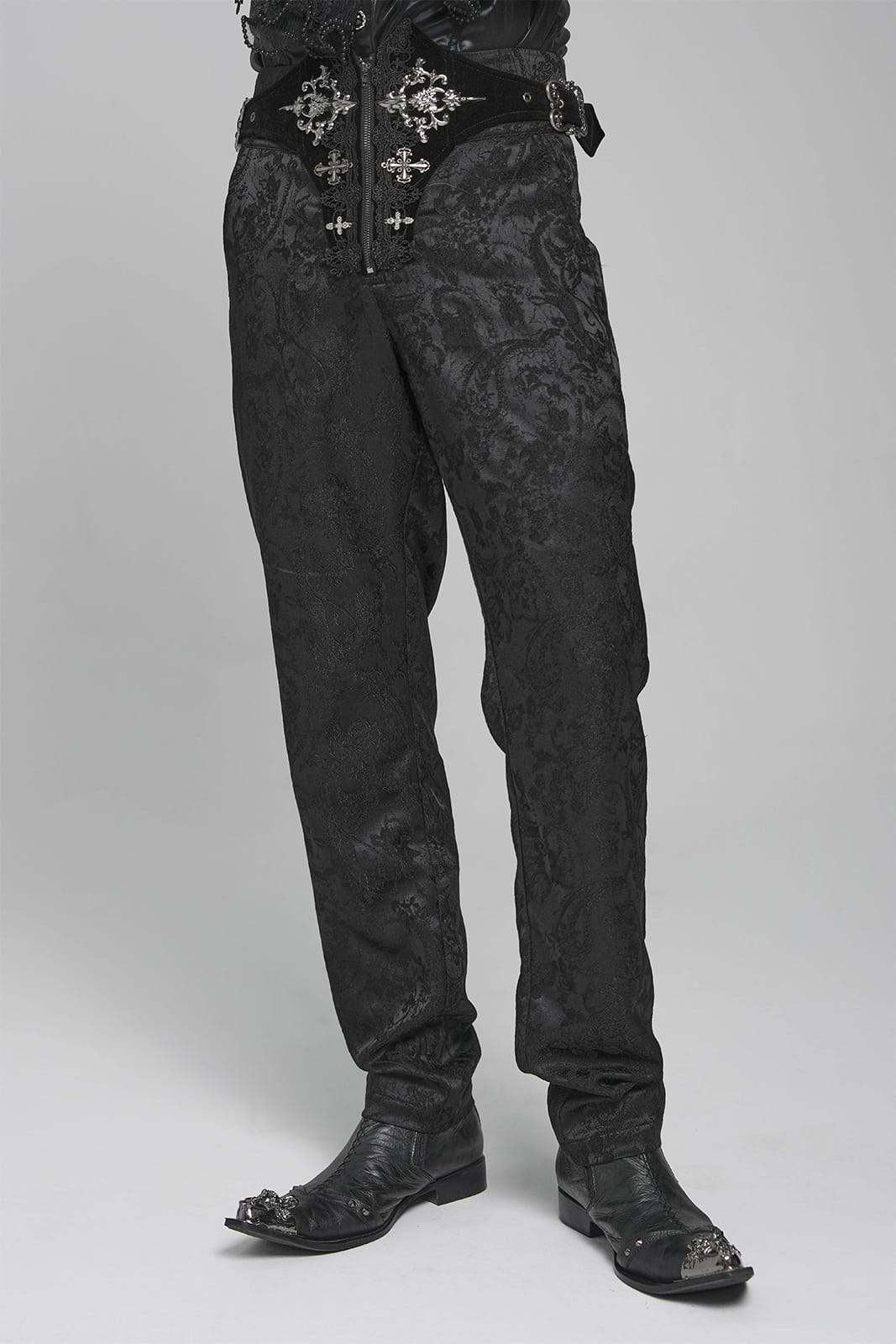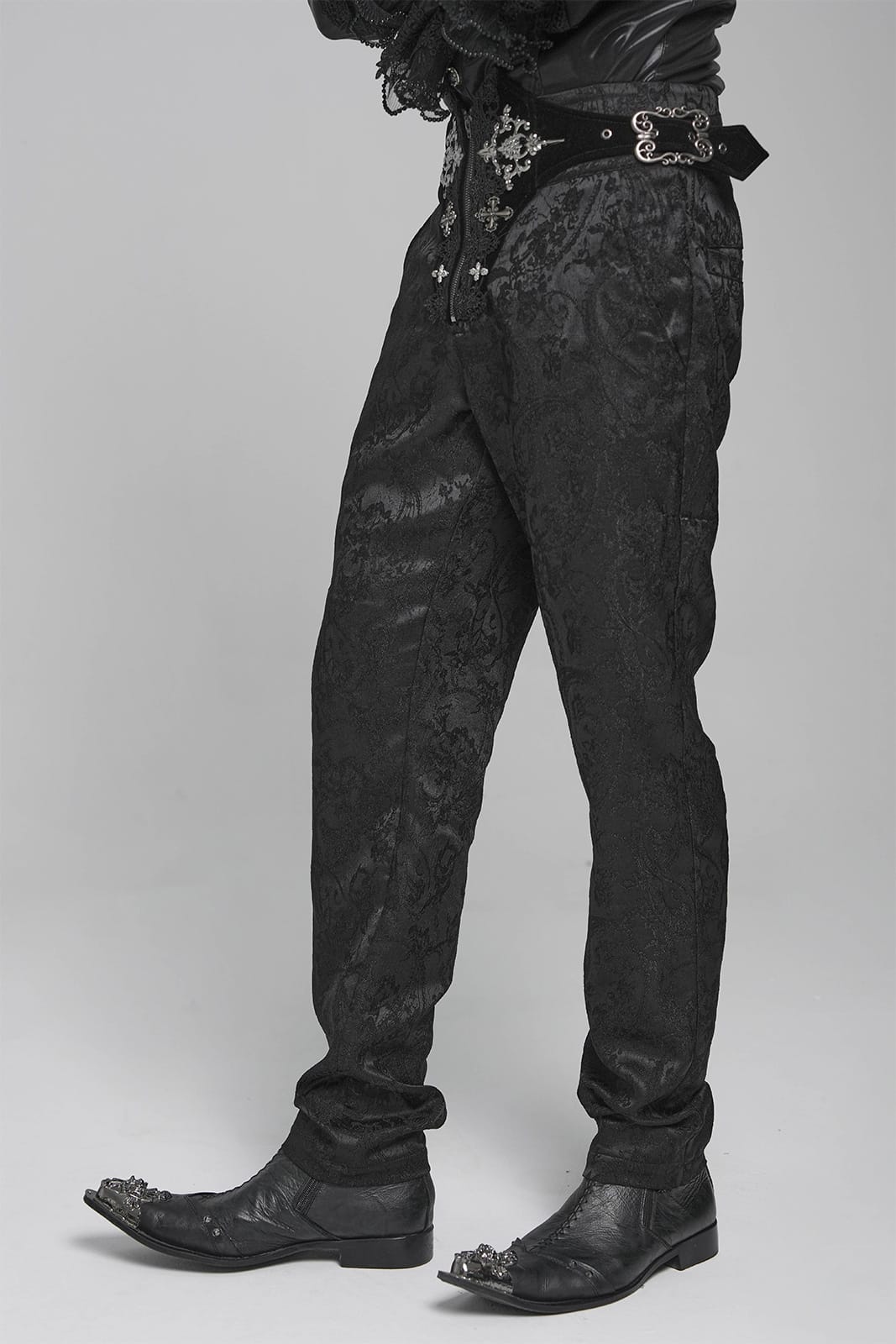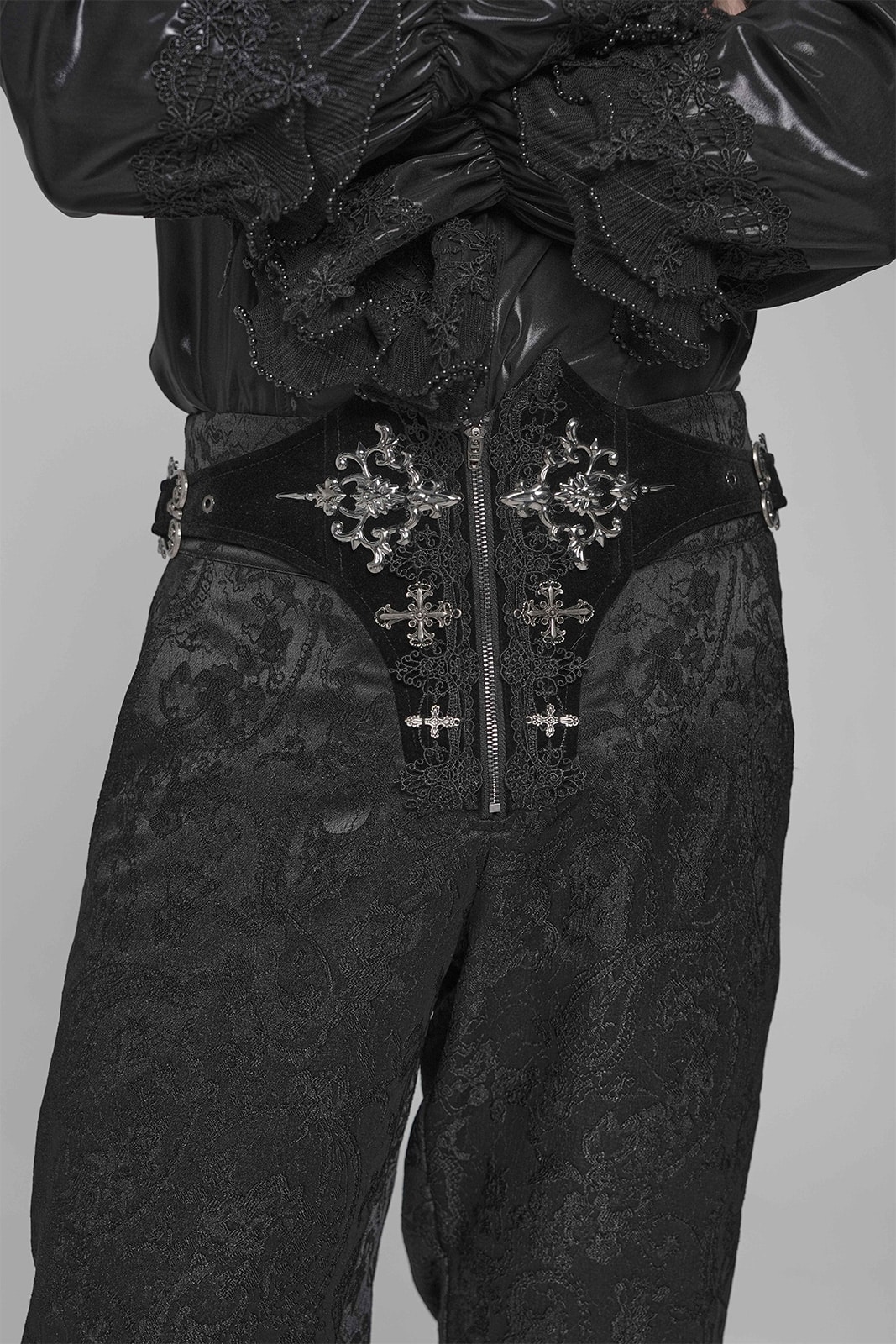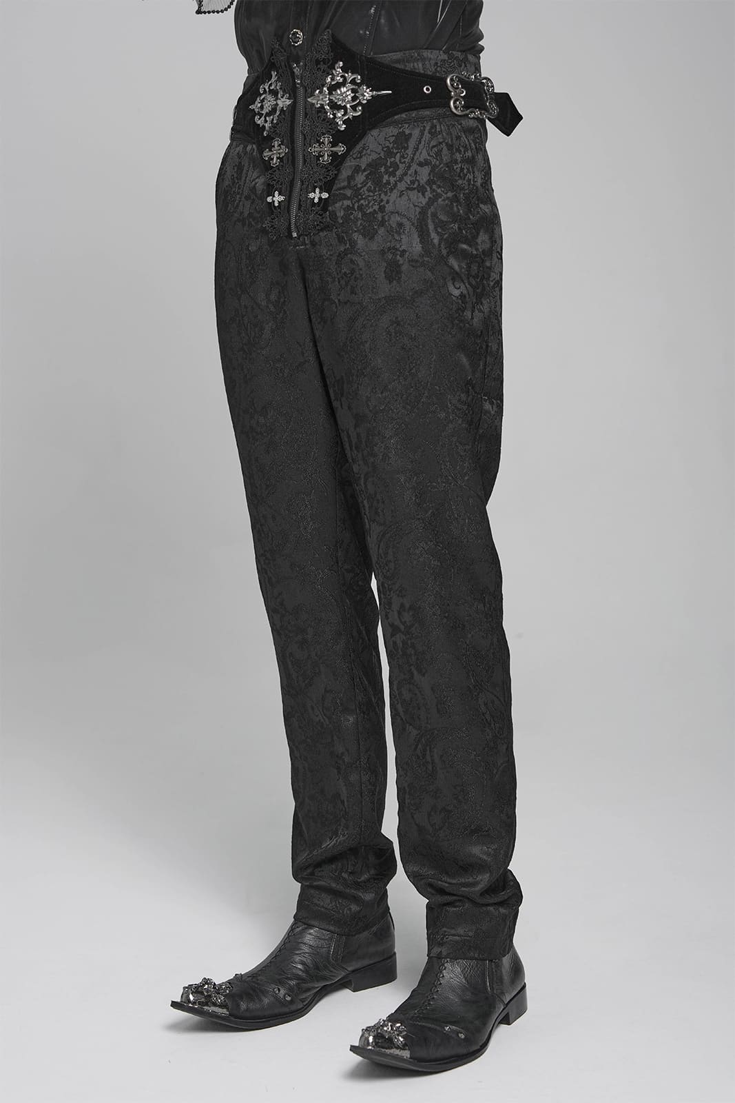 Diese viktorianisch inspirierte Gothic-Hose vereint aristokratische Eleganz mit düsterer Symbolik. Das edle Jacquard-Satin trifft auf Samt-Details und filigrane Metallornamente – perfekt für einen stilvollen Auftritt zwischen Ballsaal und Schattenwelt.