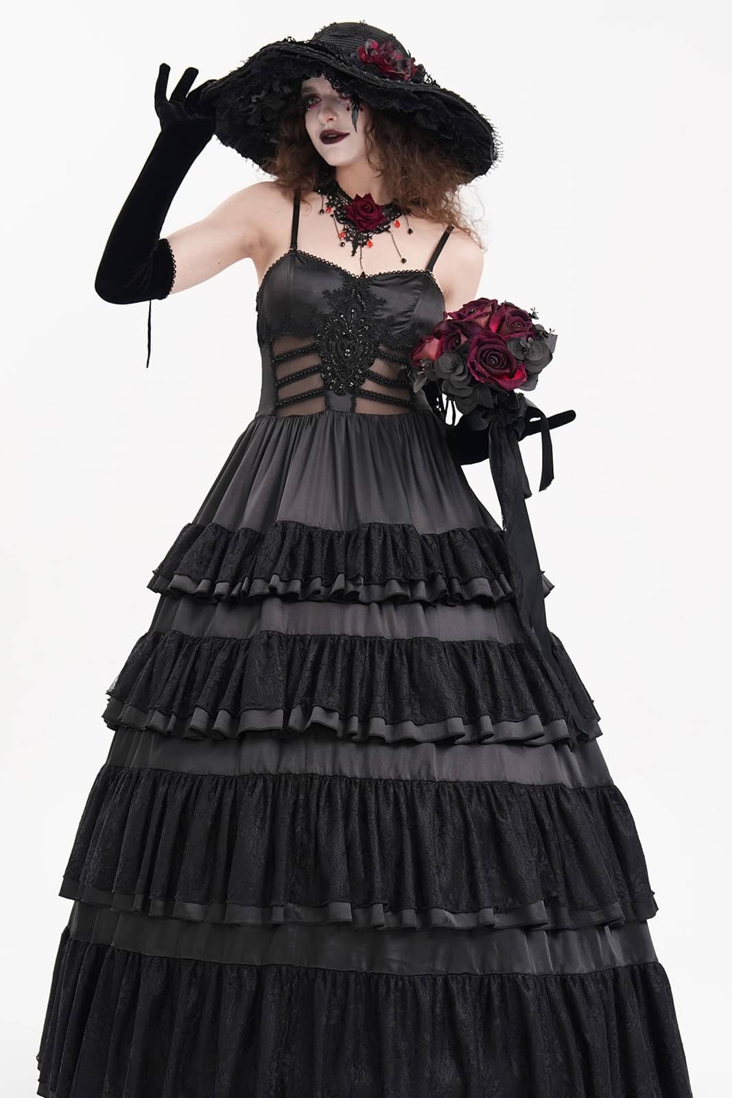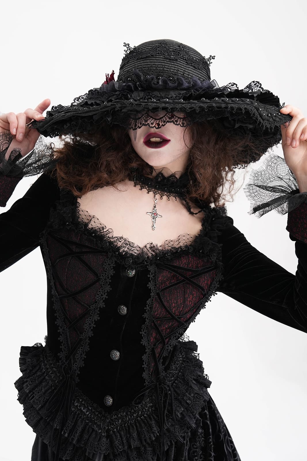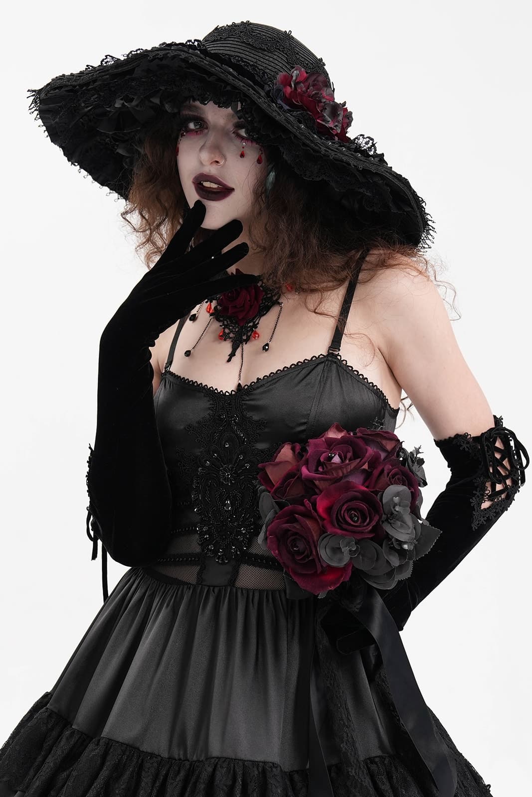 Der Gothic Romance Hut ist ein Meisterwerk aus geheimnisvollen und melancholischen Fäden. Die markante, breitkrempige Kreation ist aus schwarzem Korbgeflecht gefertigt und mit einem zarten Wechselspiel aus Spitze, Samt und Satinrüschen umhüllt. Die edlen Texturen verschmelzen nahtlos zu beiden Seiten der Krempe und rahmen Dein Gesicht mit einer Aura wehmütiger Schönheit ein. Die Krempe ist mit aufwendiger Spitzenstickerei und einem perlenbesetzten Blumendetail verziert und strahlt stille Opulenz aus. Die Krone ist mit gewellter Spitzenstickerei verziert, während schwarze und rote Stoffblumen an der Basis einen Hauch von düsterer Romantik verleihen. Federdetails flattern mit fast geisterhafter Anmut und runden den bezaubernden Look ab. Eine perfekte Verbindung aus Gothic-Charme und zeitloser Romantik.