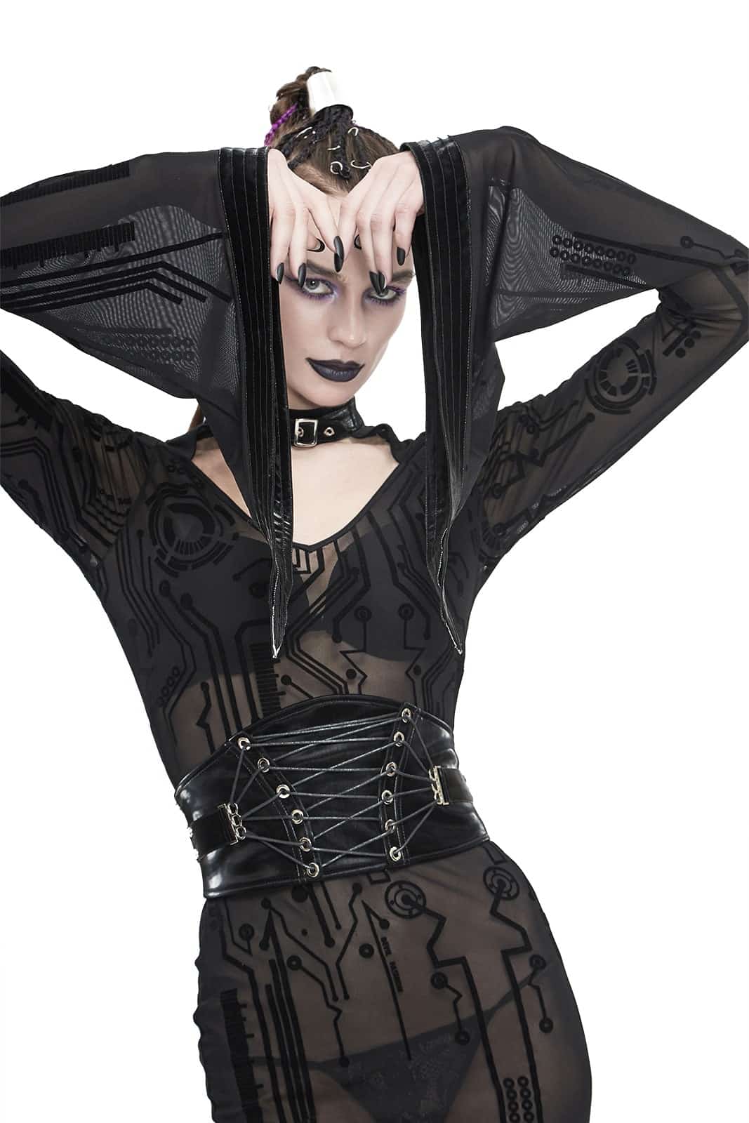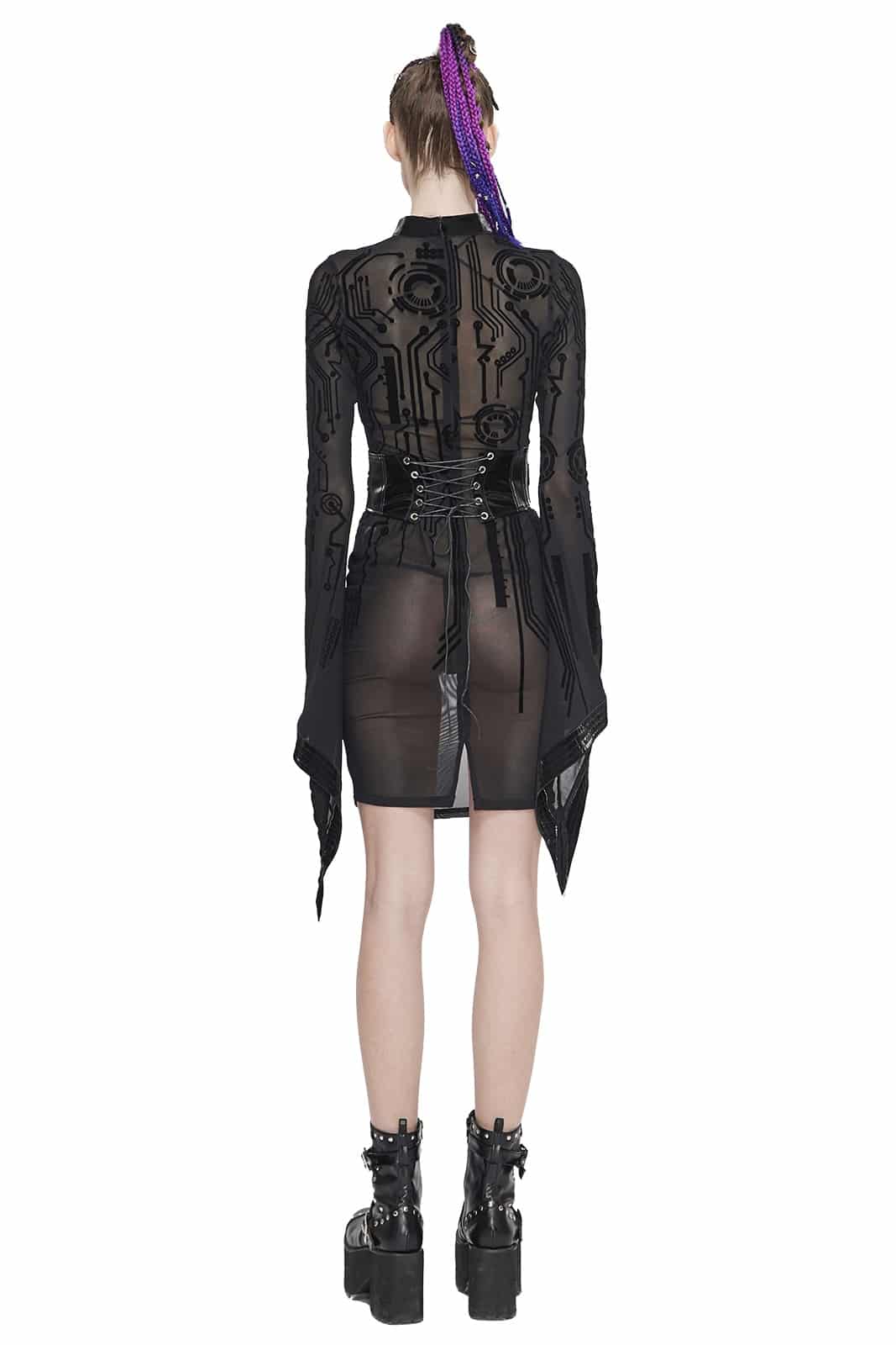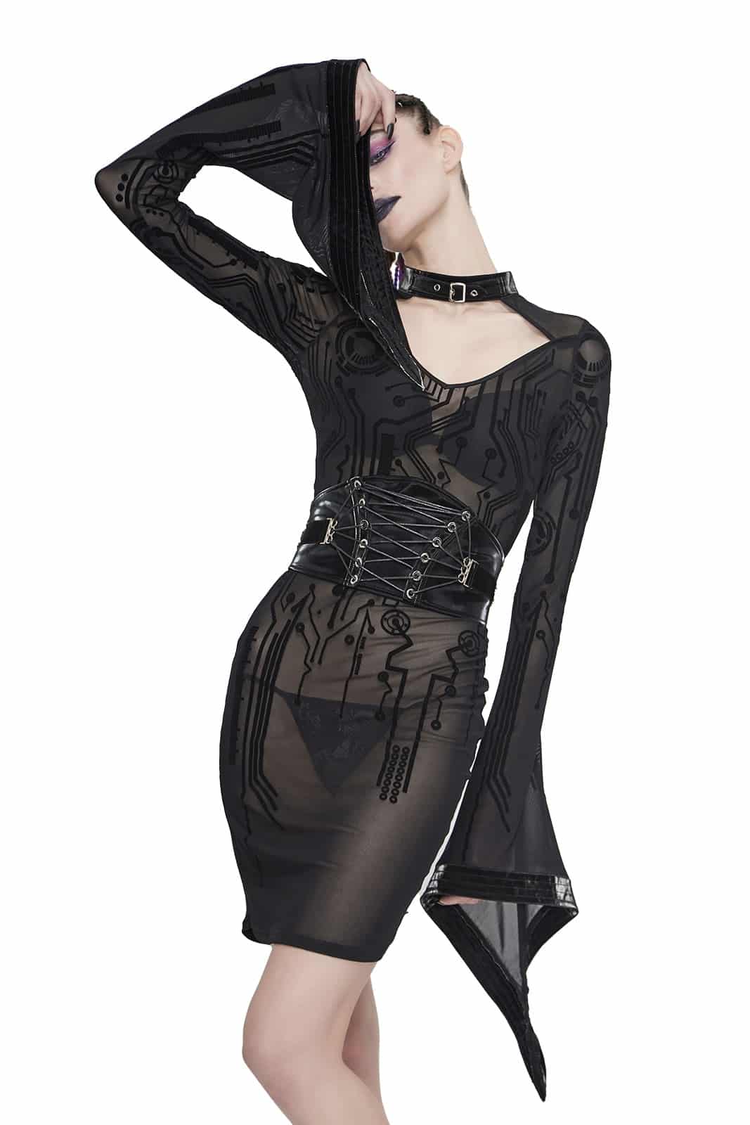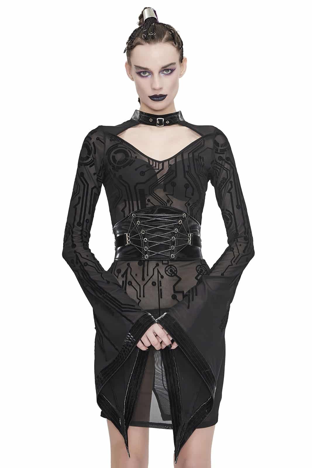 Schwarzes Gothic-Netzkleid aus transparentem Stoff mit Samtbeflockung und reizvollem Cut-Out-Ausschnitt. Der Choker-Kragen ist mit einer verstellbaren Schnalle versehen.