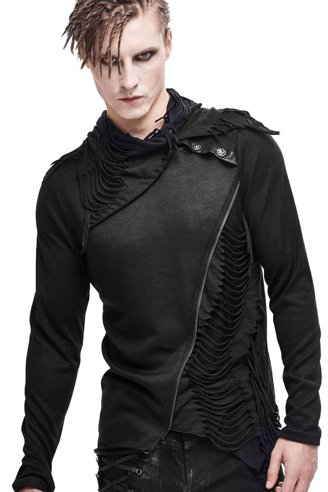 Langärmeliges Herrenoberteil in asymetrischem Schnitt. Ausgestattet mit Zipperdetails, distressed Kragen und Seitenteil und Zierknöpfen an der Schulter.