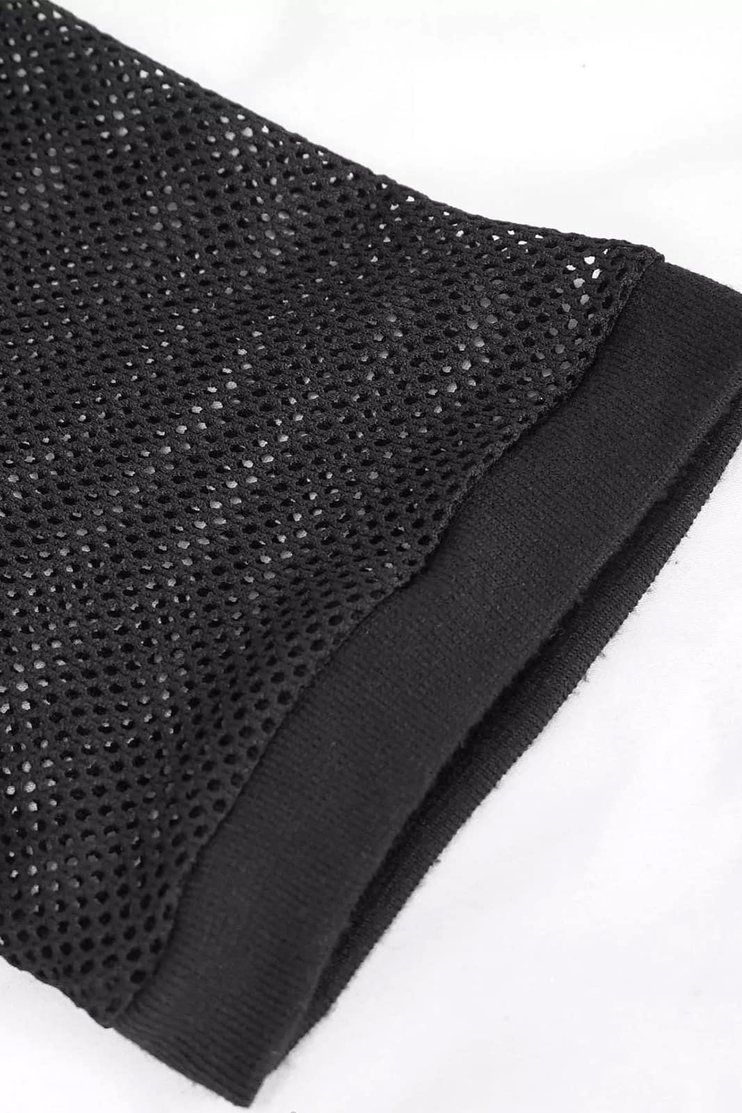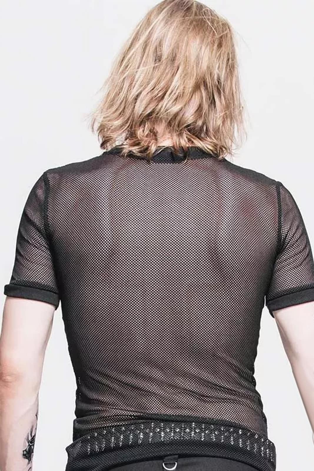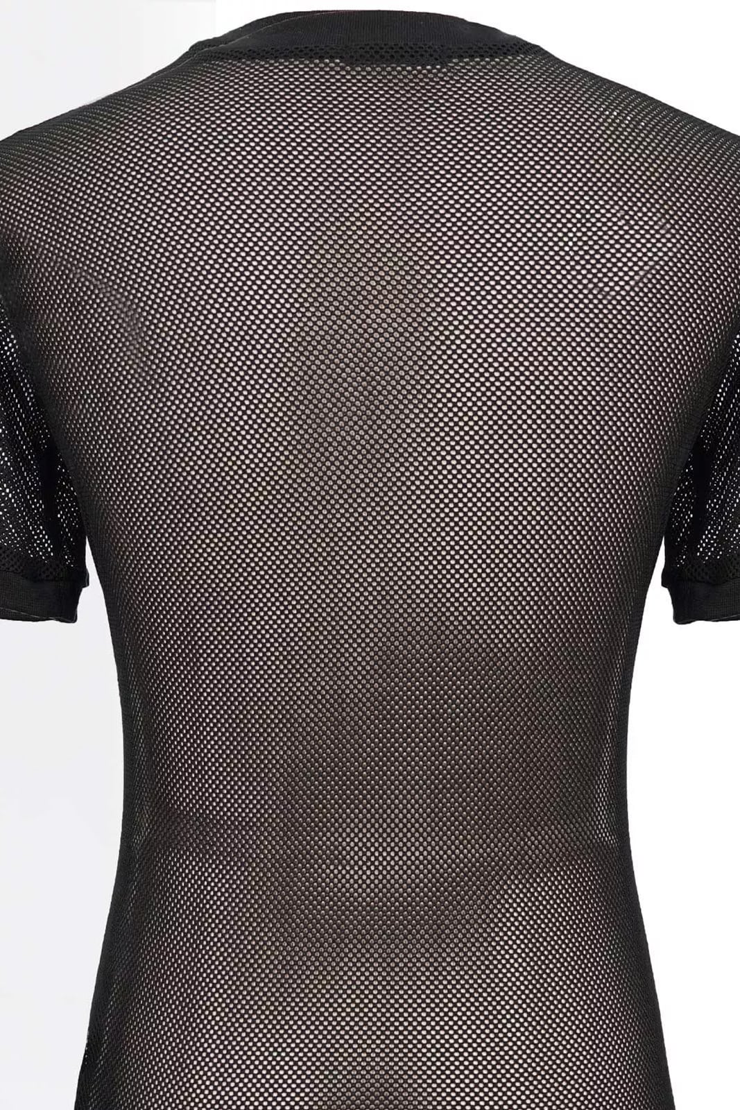 Kurzäremliges schwarzes Netz-Top für Herren das Solo oder in Kombination zum Schichten getragen werden kann. Mit seinen kurzen Ärmeln und dem Rundhalsausschnitt passt es zu allem und Jedem.