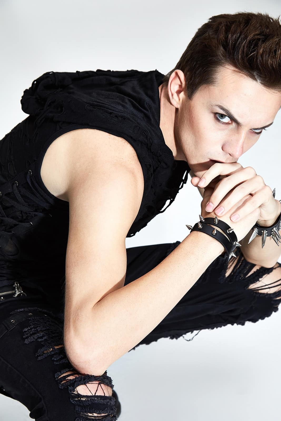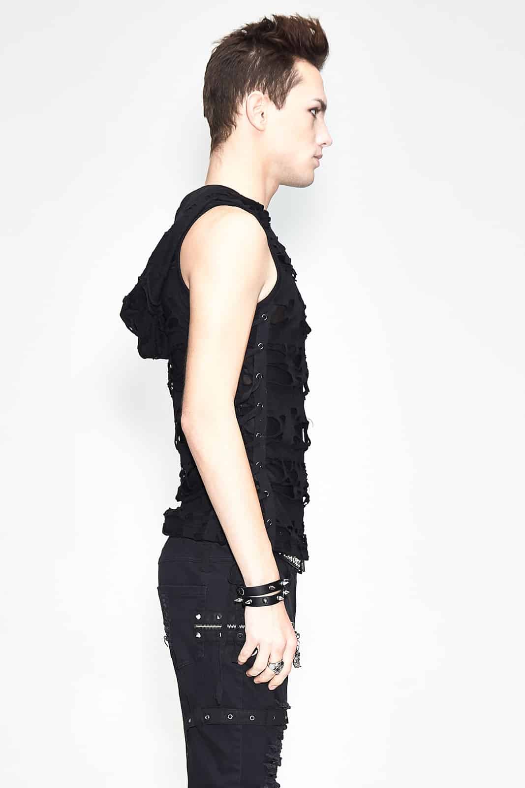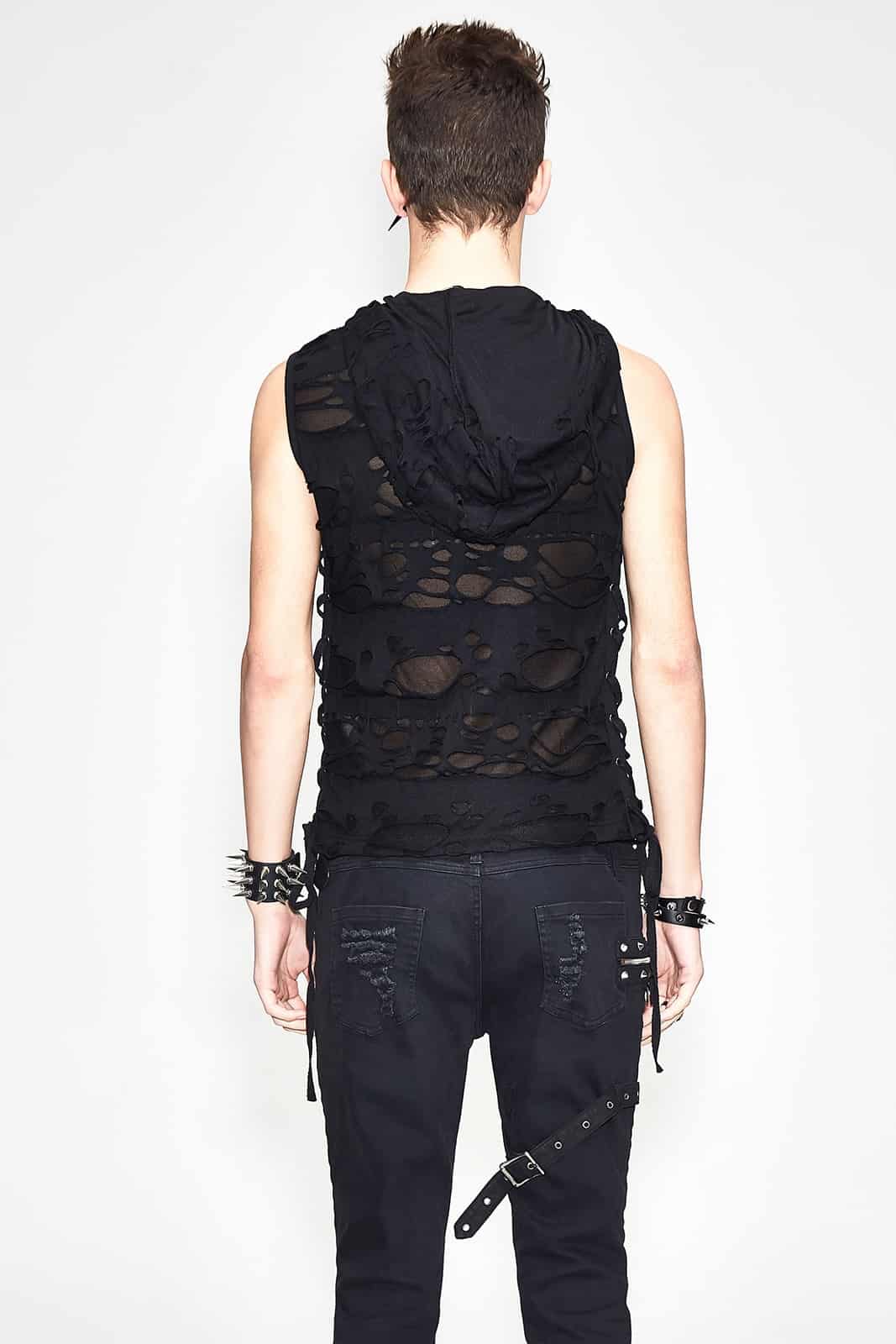 Entdecke eine Mischung aus kernigem Stil und modernem Flair mit dem ärmellosen Cutthroat-Shirt. Dieses Kleidungsstück ist ein Beispiel für eine mutige Herangehensweise an Mode, bei der rohe Kanten auf modernes Design in einer Symphonie der Rebellion treffen.