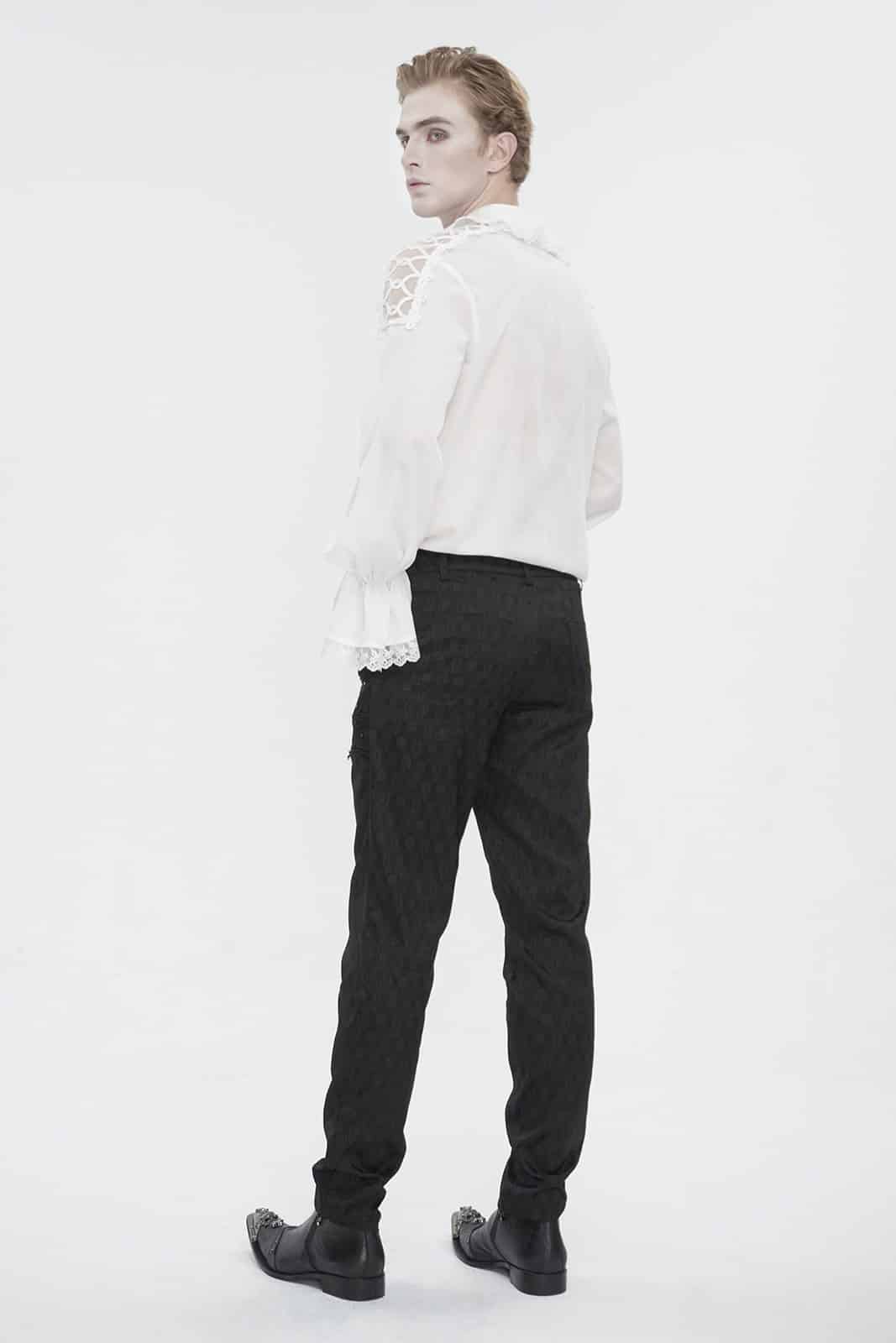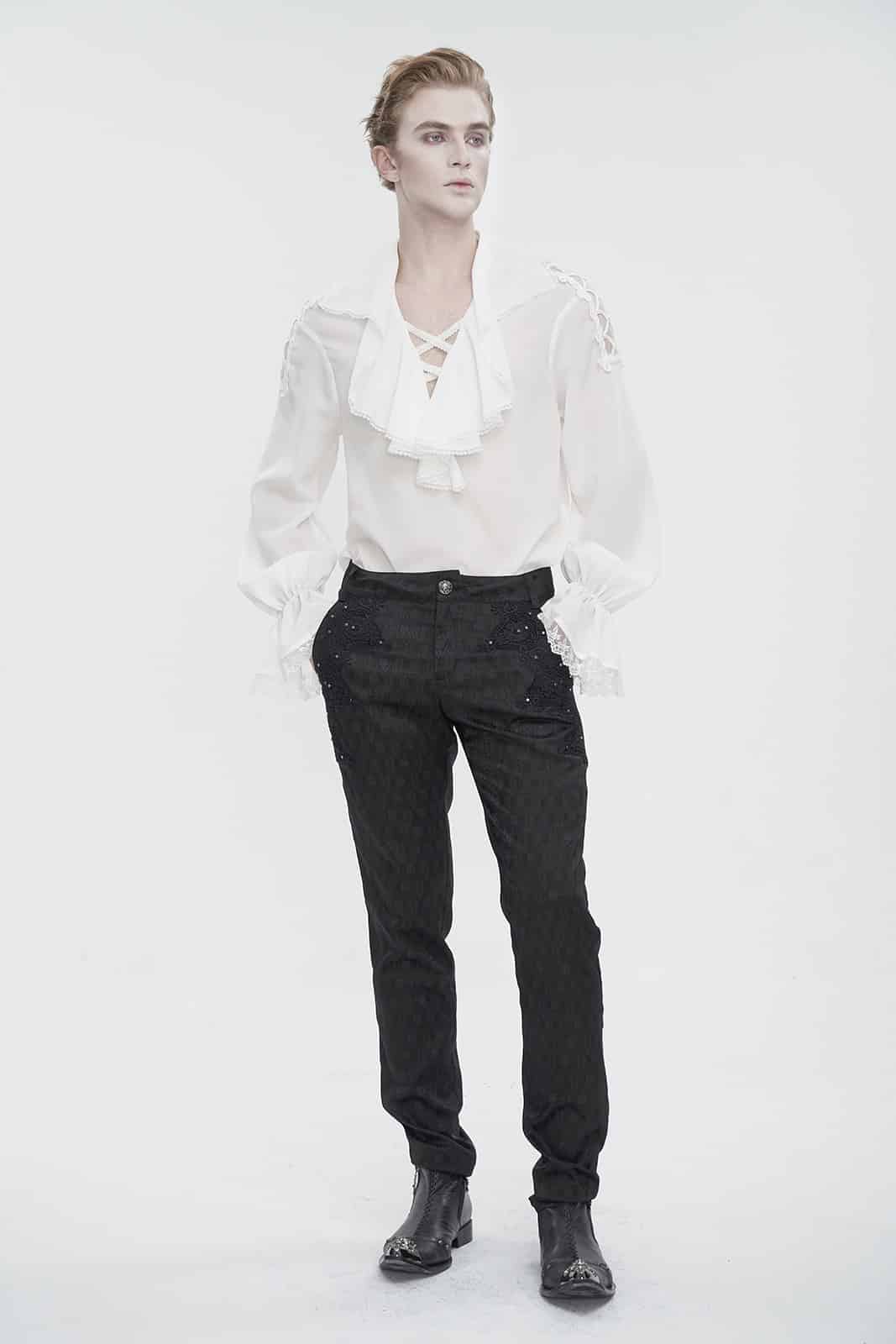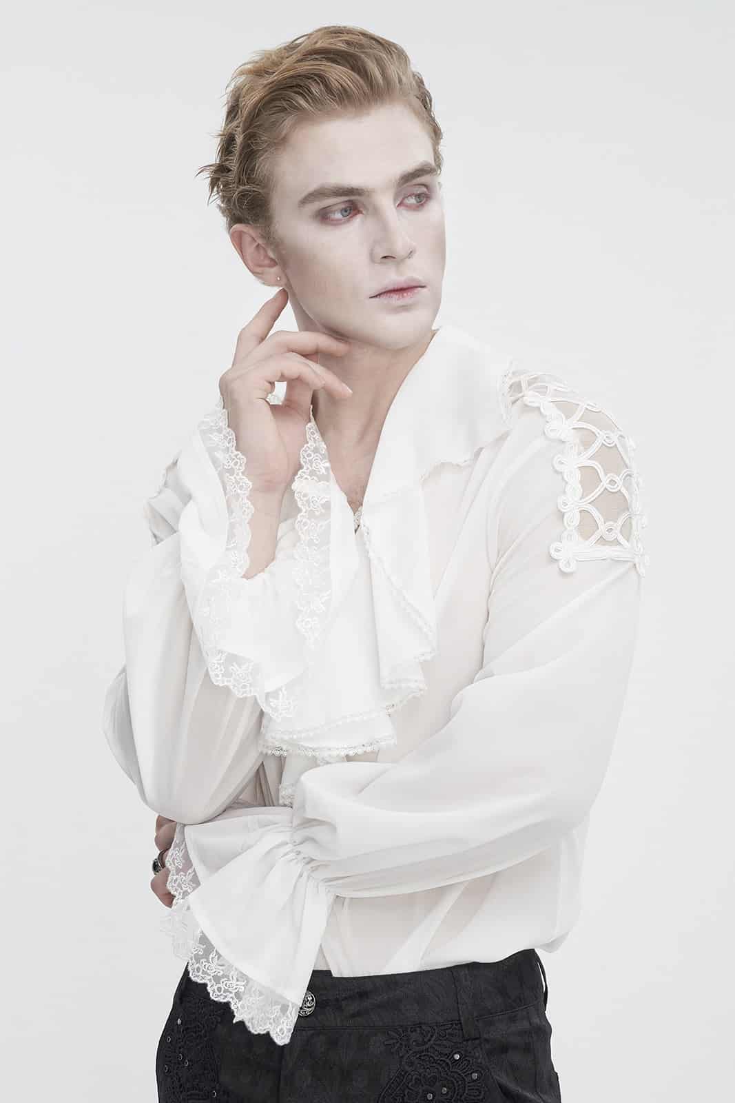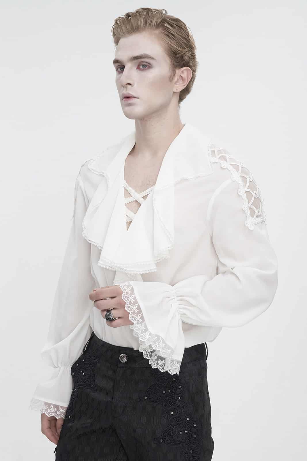 Romantic pirate-style shirt with long sleeves and a V-neckline. The extravagant neckline is decorated with lace details and ruffles. There are transparent mesh inserts on the shoulders. The collar has a drawstring and can be adjusted to personal preference.