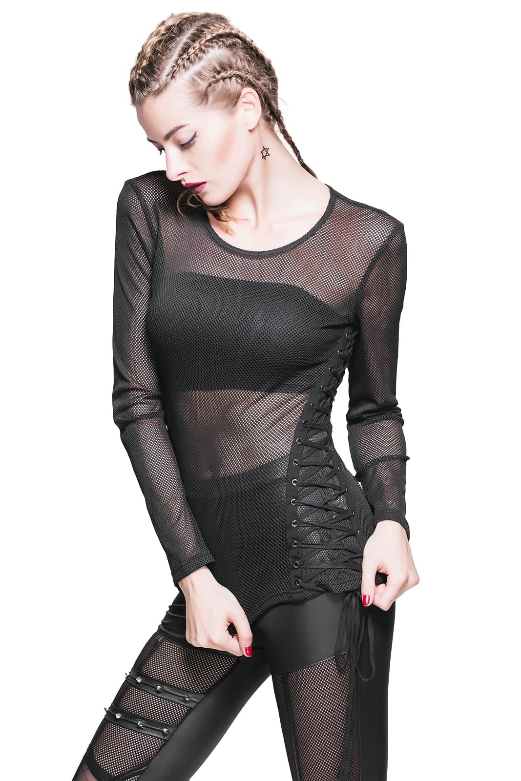 Das Traumtänzer Top von Devil Fashion ist ein vielseitiges Essential für düstere, alternative Looks. Das transparente Mesh-Material, die figurbetonte Passform und die seitliche Schnürung machen dieses unisex Longsleeve zu einem markanten Layering-Piece für Club, Bühne oder Alltag.