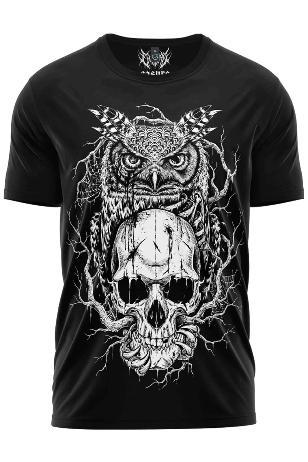 Dunkle Symbolik trifft auf klare Präsenz: Das „Skull Owl“ Shirt vereint eine eindringliche Eule mit einem Totenschädel zu einem kraftvollen Gothic-Motiv. Die stechenden Augen, verwachsene Äste und feine Details erzeugen eine mystische, leicht bedrohliche Atmosphäre mit starkem Wiedererkennungswert.