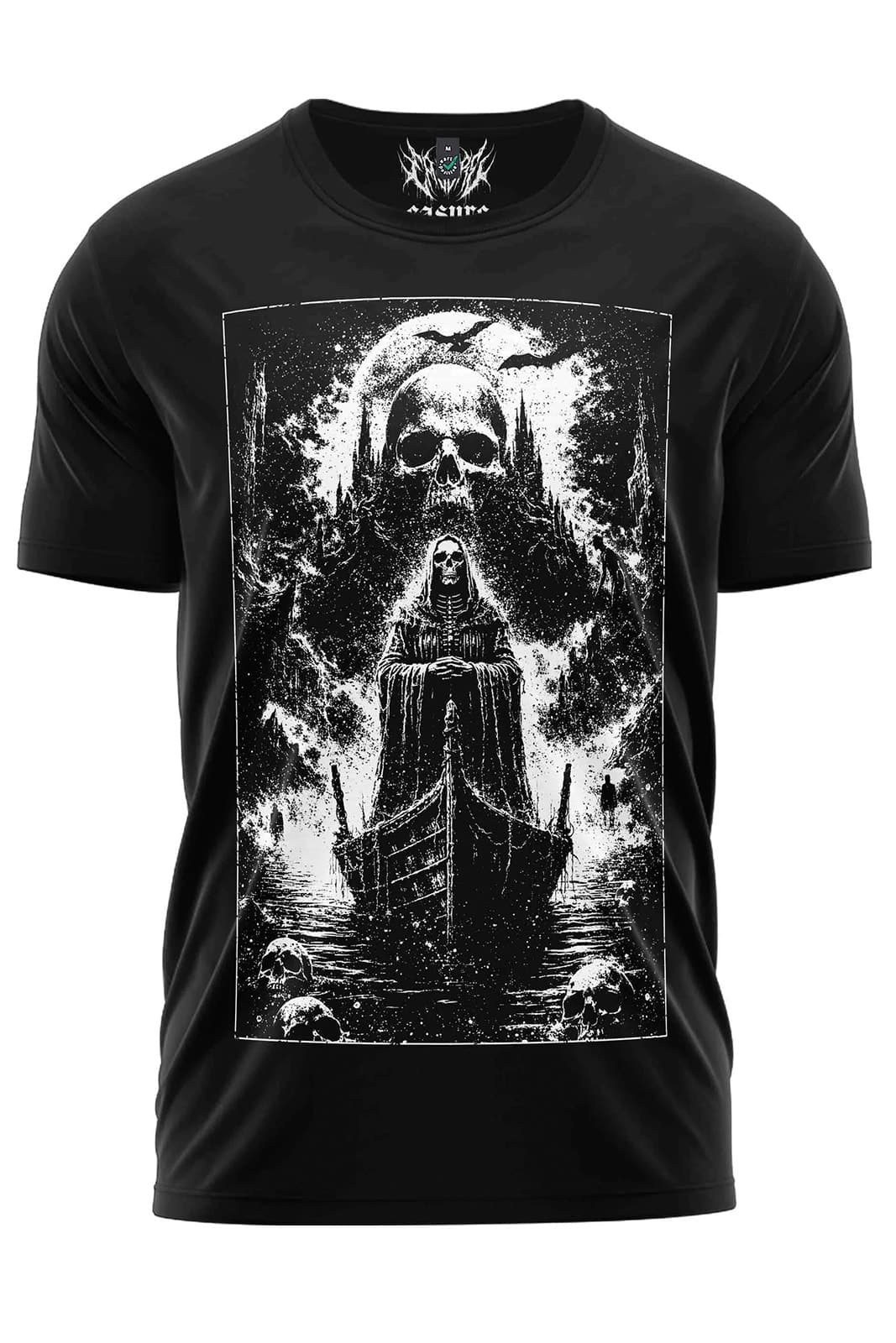 Markantes Gothic Printmotiv mit Fährmann und Totenschädeln