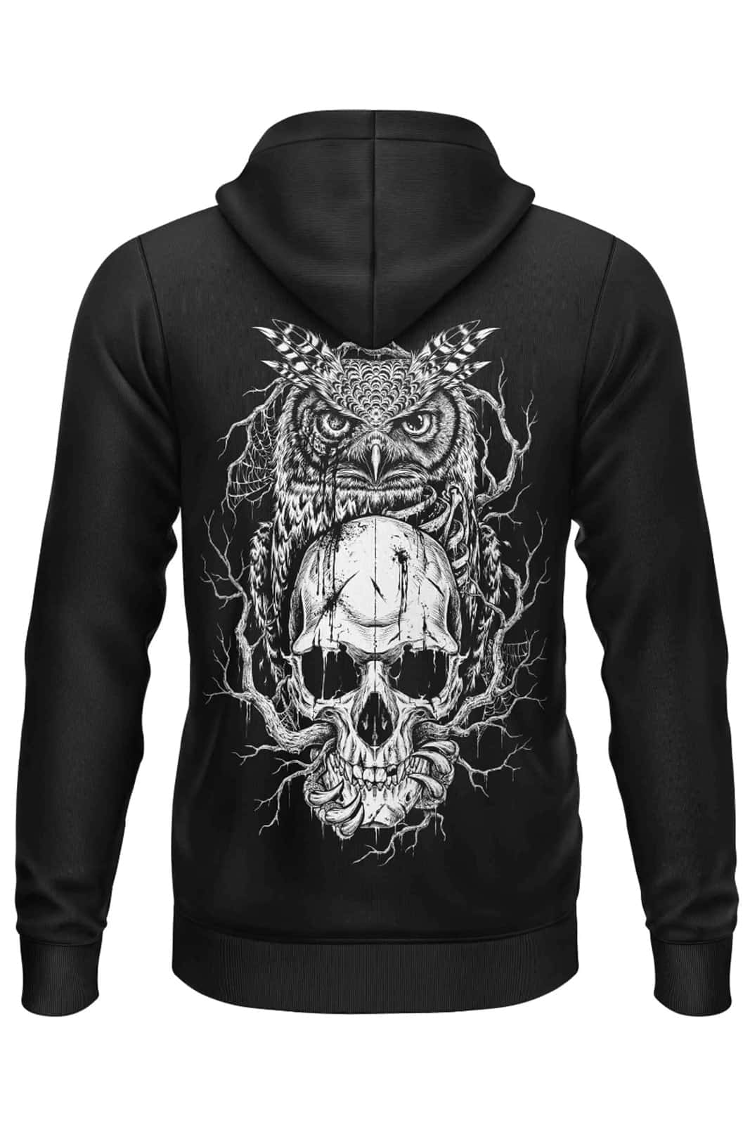 Kompromisslos dunkel und voller Symbolik: Der „Skull Owl“ Zipper kombiniert eine eindrucksvolle Totenkopf-Eule mit klarer Gothic-Ästhetik. Der große Backprint steht für Weisheit, Tod und Transformation und verleiht deinem Look eine starke, mystische Präsenz. Ergänzt wird das Design durch ein dezentes Frontlogo – minimalistisch und dennoch markant.