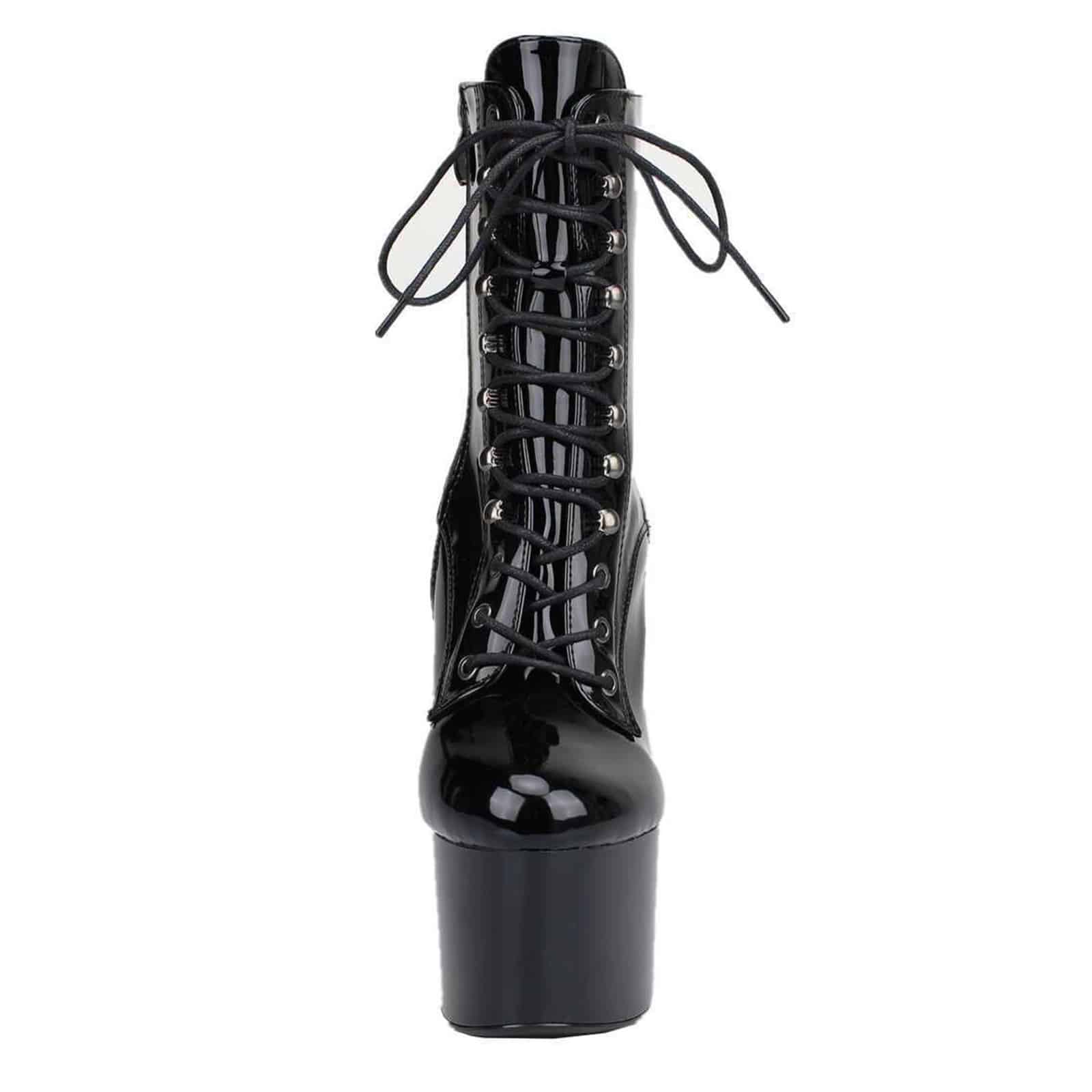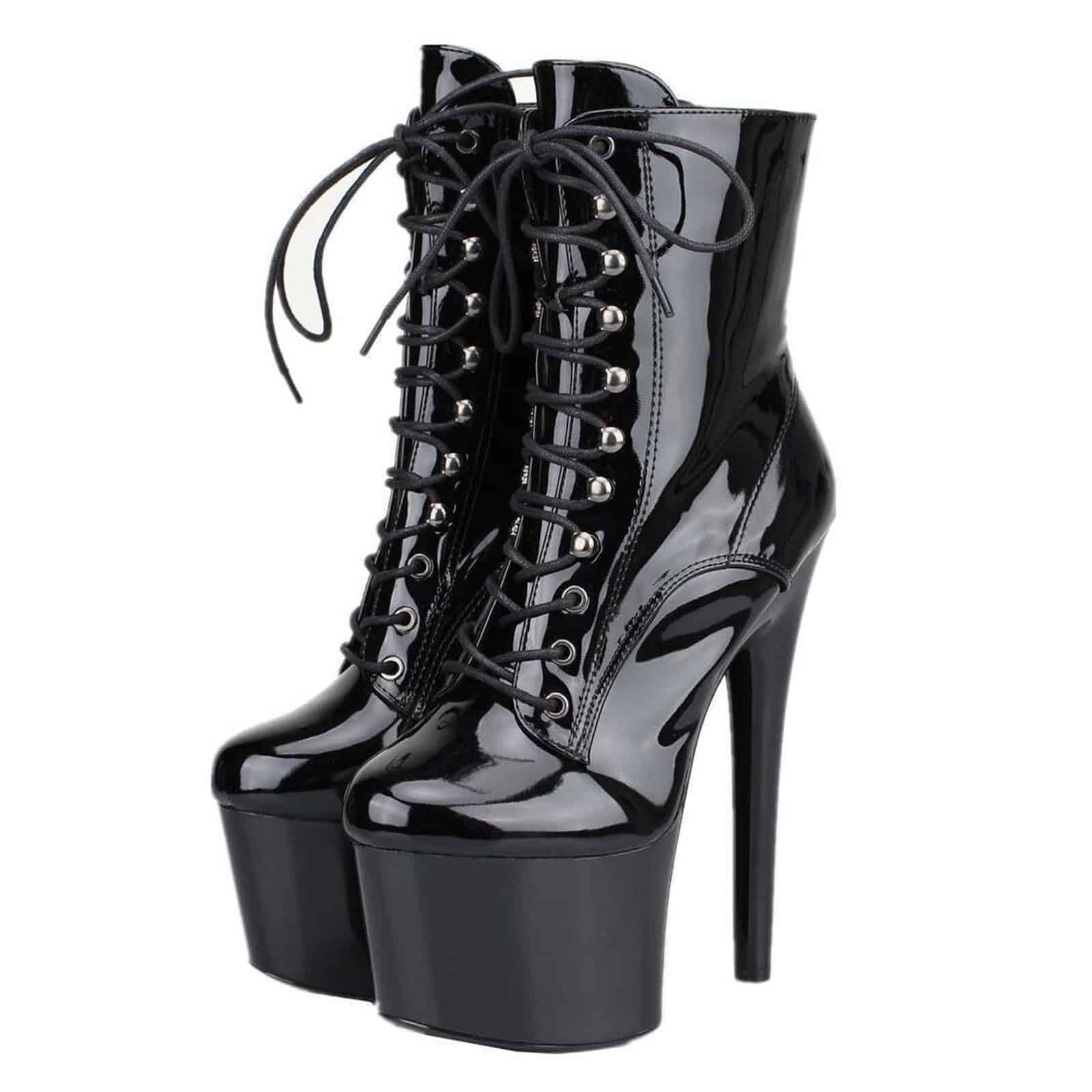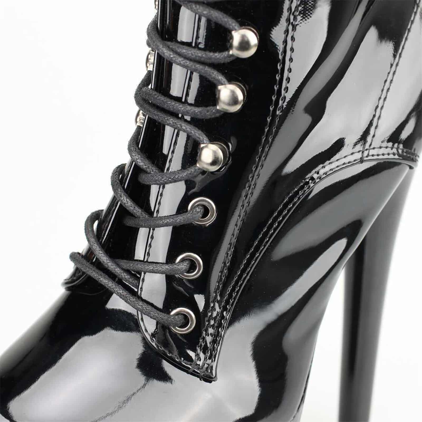Extravagante Lack-Stiefelette mit Obermaterial aus Polyurethan und hoher Plateausohle aus PVC. Komplett Vegan!