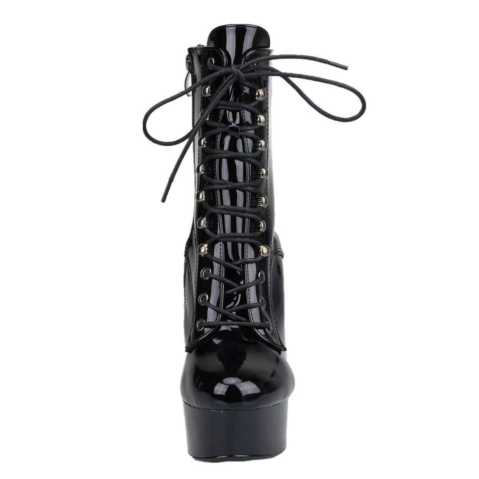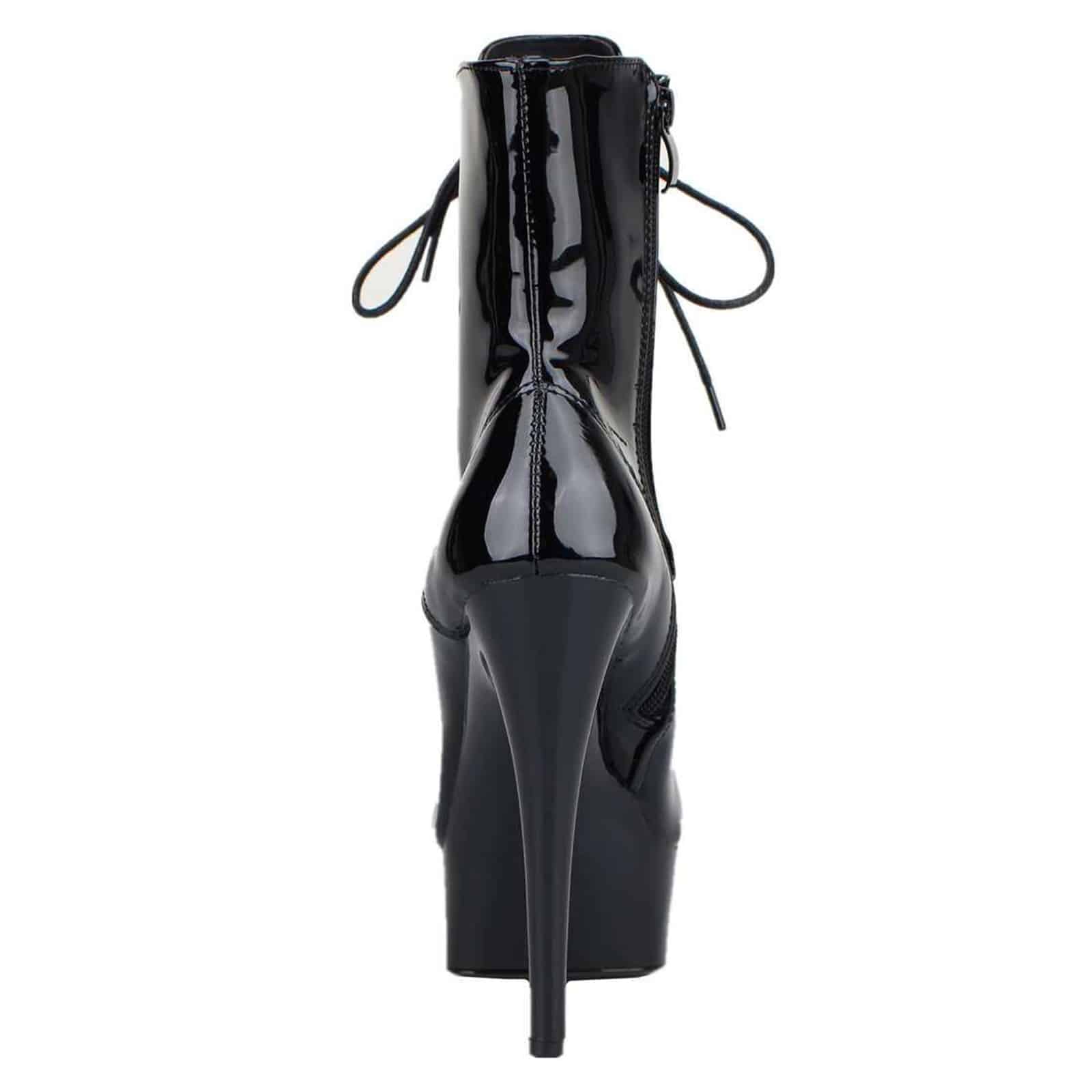Extravagant patent ankle boot with polyurethane upper and high platform PVC sole. Completely vegan!