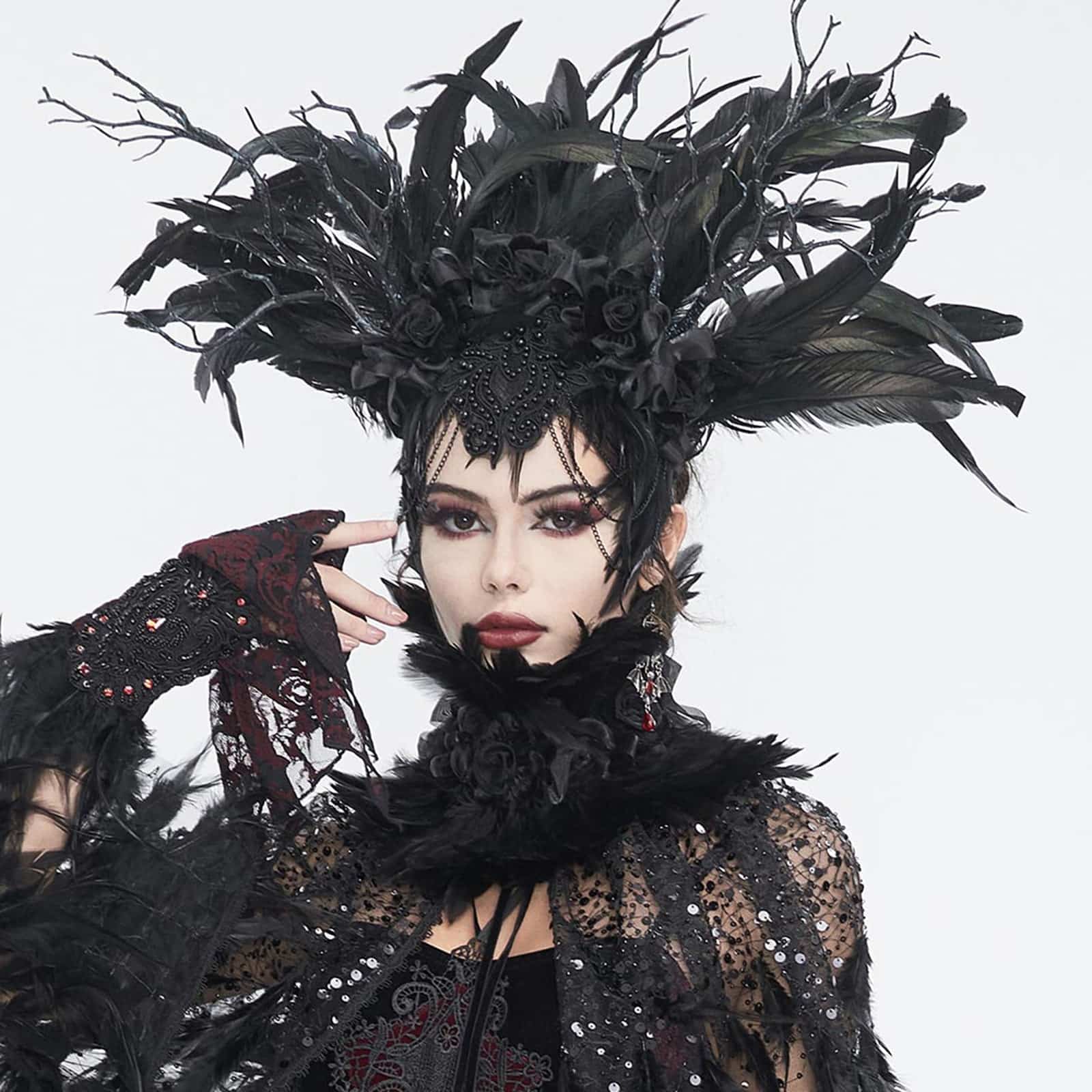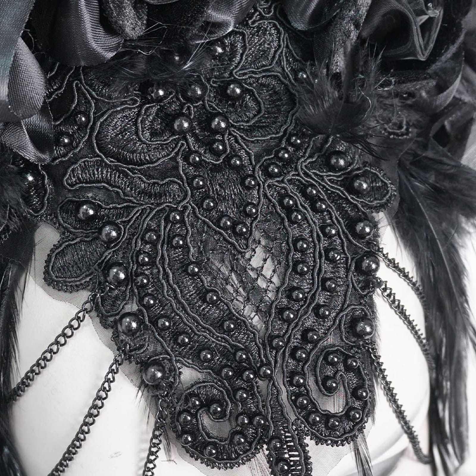 Ein dramatisches Kronendesign, das gotische Raffinesse verkörpert und einen Hauch königlicher Autorität vermittelt. Luxuriöse schwarze Federn mit einem schillernden grünen Schimmer erzeugen einen faszinierenden Effekt, wenn sie das Licht einfangen und einen Hauch von Magie verleihen. Anmutige Zweige, die mit einem zarten blauen Spritzermuster verziert sind, verflechten sich und weben eine Geschichte von ätherischer Schönheit und Geheimnis. Ein exquisites Mittelstück aus perlenbestickter Spitze schmückt die Stirn, detailliert mit hängenden Ketten, die einen Hauch von aufwendiger Eleganz und Bewegung verleihen. Satinbänder und Stoffblumen schmücken die Basis der Krone und verstärken ihre romantische und mystische Aura.