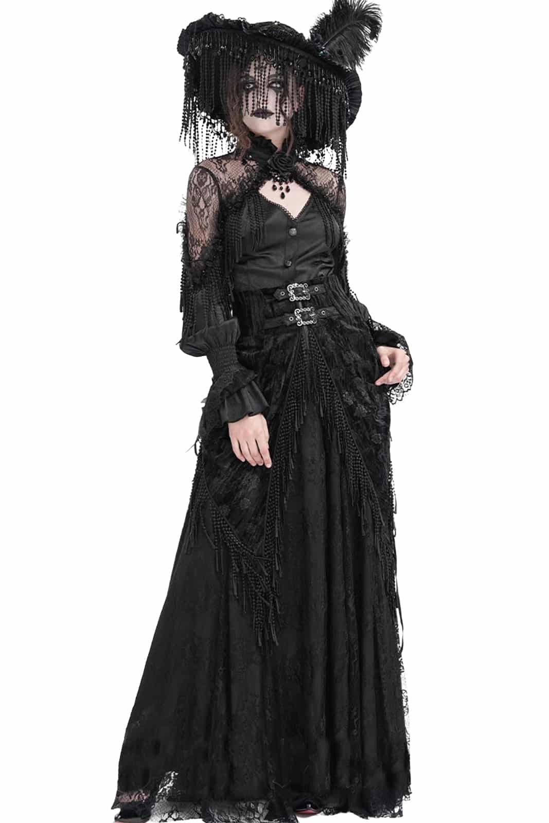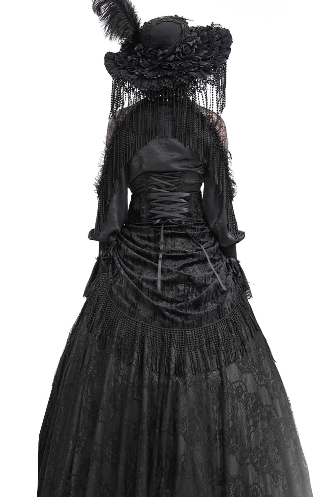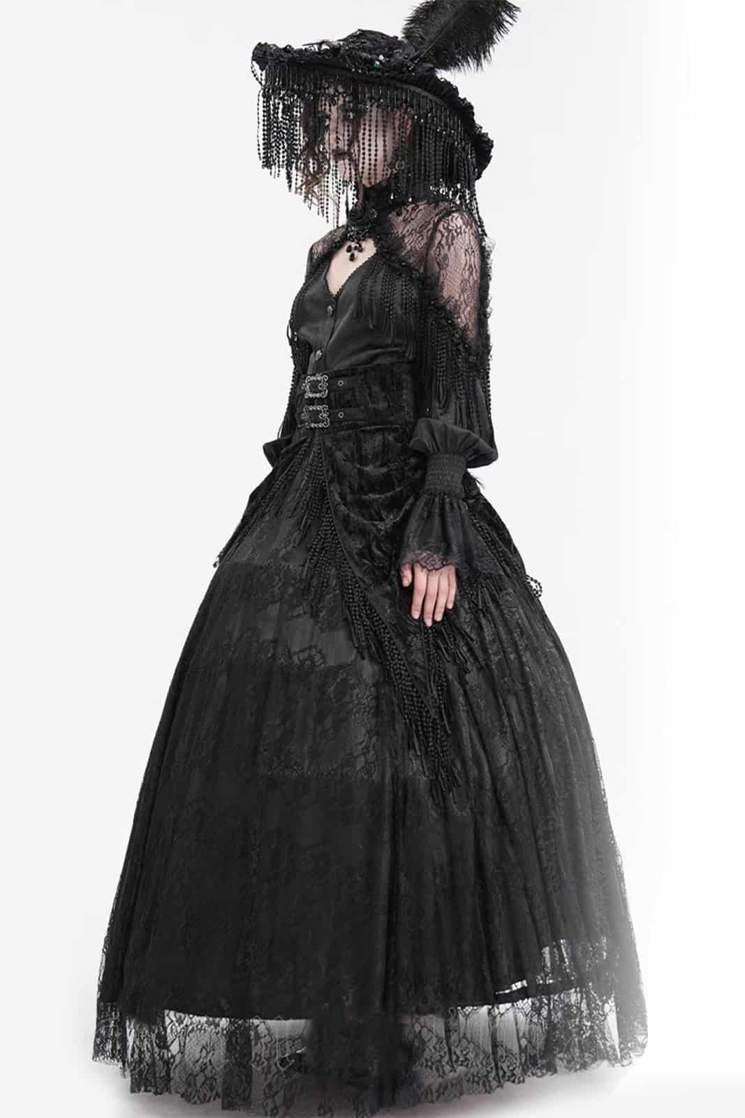 Ein Kleidungsstück wie aus einer dunklen Legende – fließend, geheimnisvoll und voller opulenter Details, die jede Bewegung in Szene setzen.