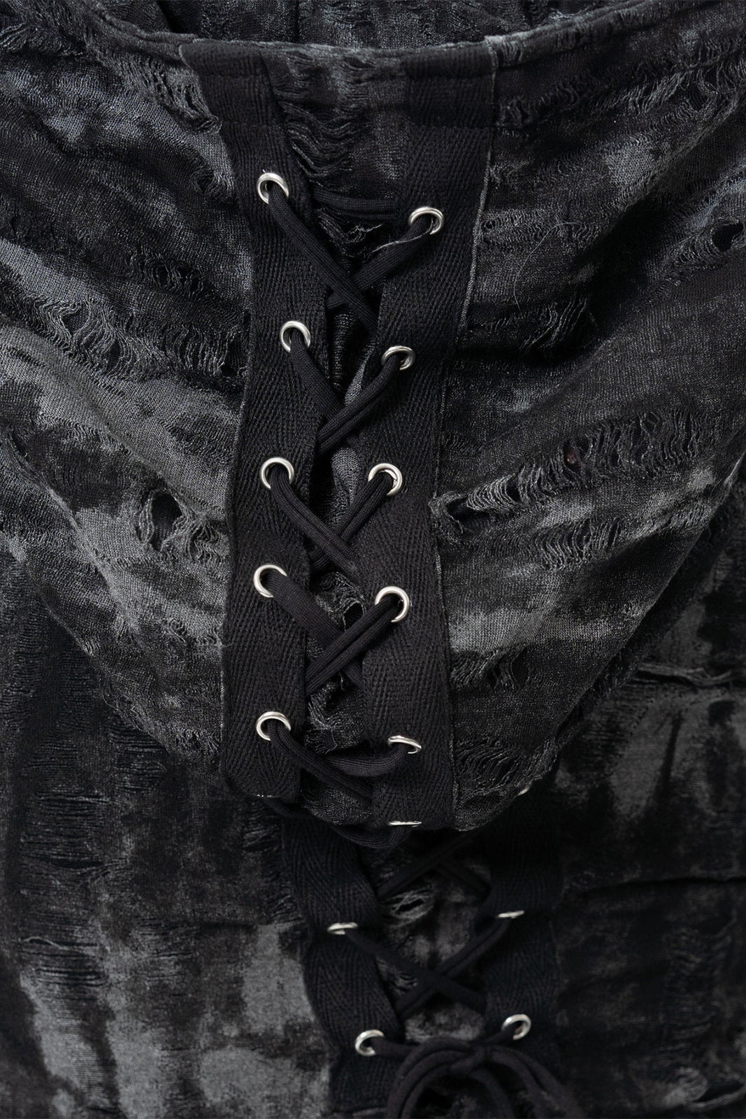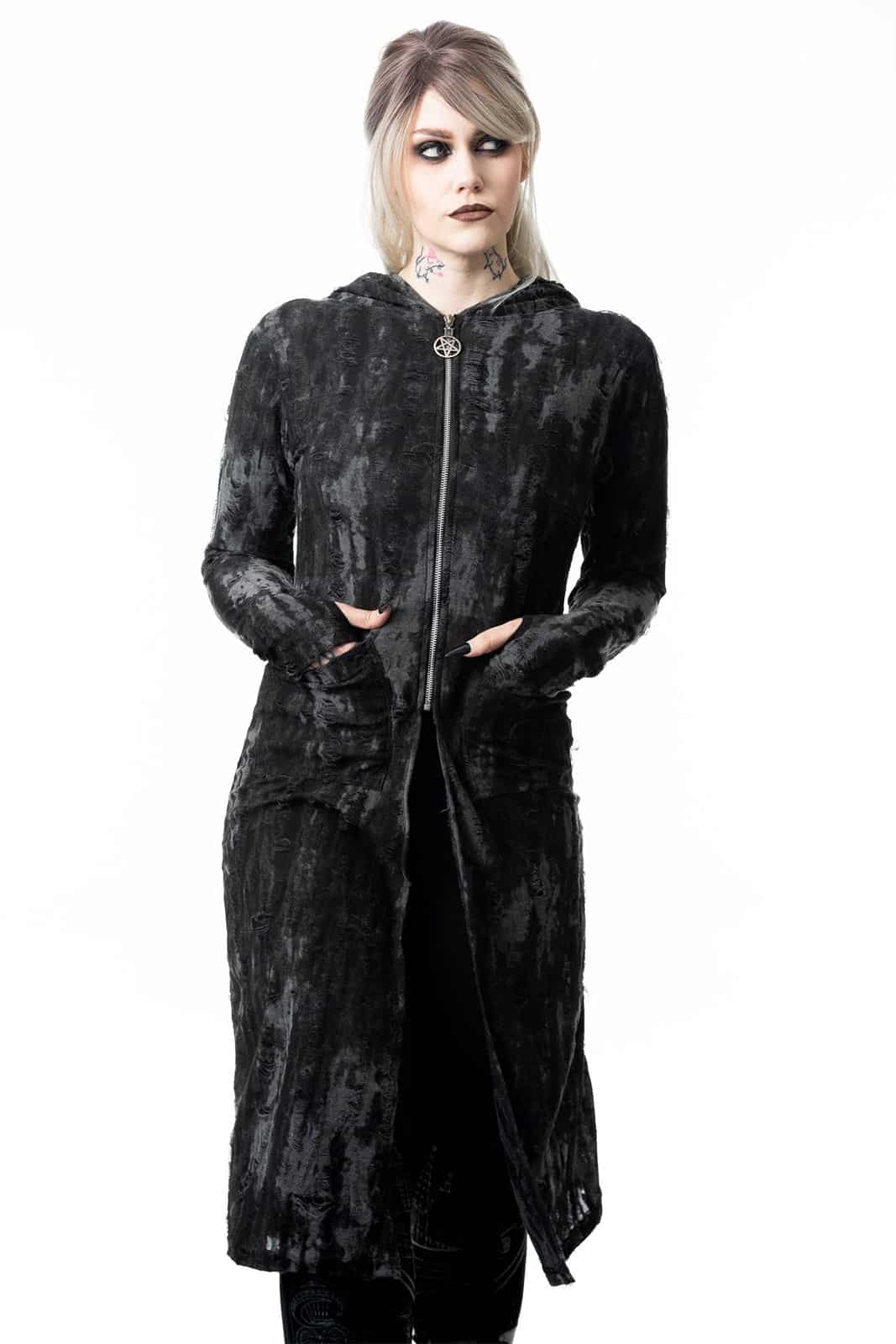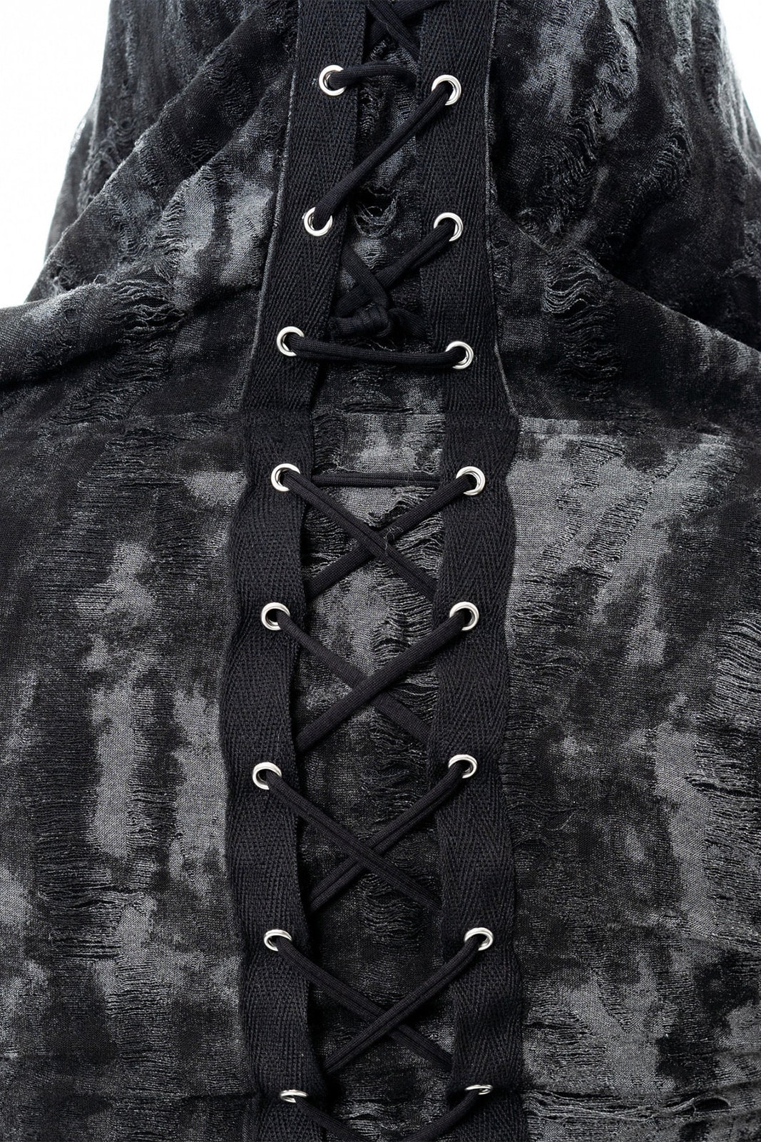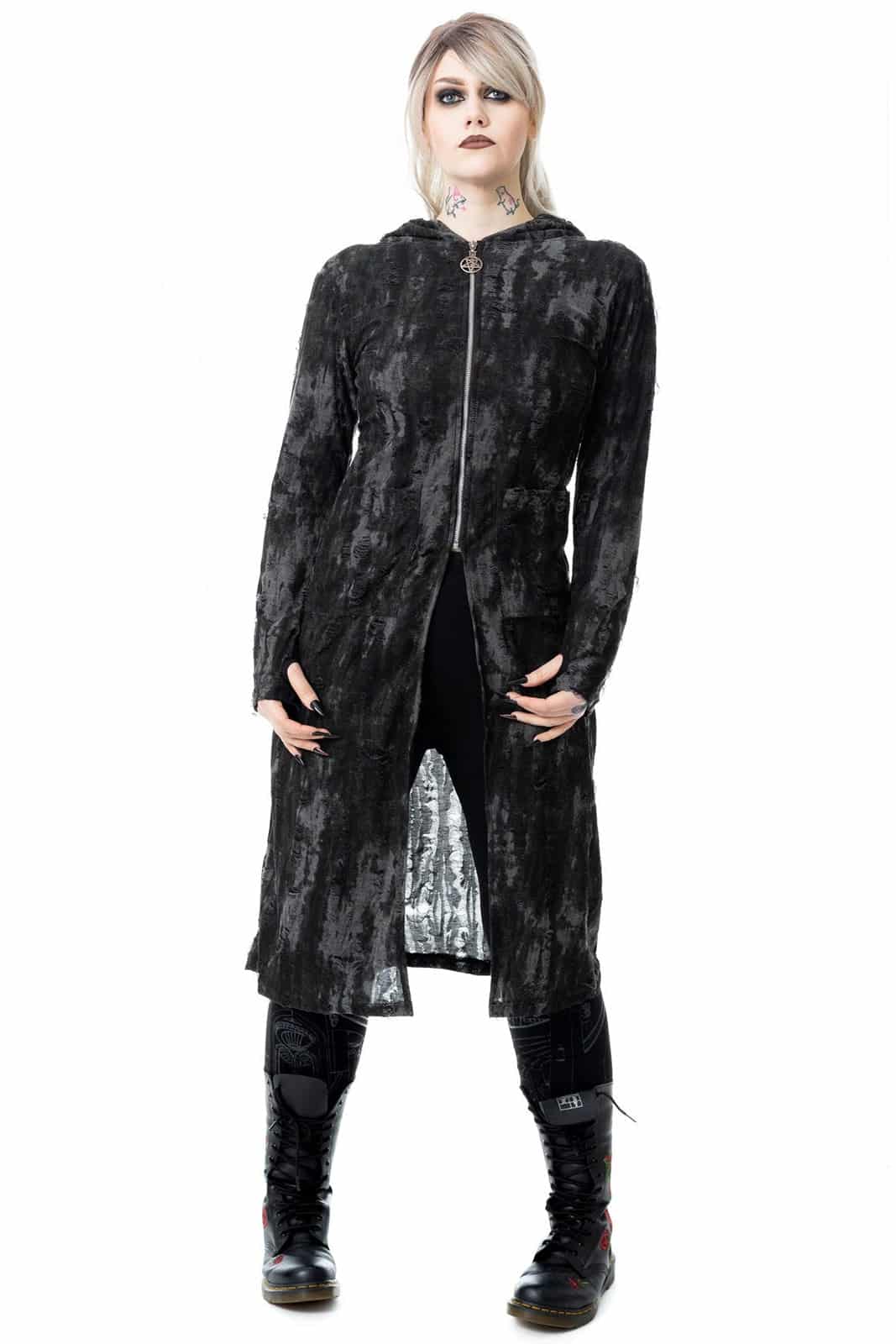 Dieser lange Cardigan im Used-Look verbindet düstere Eleganz mit markanter Struktur. Das schwarz-graue Muster wirkt wie verwittert und verleiht dem Design eine geheimnisvolle Tiefe. Die Kapuze und die dekorative Schnürung im Rücken setzen starke Gothic-Akzente, während der taillierte Schnitt eine schlanke Silhouette betont. Ein außergewöhnliches Layering-Piece für Darkwear- und Gothic-Outfits.