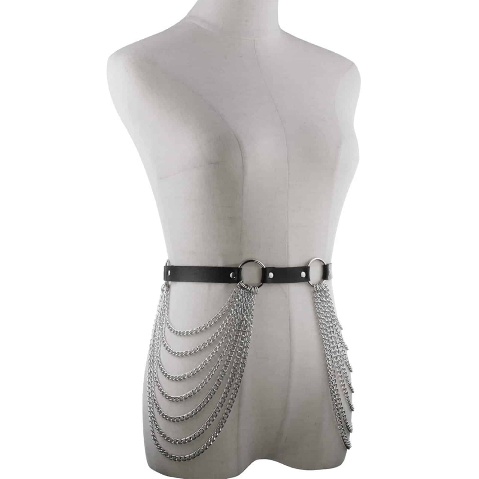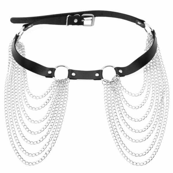 Hoch glänzender Gürtel aus Lackmaterial verziert mit silbernen Ketten. Im Rücken mit einer Schnalle zu schließen.