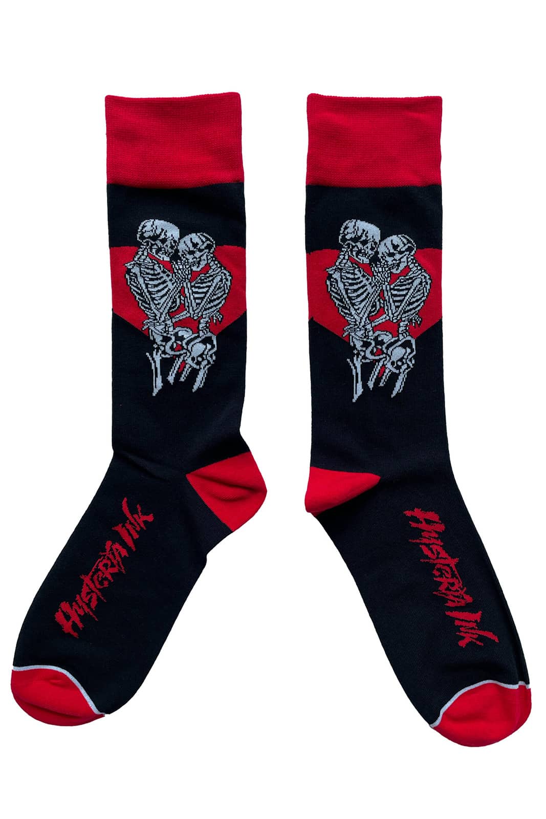 Dunkle Romantik trifft auf rebellische Attitude – die Amoureux Socken zeigen ein eindrucksvolles Motiv zweier Skelette vor einem roten Herz und verbinden Gothic-Ästhetik mit einem Hauch morbider Liebe. Ein perfektes Detail für alternative Outfits mit Charakter.